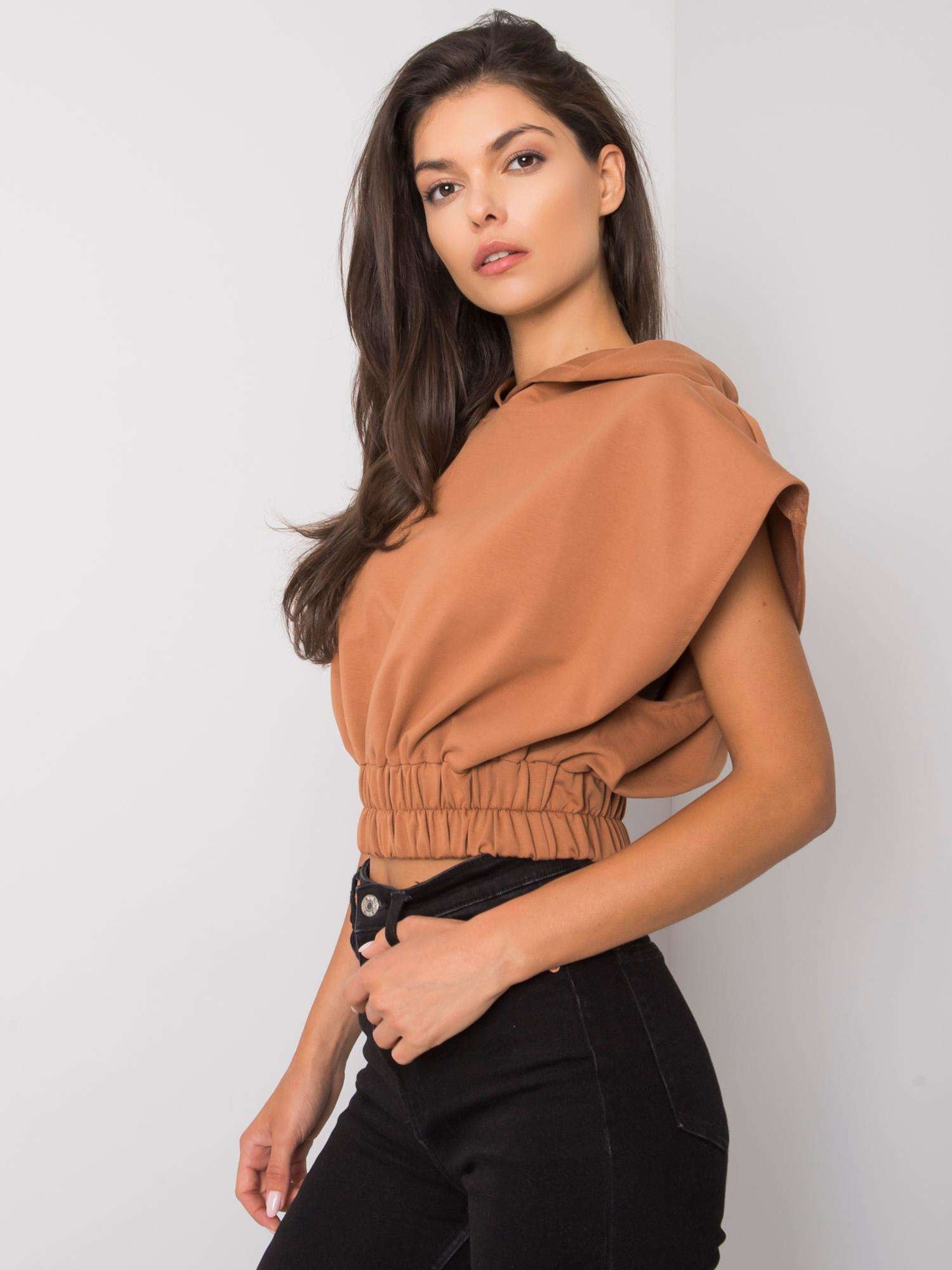 Jasnobrązowa krótka bluza z kapturem.