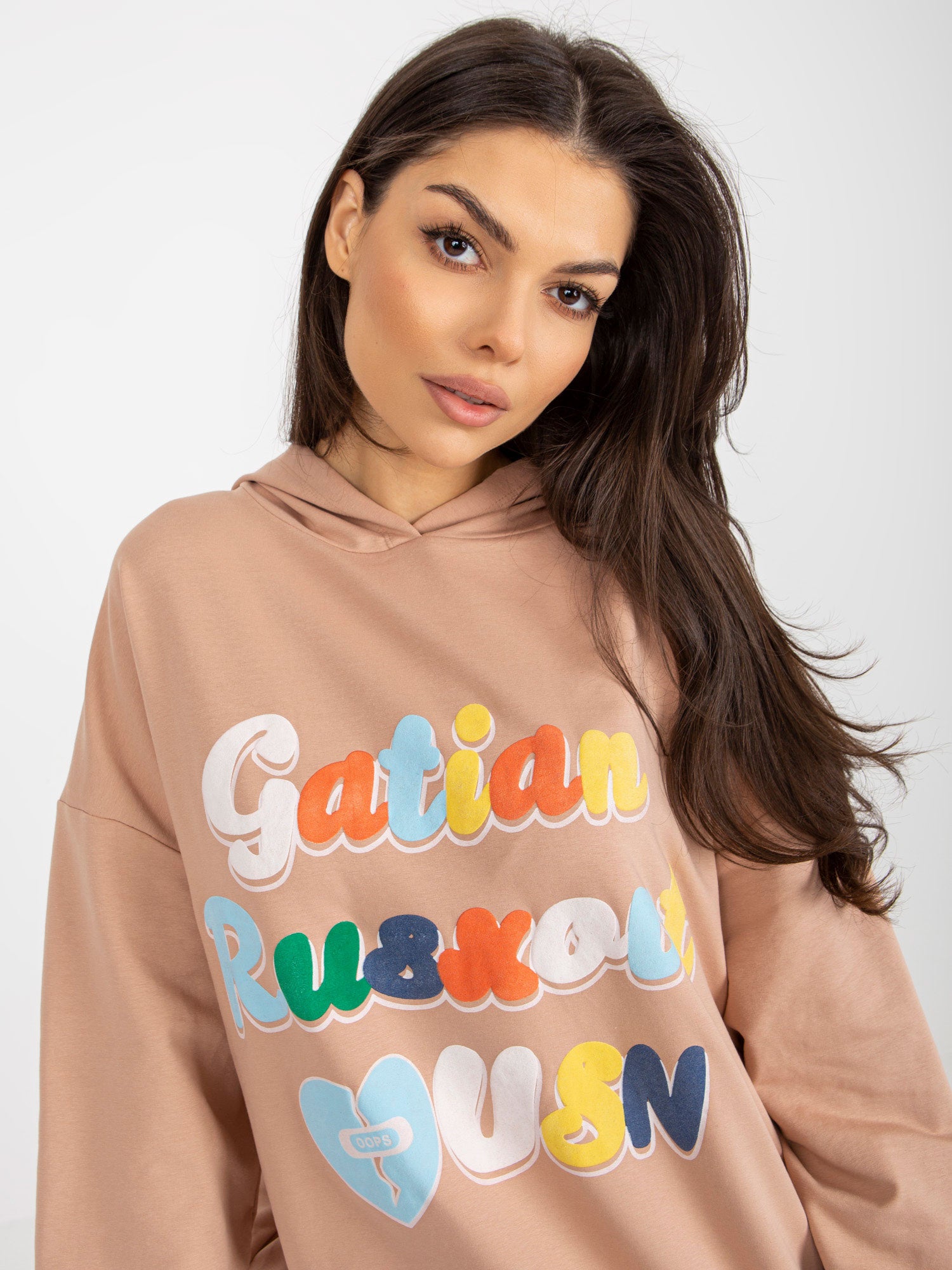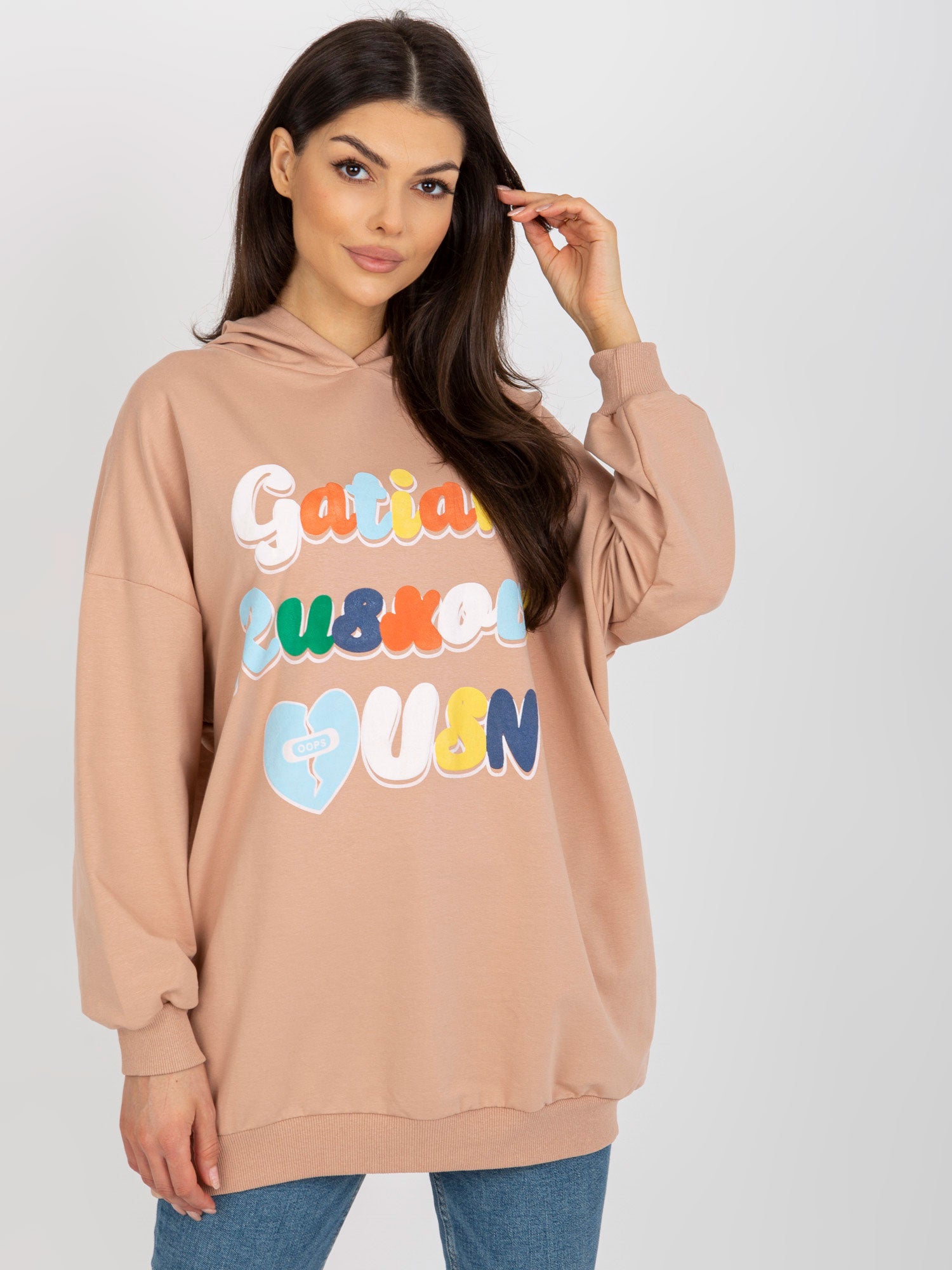 Camelowa oversize bluza z nadrukiem i kapturem .
