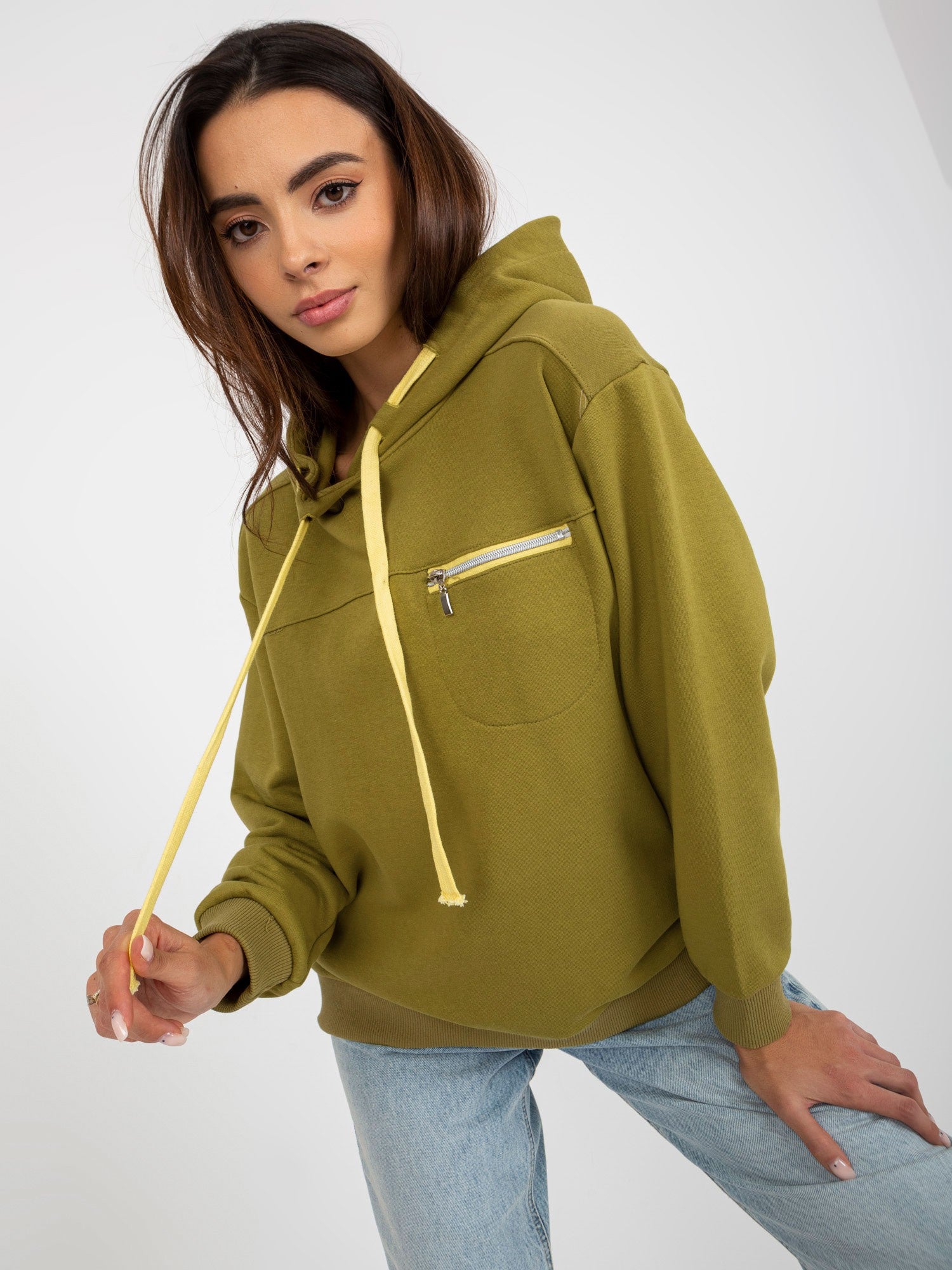 Oliwkowa dresowa bluza z kapturem i troczkami .