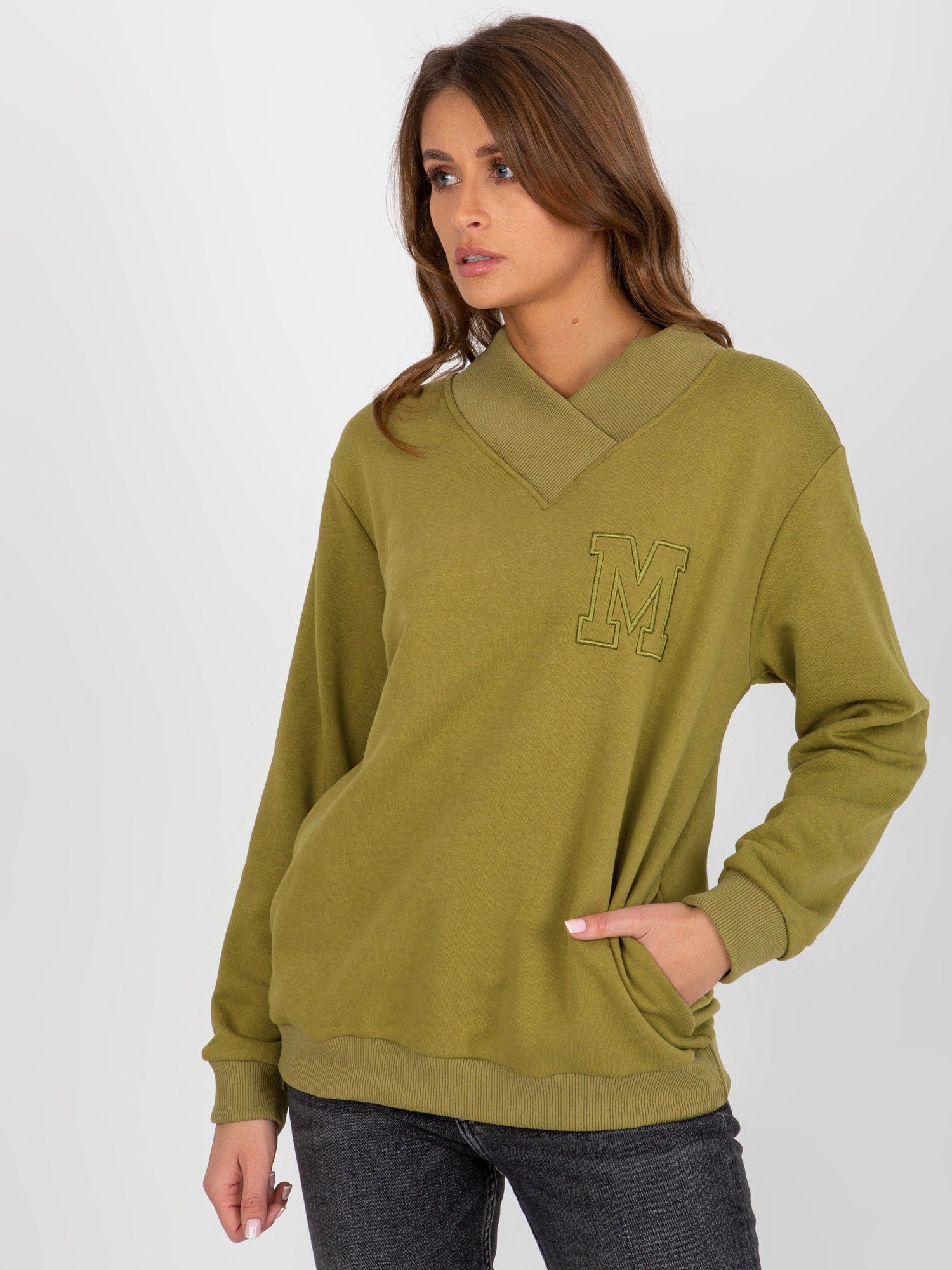 Oliwkowa damska bluza bez kaptura z trójkątnym dekoltem .
