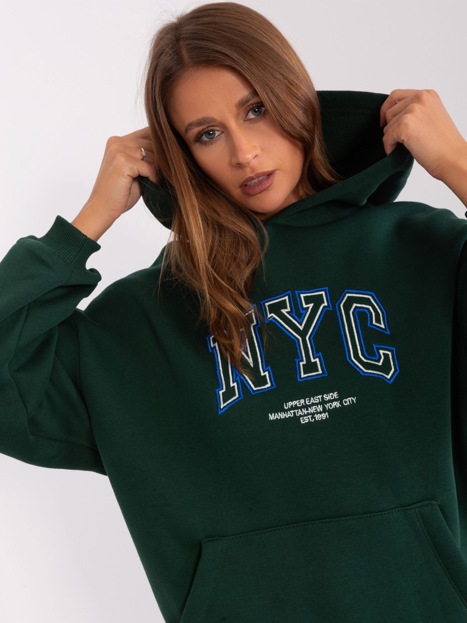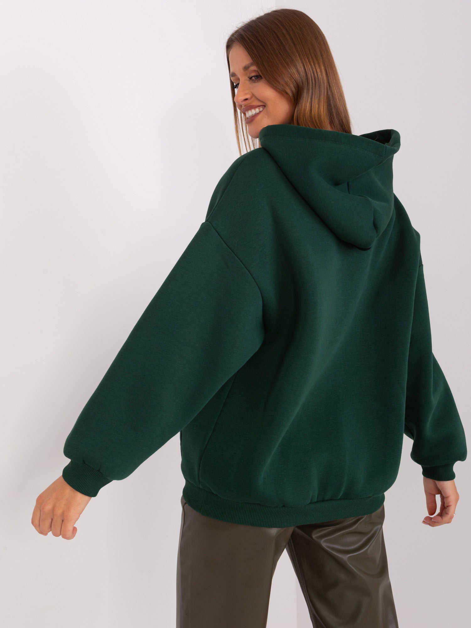 Ciemnozielona ocieplana bluza kangurka z kapturem.