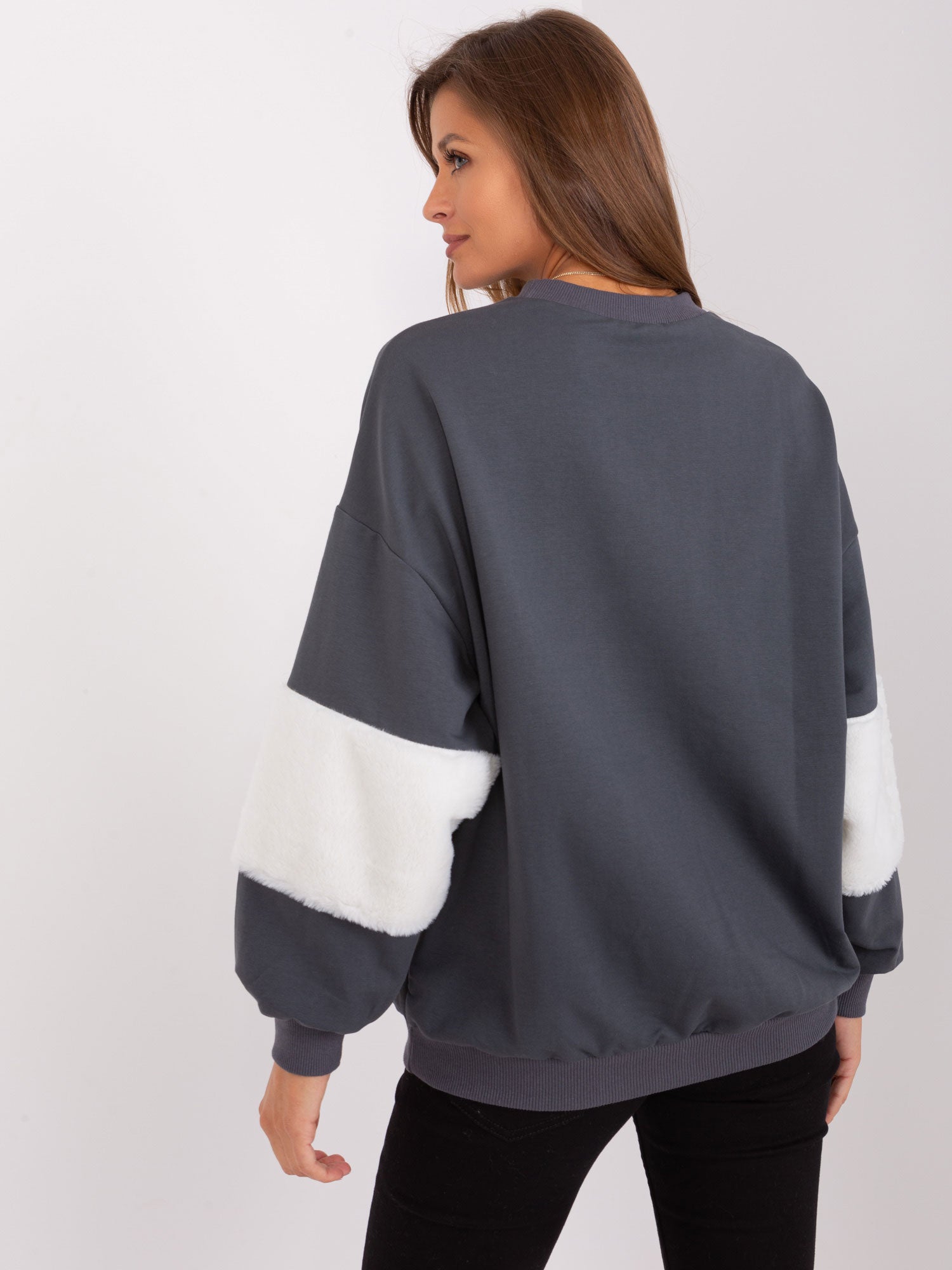 Grafitowa bluza bez kaptura z futrzanymi wstawkami.