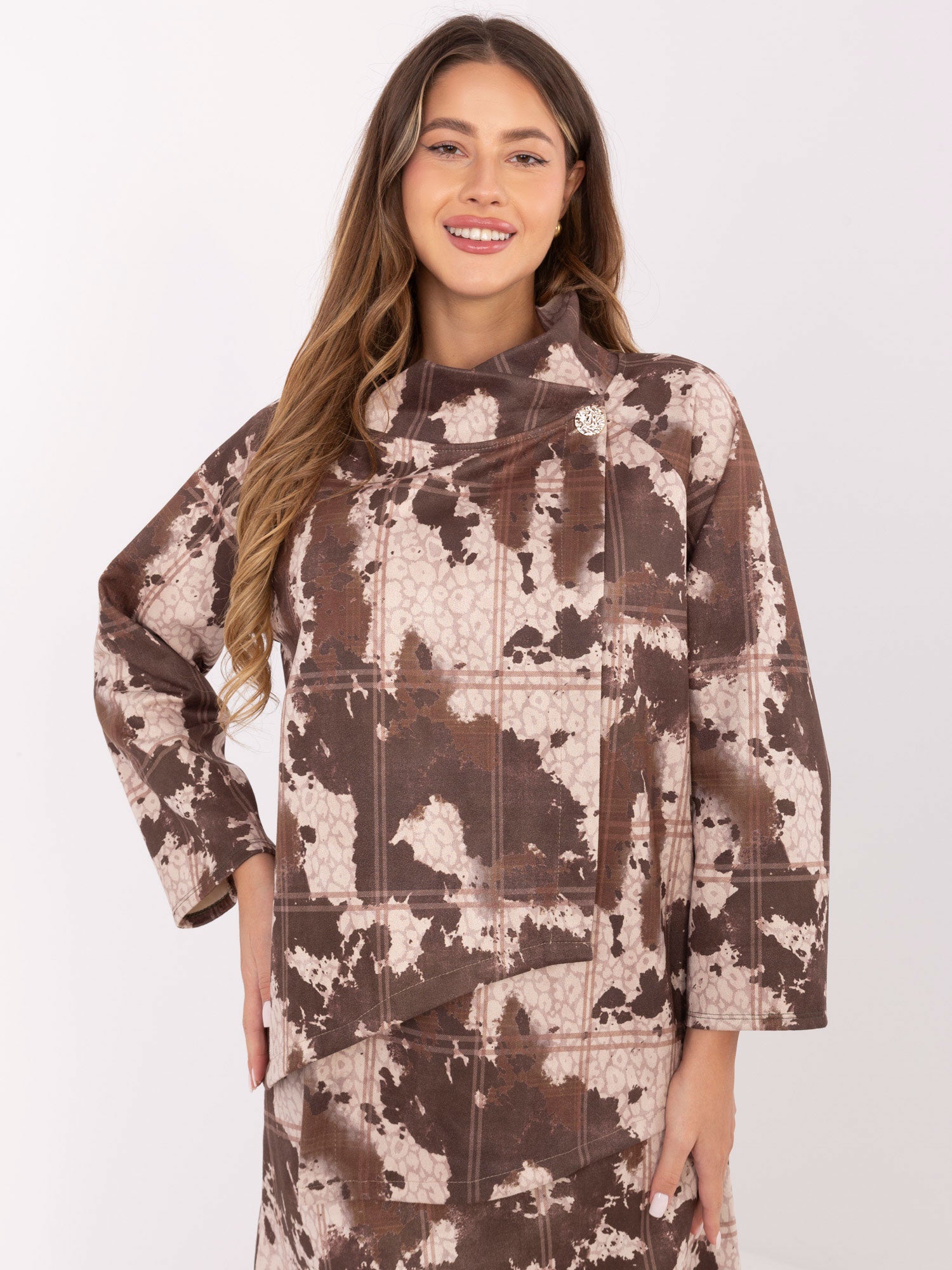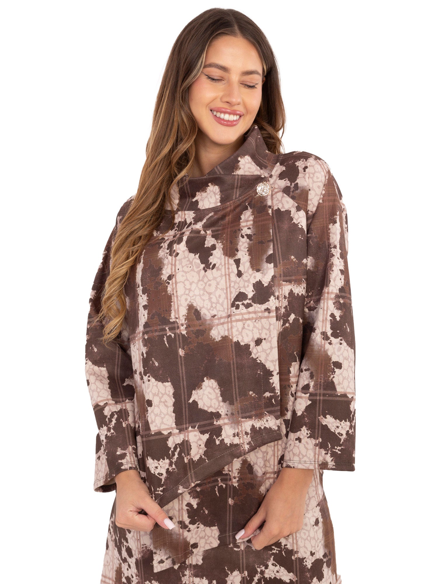 Wymiary narzutki w rozmiarze one size mierzone na płasko: szerokość pod pachami - 58 cm, długość rękawa - 60 cm (od szwu), szerokość w biodrach - 57 cm, długość całkowita - 76 cm (po prawej stronie), długość całkowita - 60 cm (po lewej stronie).