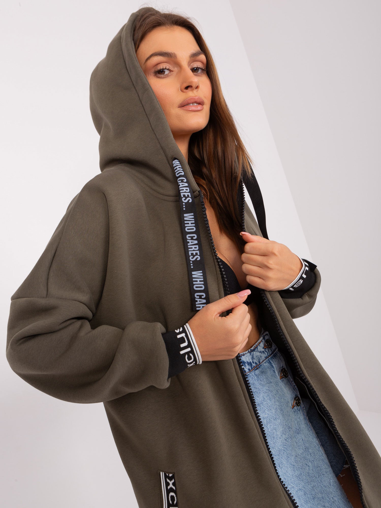 Wymiary bluzy w rozmiarze S/M mierzone na płasko: szerokość pod pachami - 70 cm, długość całkowita - 103 cm, długość rękawa - 63 cm.