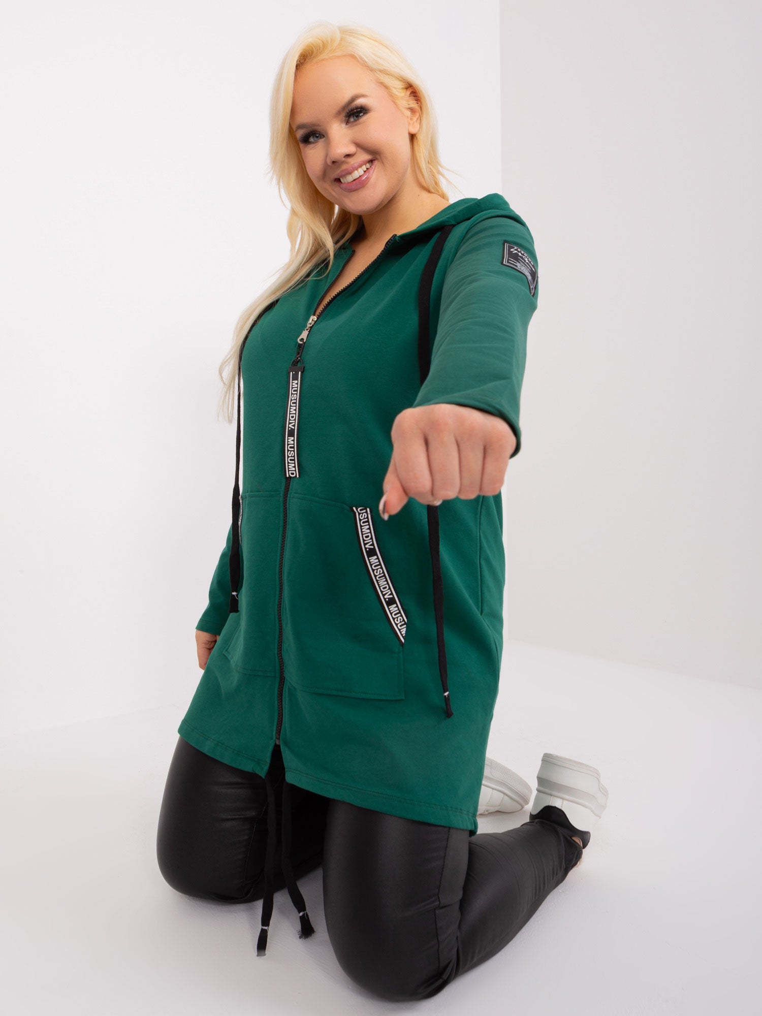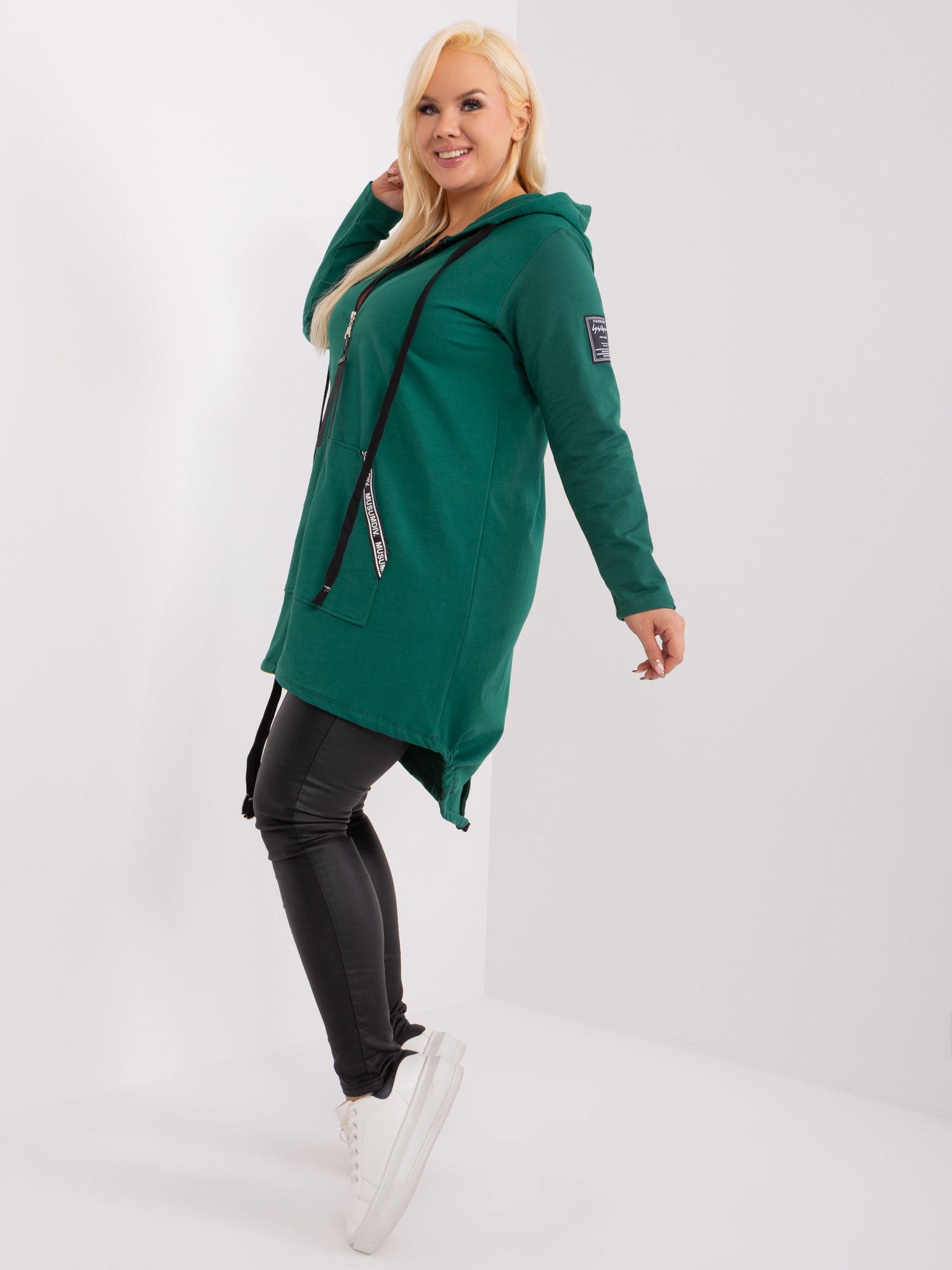 Modelka ma na sobie rozmiar one size. Wymiary modelki: wzrost 172 cm, biust 103 cm, talia 73 cm, biodra 103 cm.