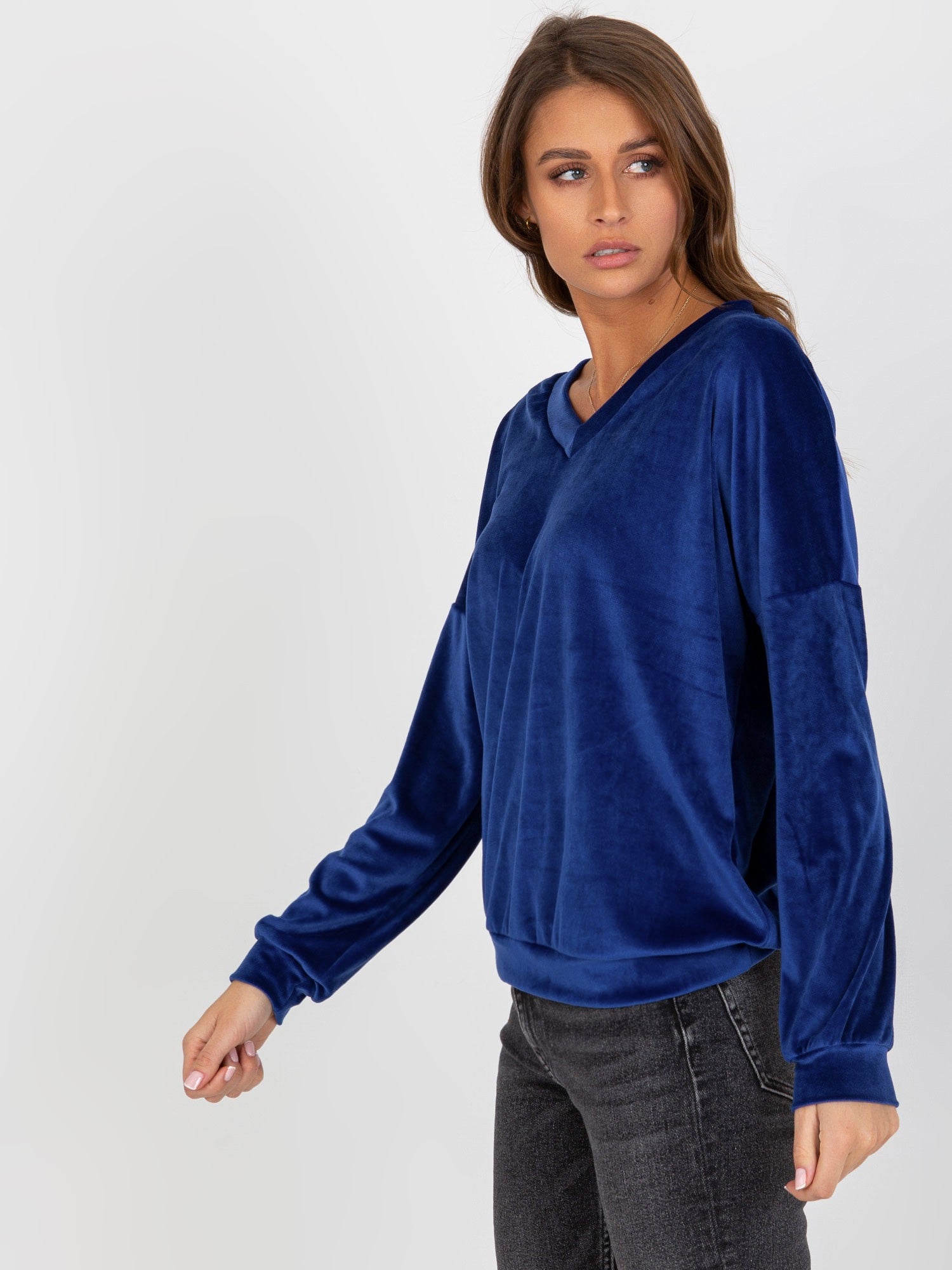Kobaltowa welurowa bluza bez kaptura z dekoltem w serek .
