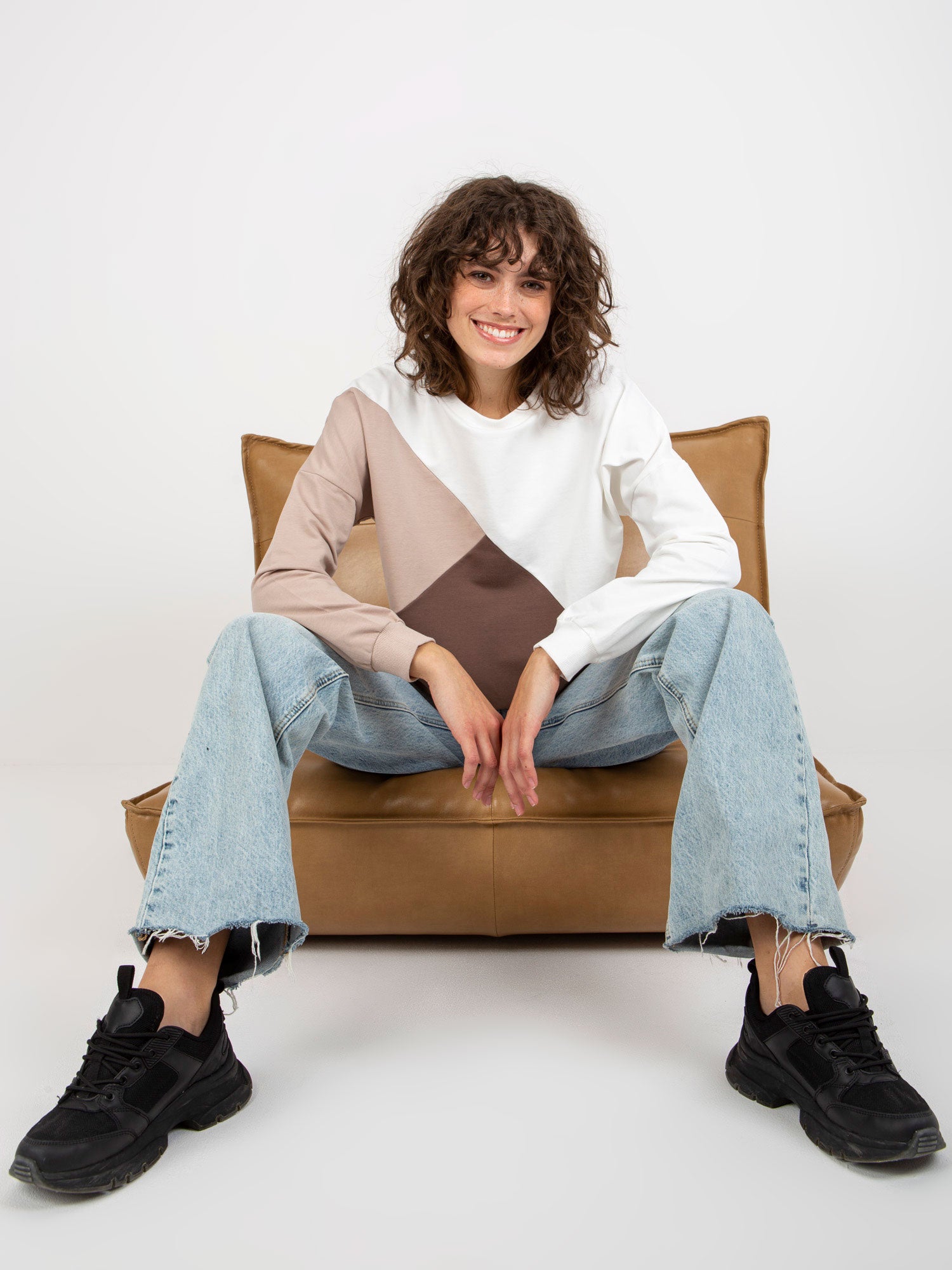 Biało-brązowa bawełniana bluza basic bez kaptura .