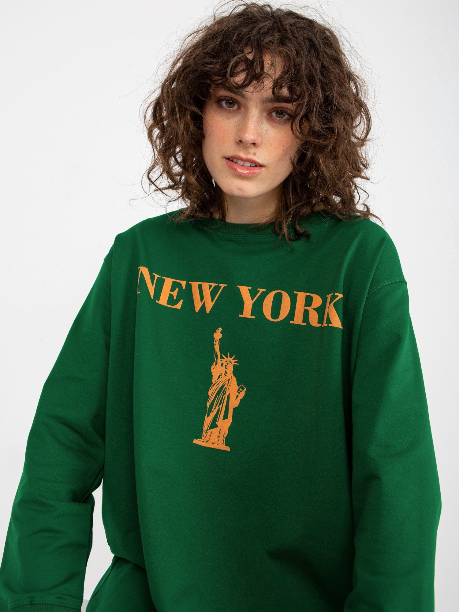Ciemnozielono-pomarańczowo długa bluza oversize z napisem .
