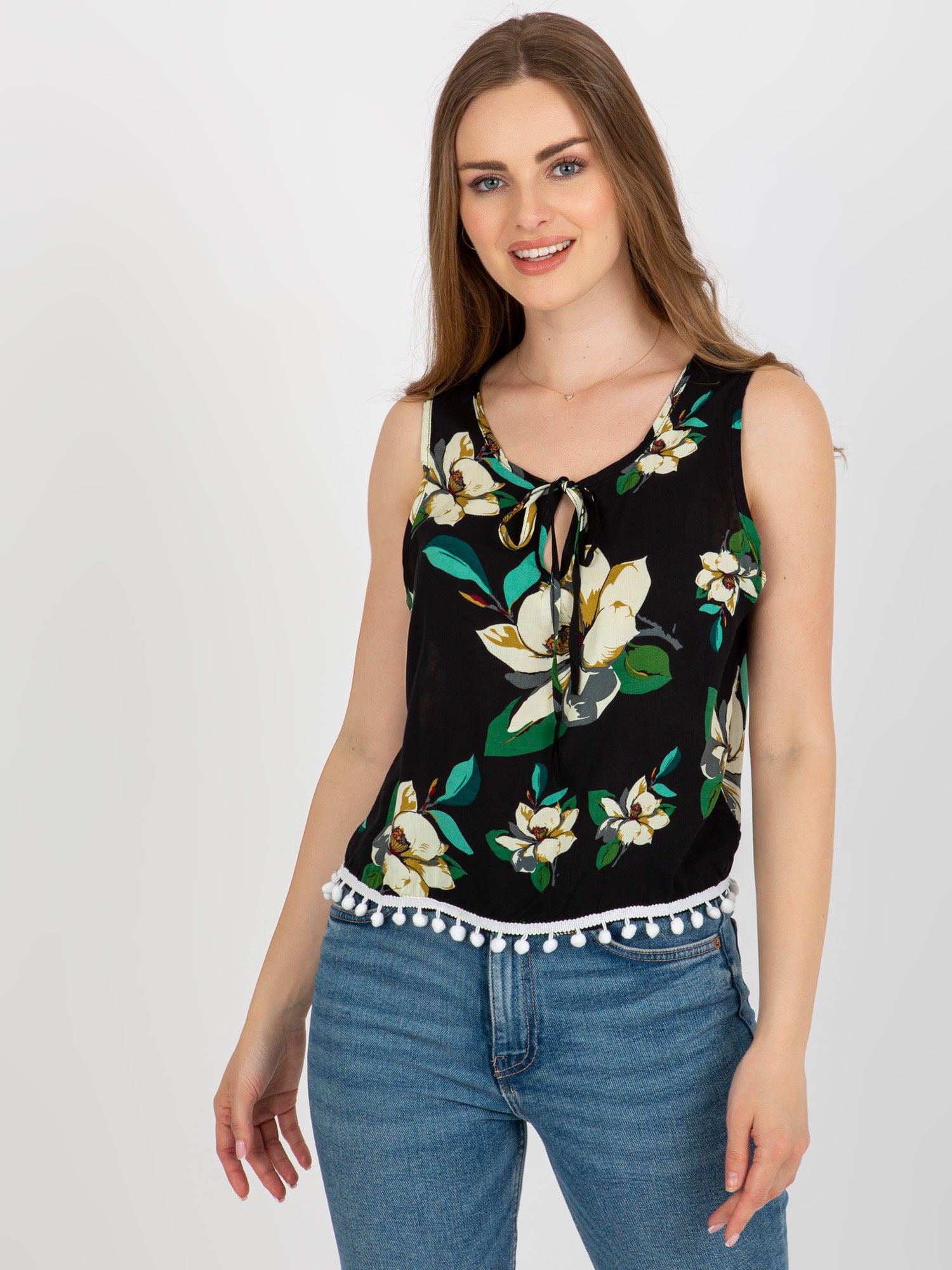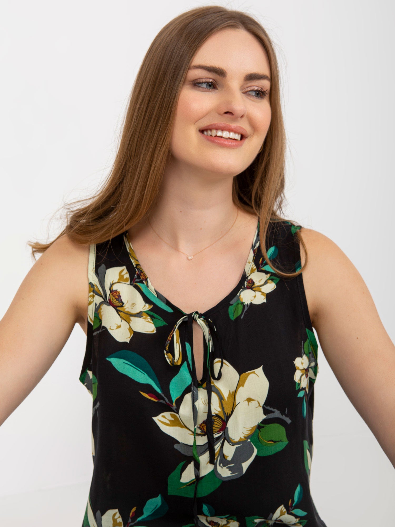 Czarna letnia bluzka w kwiaty bez rękawów .