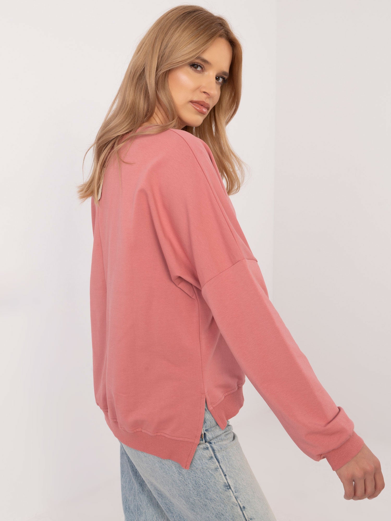 Wymiary bluzki w rozmiarze S mierzone na płasko: szerokość pod pachami - 65 cm, długość bluzy - 63 cm (przód), długość bluzy - 66 cm (tył), długość rękawa - 41 cm (od szwu).