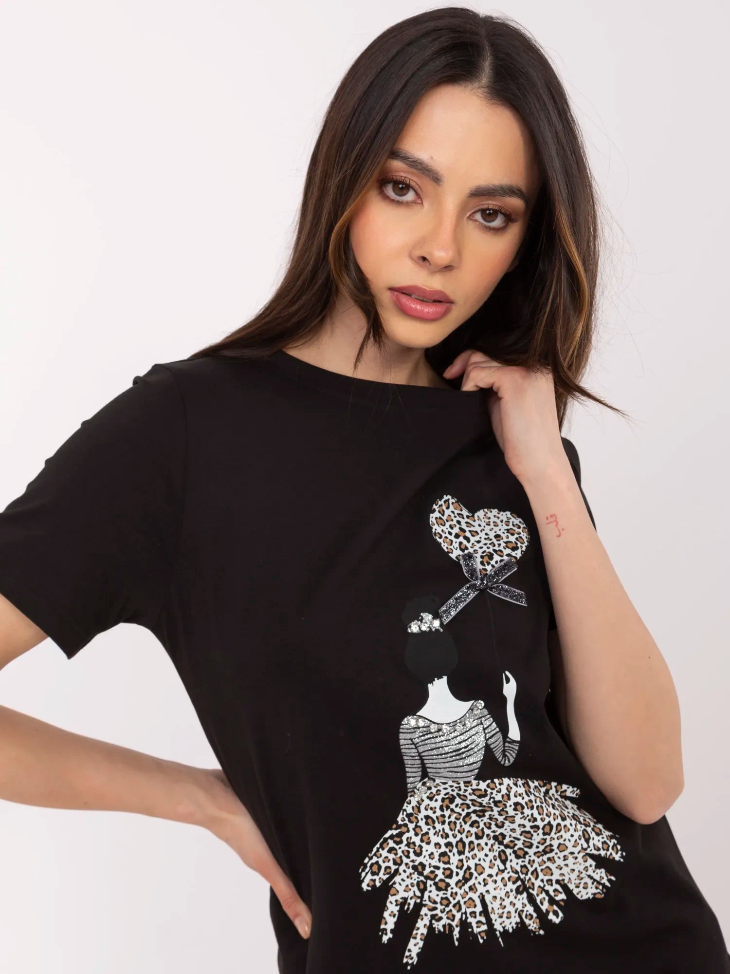 Wymiary bluzki w rozmiarze S mierzone na płasko: szerokość pod pachami - 49 cm, długość rękawa - 19 cm (od szwu), długość całkowita - 74 cm, szerokość w biodrach - 56 cm.