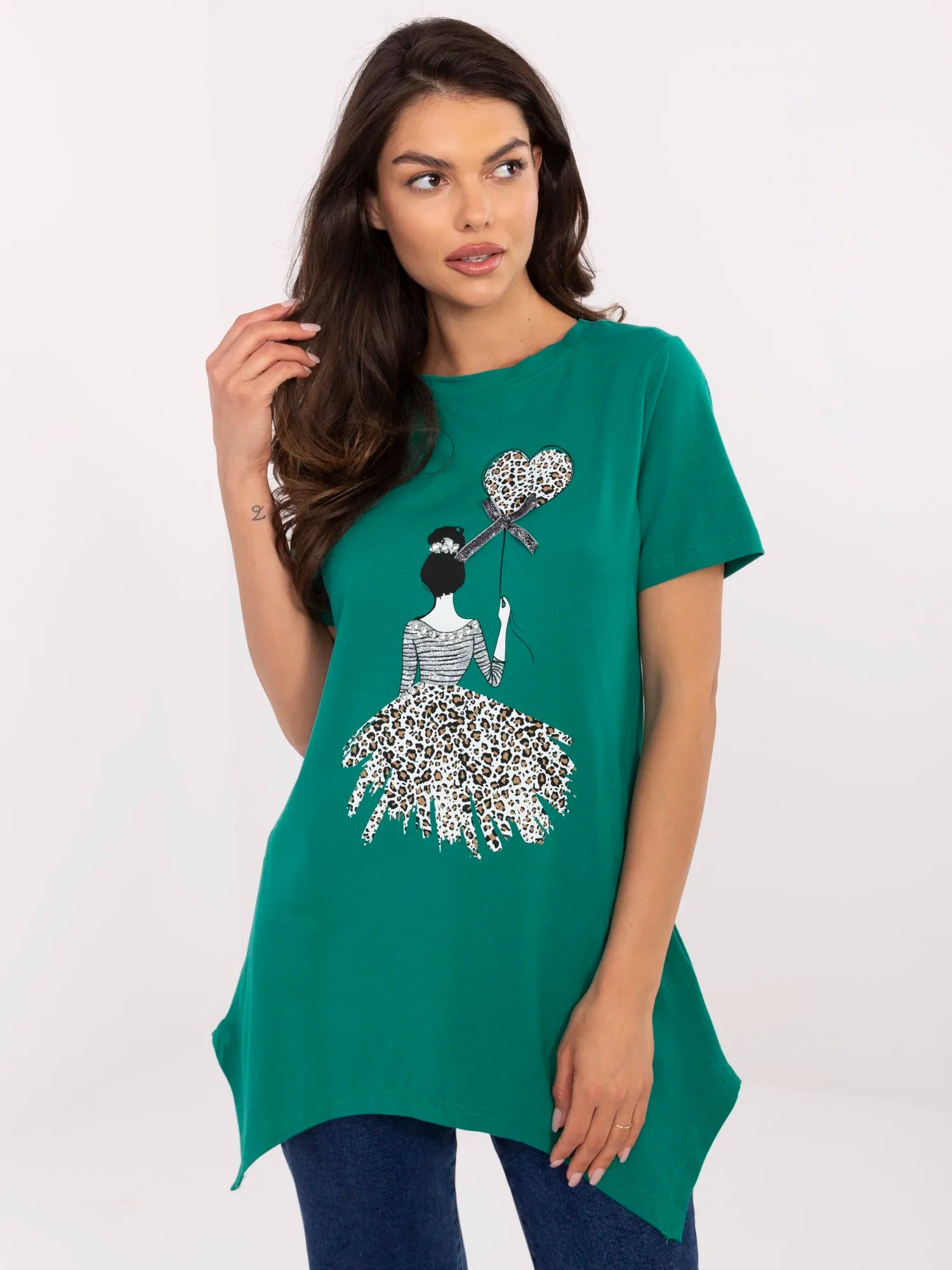Wymiary bluzki w rozmiarze S mierzone na płasko: szerokość pod pachami - 49 cm, długość rękawa - 19 cm (od szwu), długość całkowita - 74 cm, szerokość w biodrach - 56 cm.