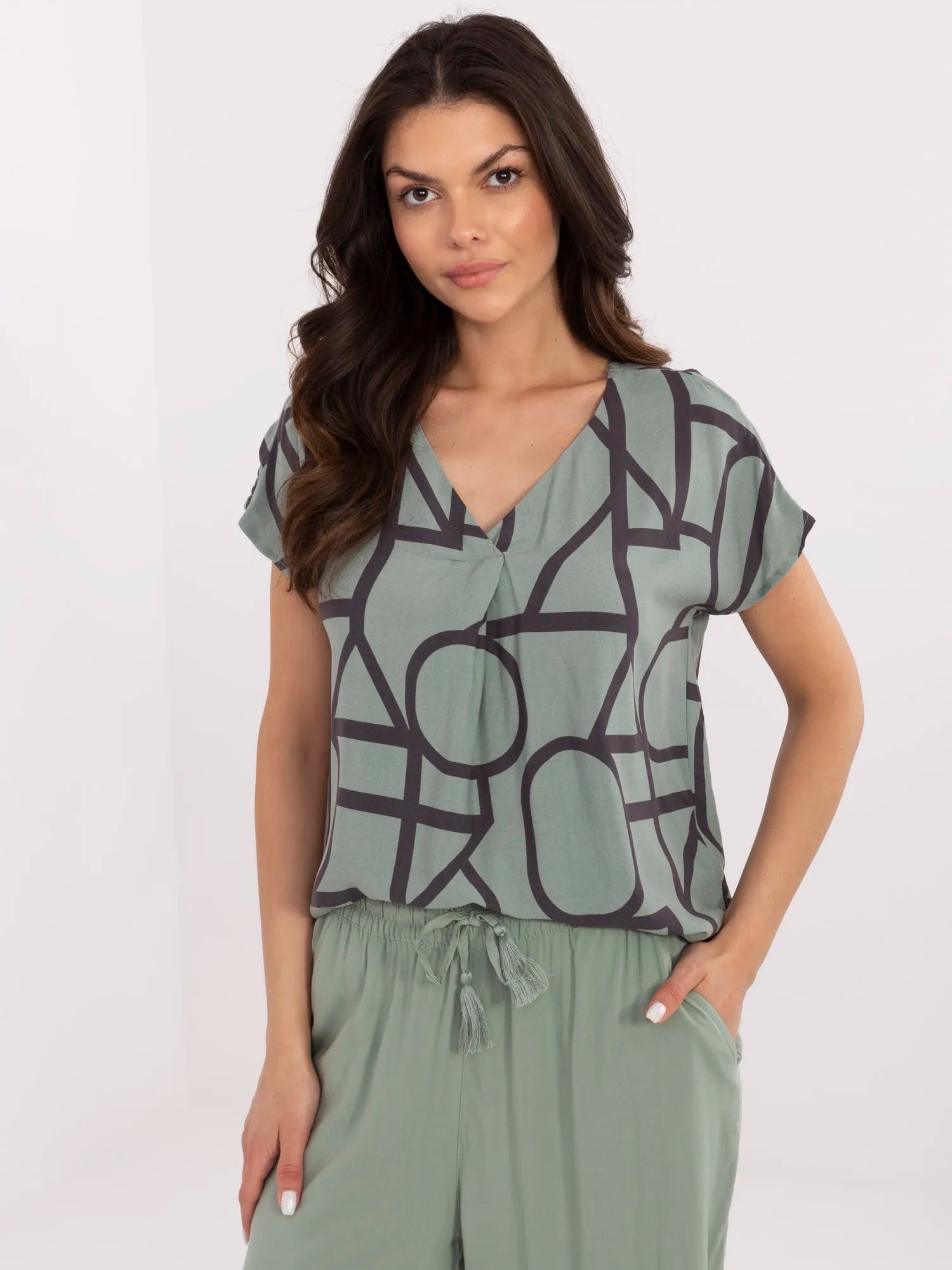 Wymiary bluzki w rozmiarze S mierzone na płasko: szerokość pod pachami - 54 cm, długość rękawa - 23 cm, szerokość w biodrach - 54 cm, długość całkowita - 63 cm (przód), długość całkowita - 68 cm (tył).