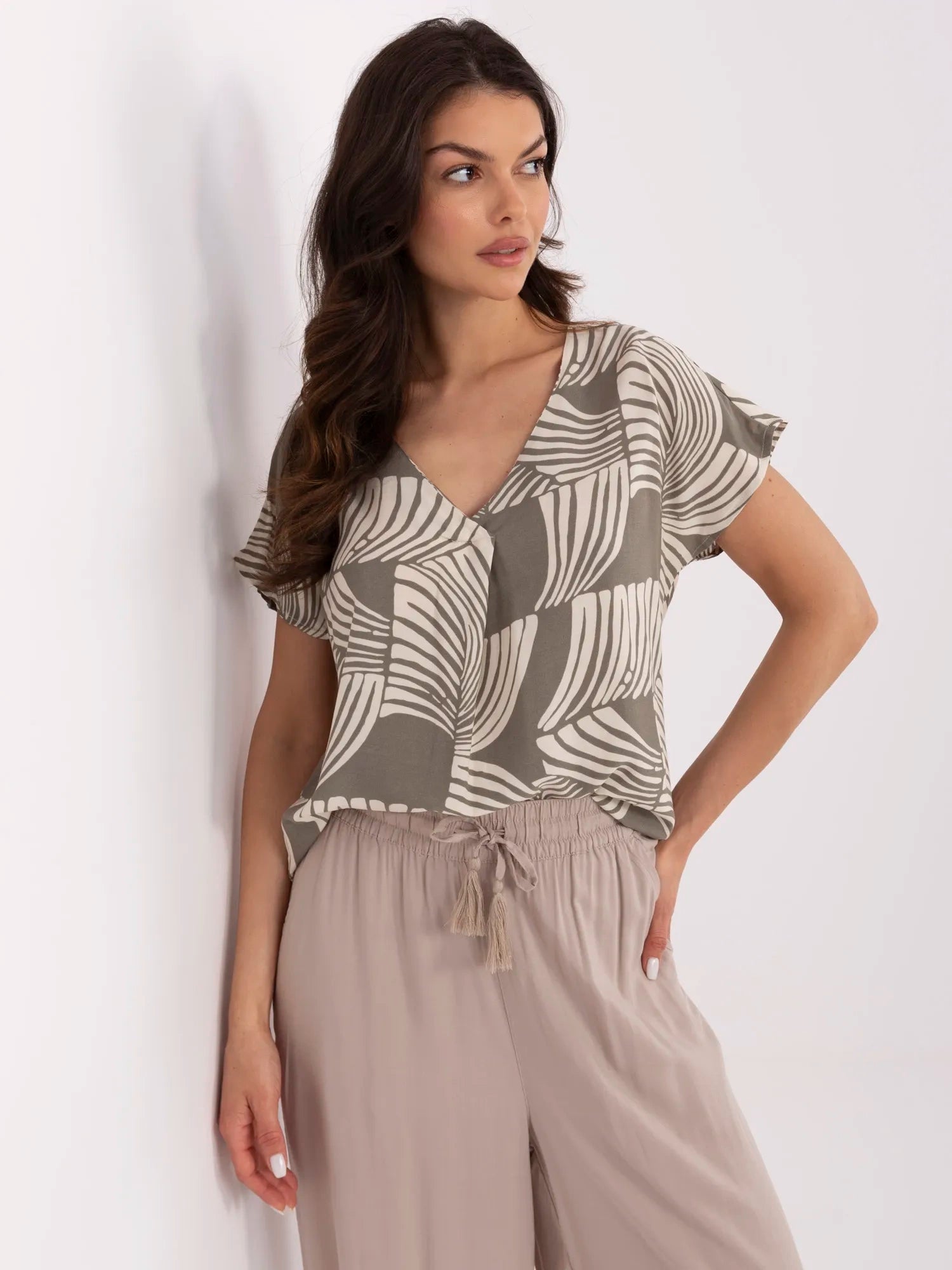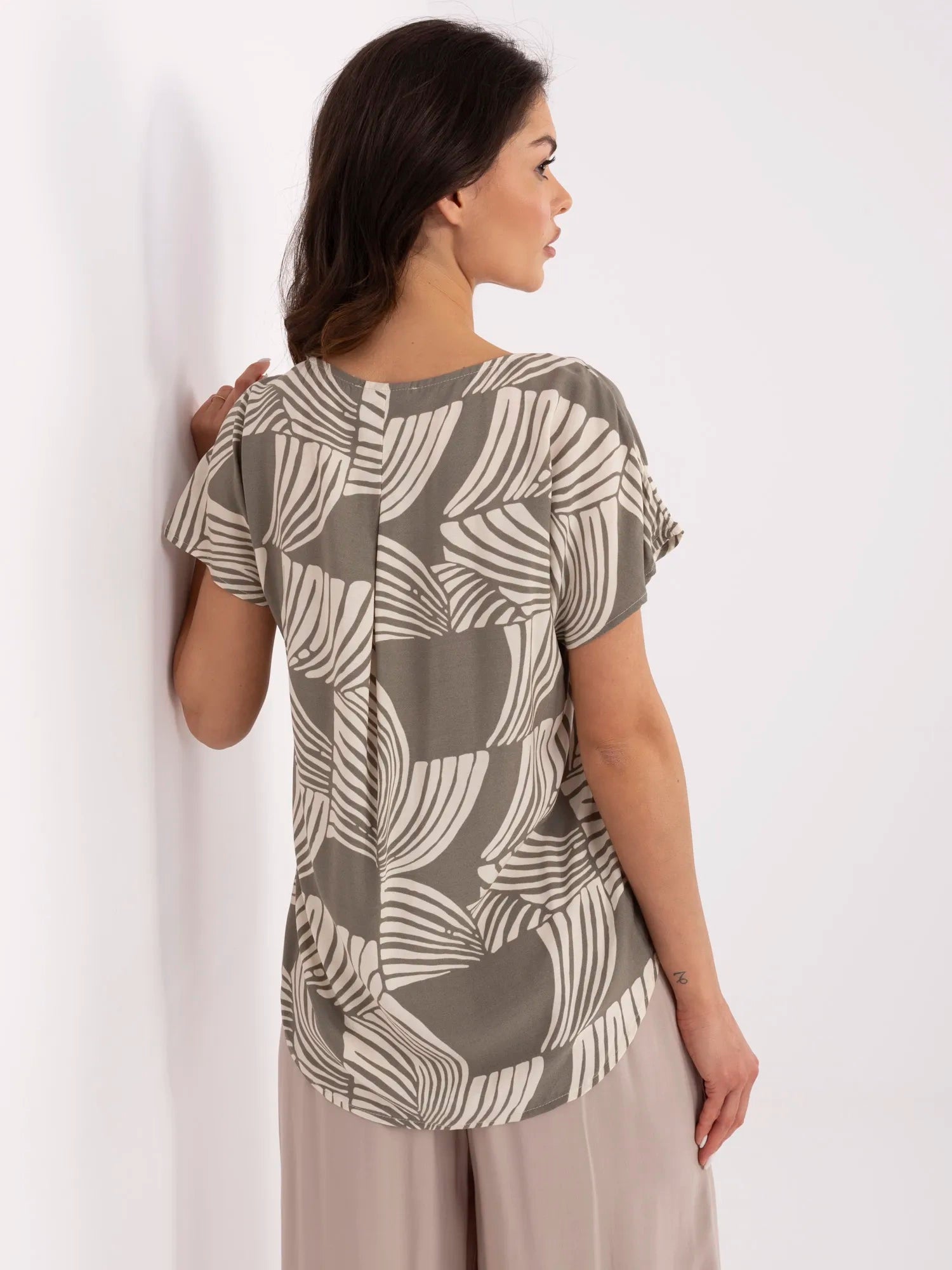 Wymiary bluzki w rozmiarze S mierzone na płasko: szerokość pod pachami - 54 cm, długość rękawa - 23 cm, szerokość w biodrach - 54 cm, długość całkowita - 63 cm (przód), długość całkowita - 68 cm (tył).
