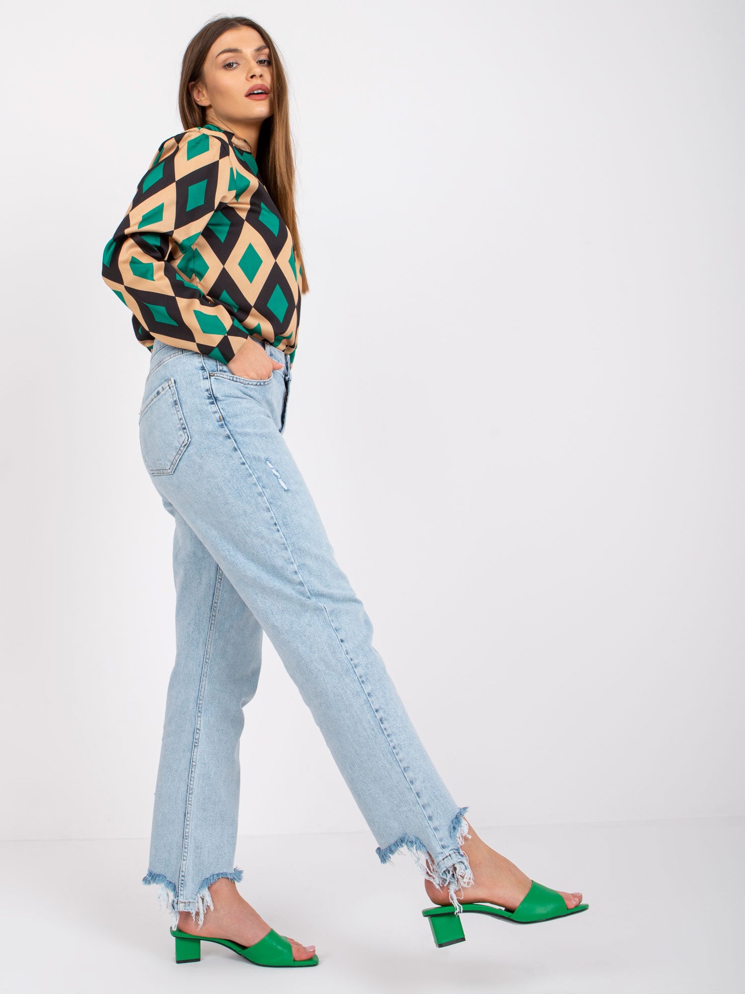 Wymiary bluzki w rozmiarze one size mierzone na płasko: szerokość pod pachami - 54 cm, długość całkowita: przód - 65 cm, tył - 70 cm,, długość rękawa - 57 cm.