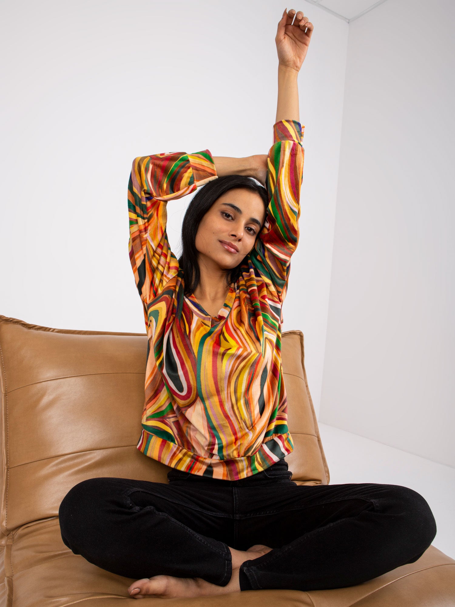 Wymiary bluzki w rozmiarze one size mierzone na płasko: szerokość pod pachami - 55 cm, długość całkowita - 61 cm, długość rękawa - 56 cm.