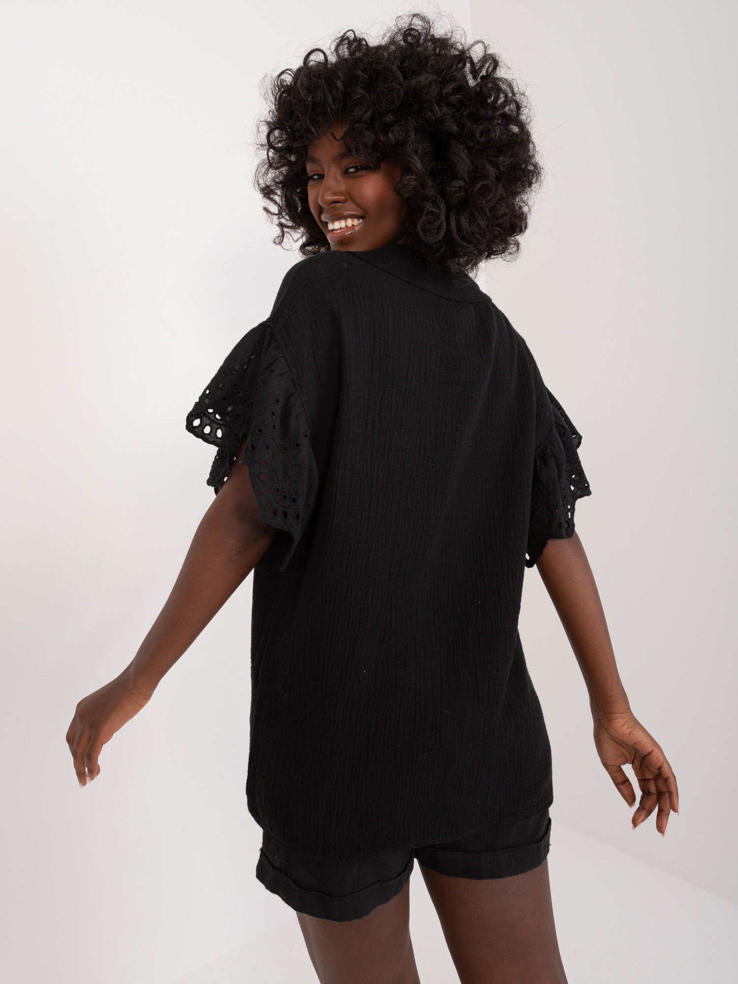 Wymiary bluzki w rozmiarze one size mierzone na płasko: szerokość pod pachami - 52 cm, długość całkowita - 67 cm