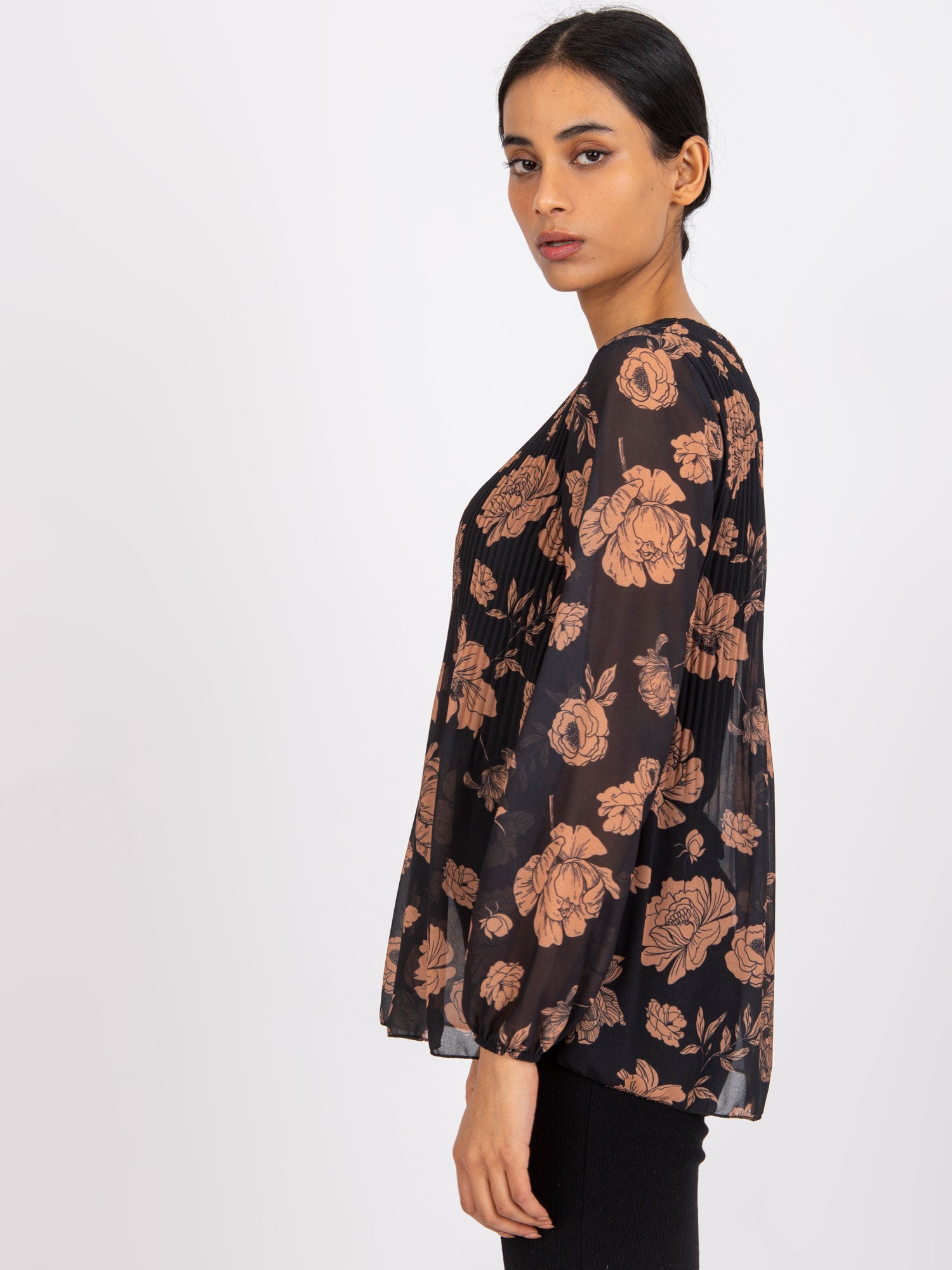 Wymiary bluzki w rozmiarze one size mierzone na płasko: szerokość pod pachami - 47 cm, długość całkowita - 67 cm, długość rękawa - 54 cm.