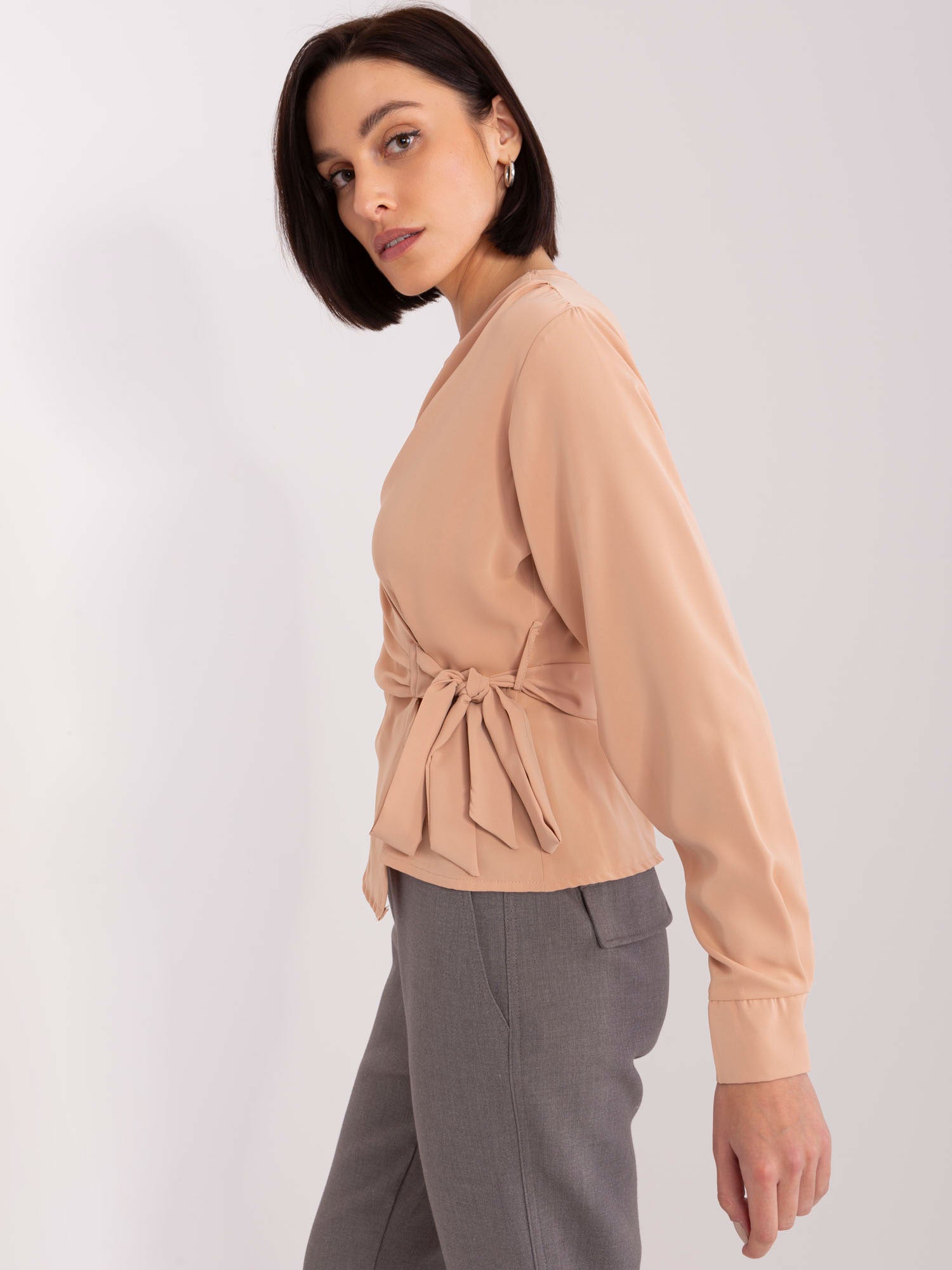 Camelowa bluzka wizytowa z wiązaniem.