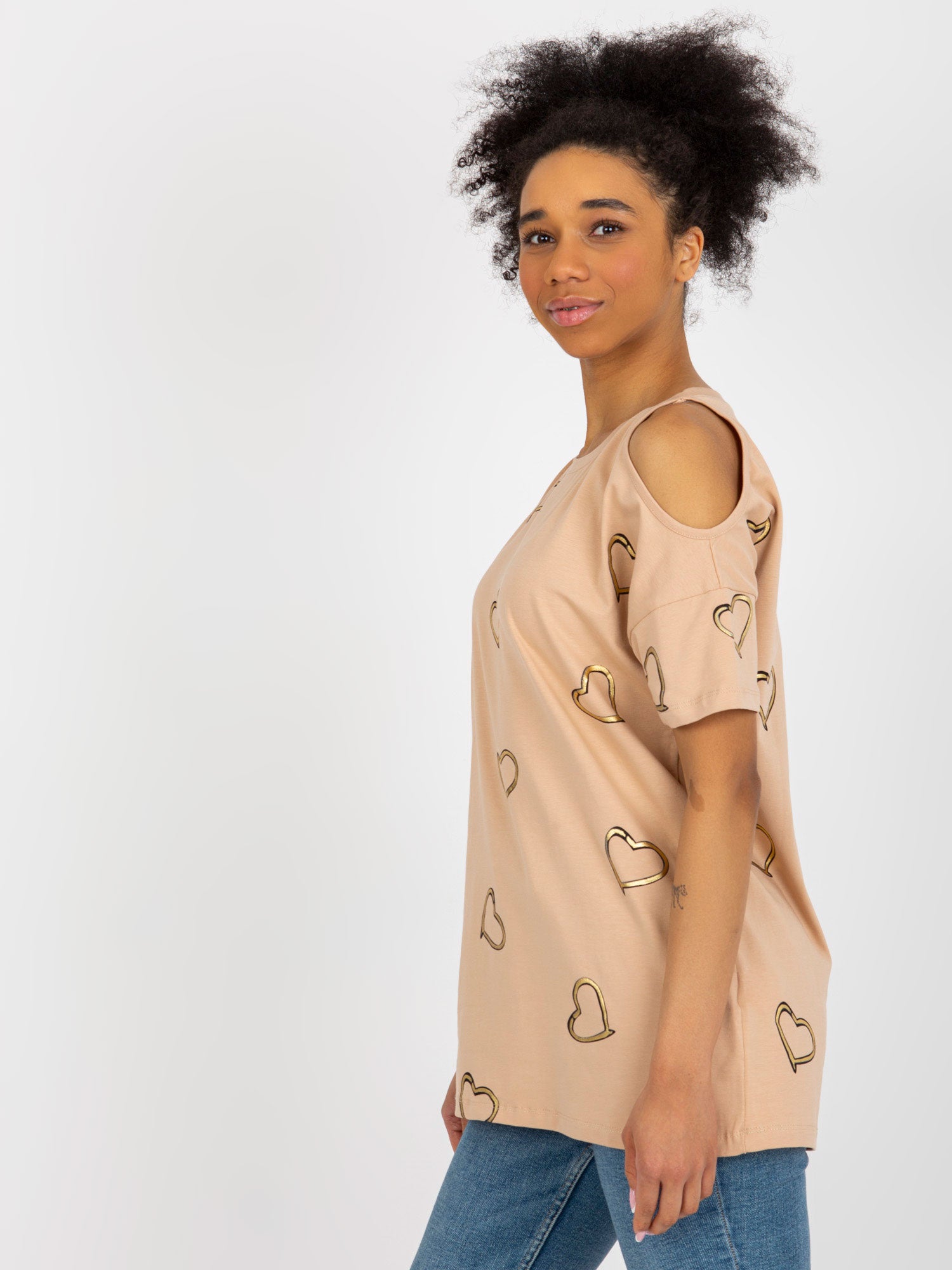Camelowa damska bluzka z nadrukiem w serduszka .