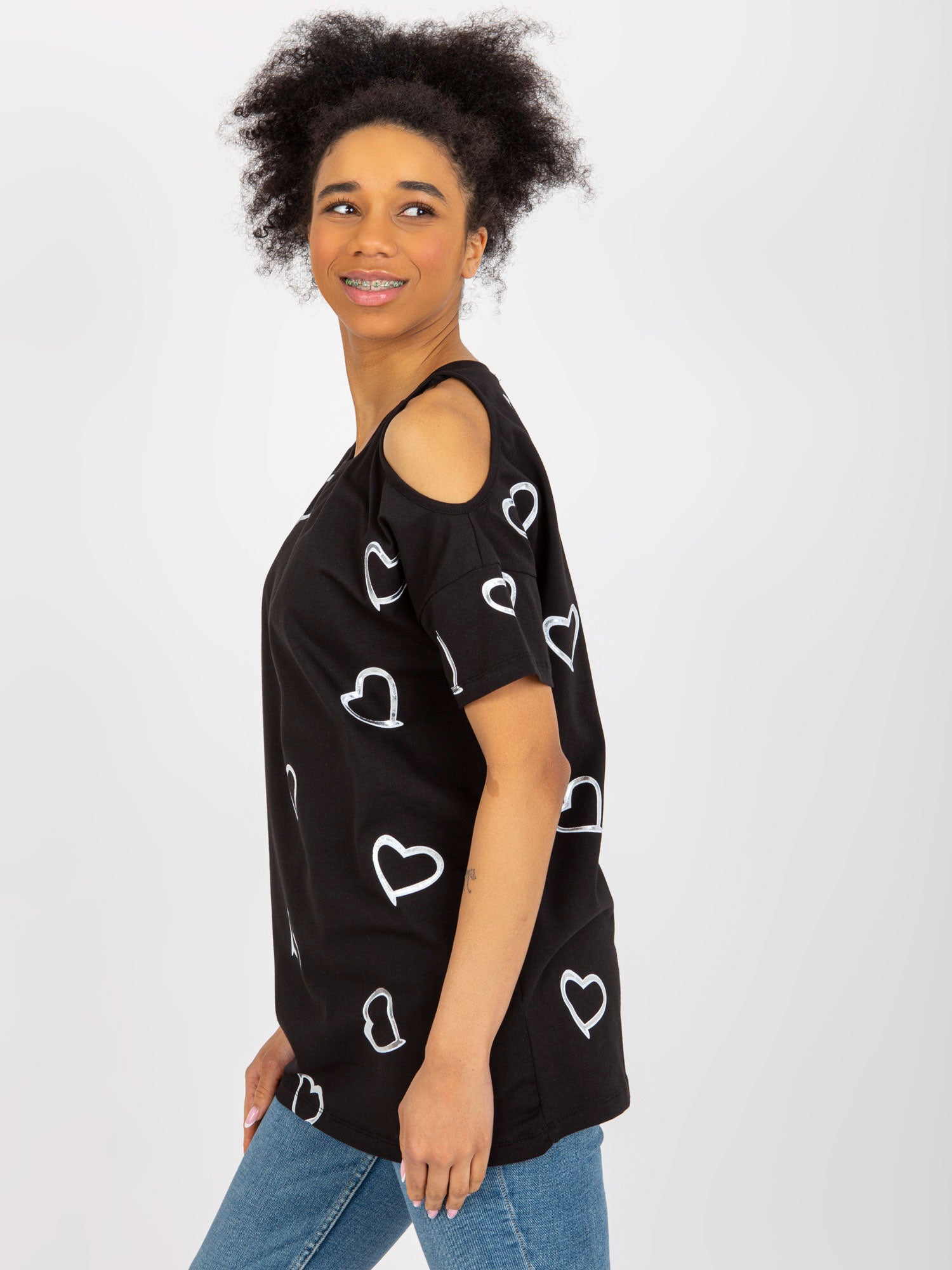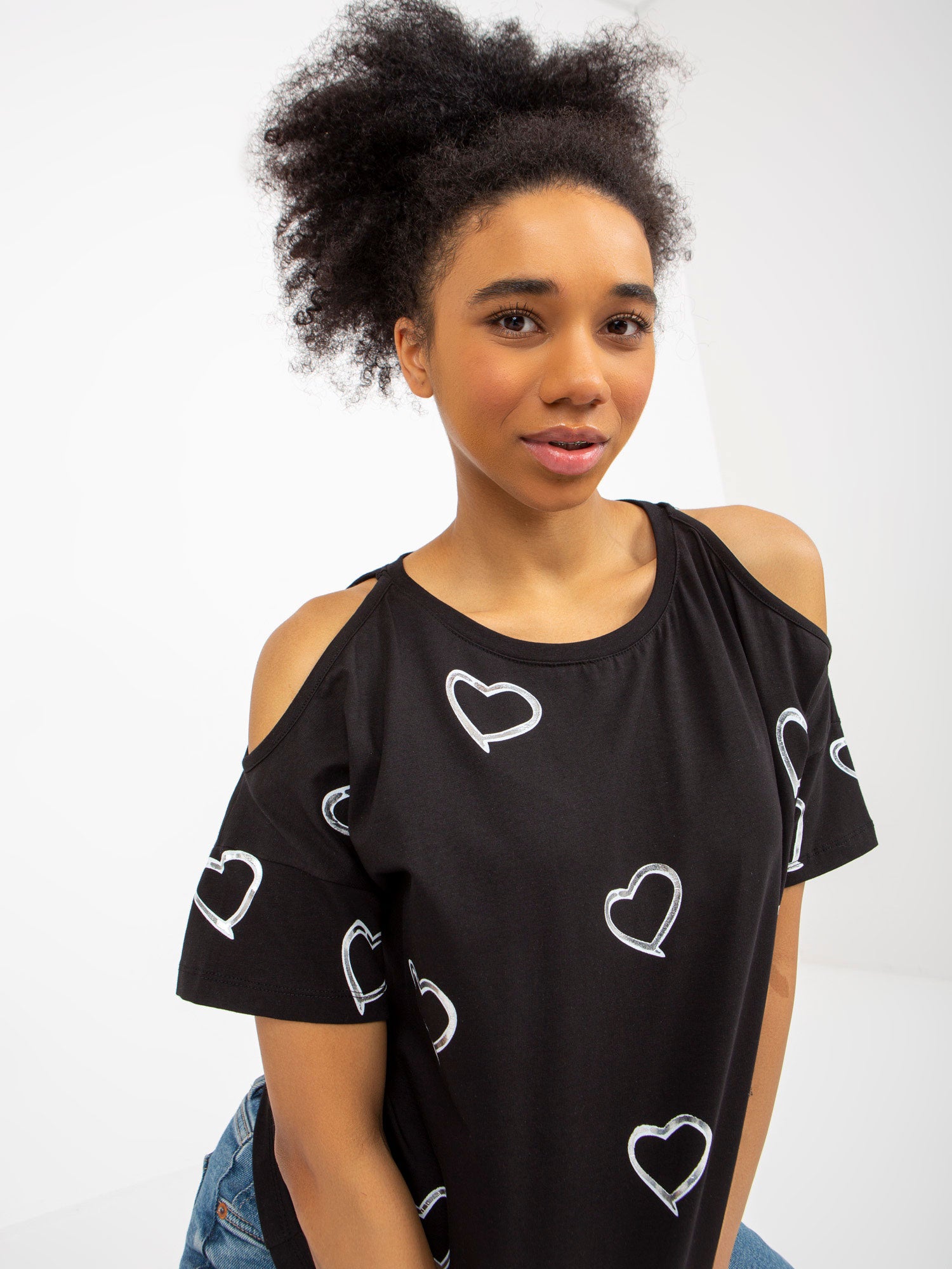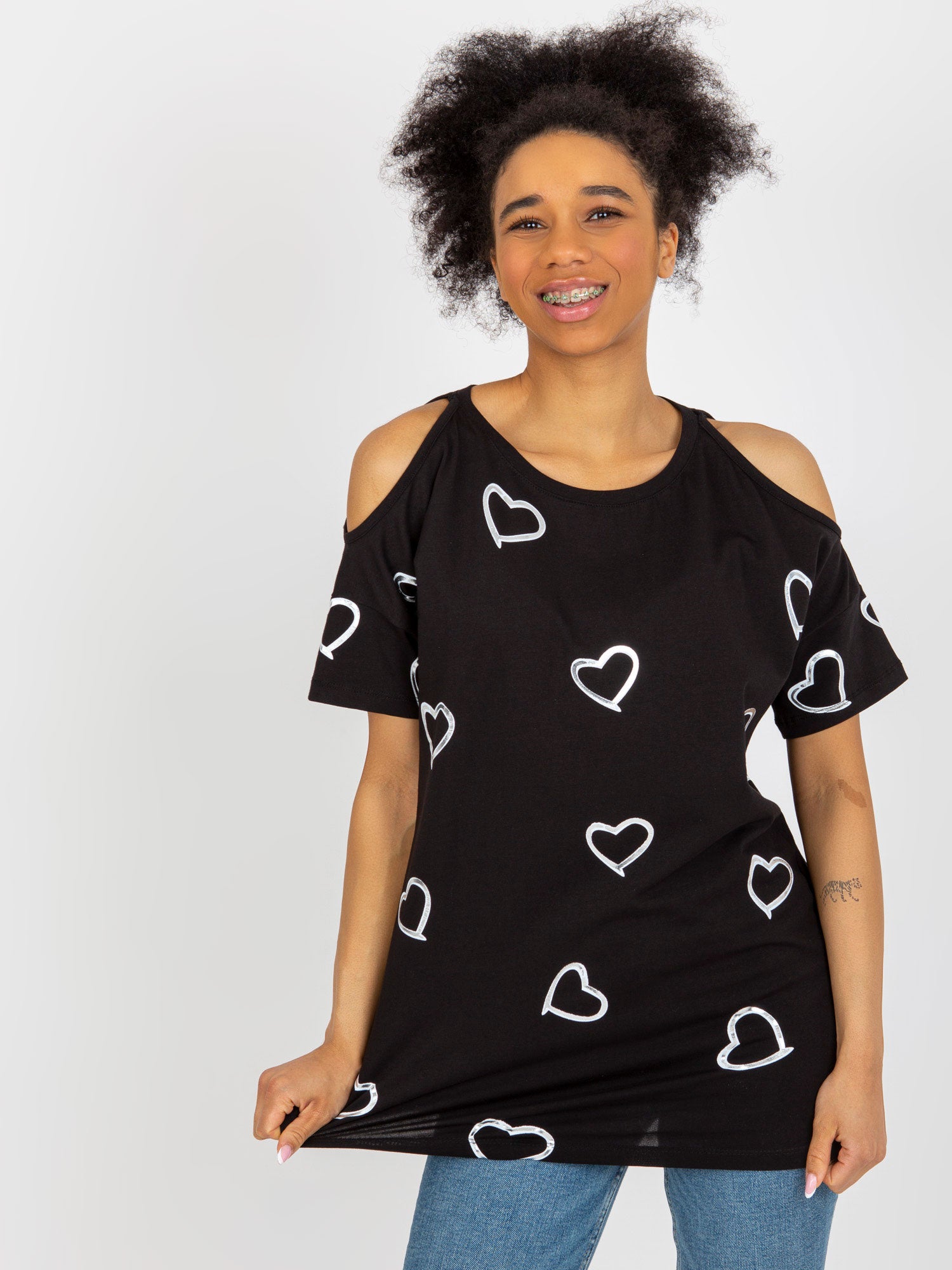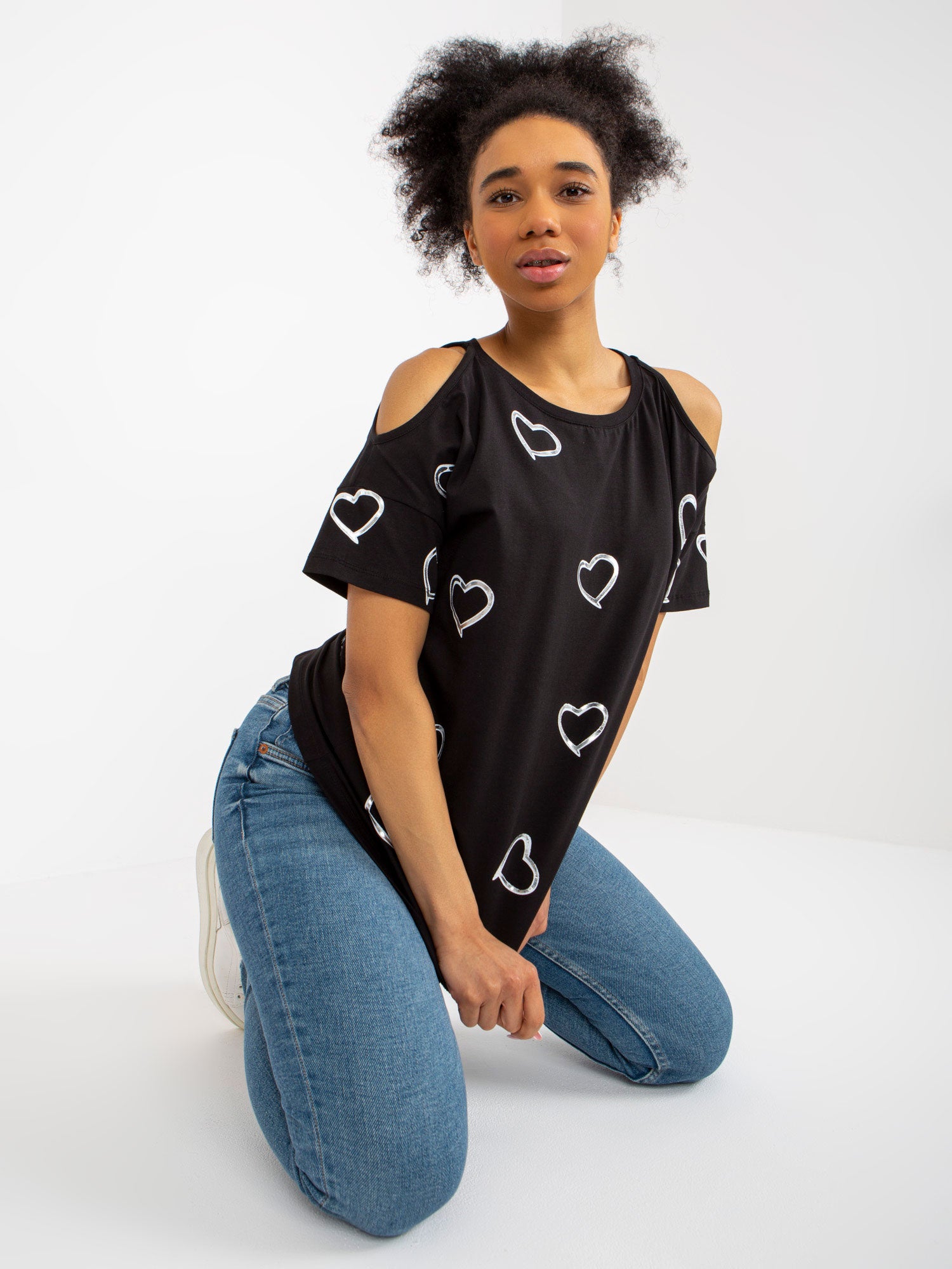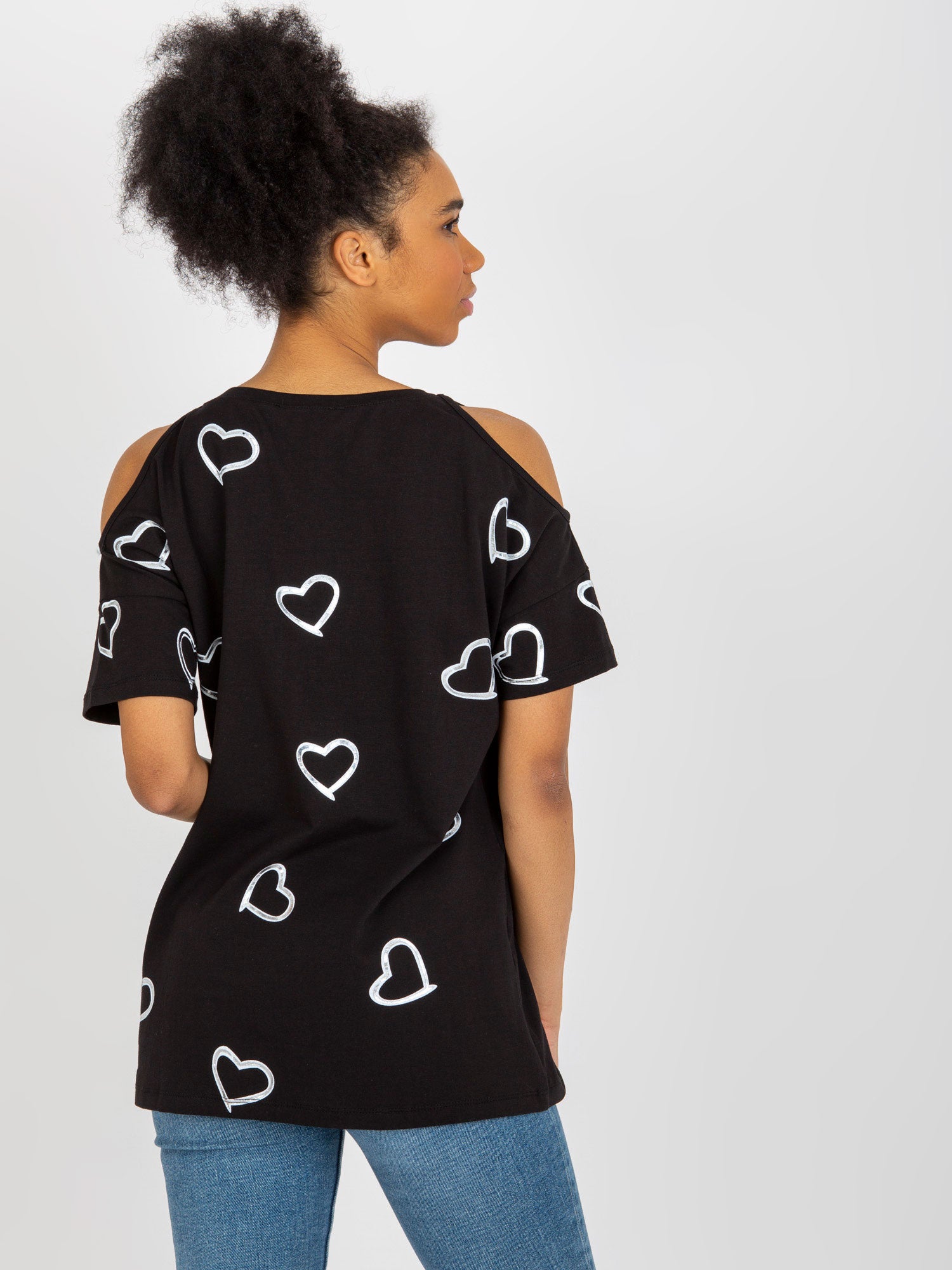 Czarna damska bluzka z nadrukiem w serduszka .