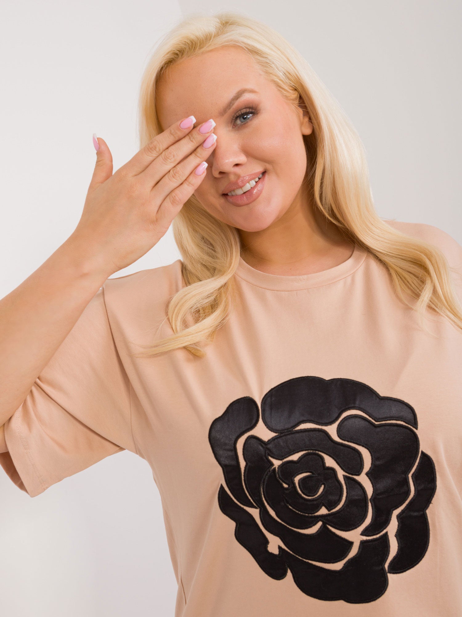 Wymiary bluzki w rozmiarze one size mierzone na płasko: szerokość pod pachami - 62 cm, długość całkowita (przód) - 67 cm, długość całkowita (tył) - 72 cm .