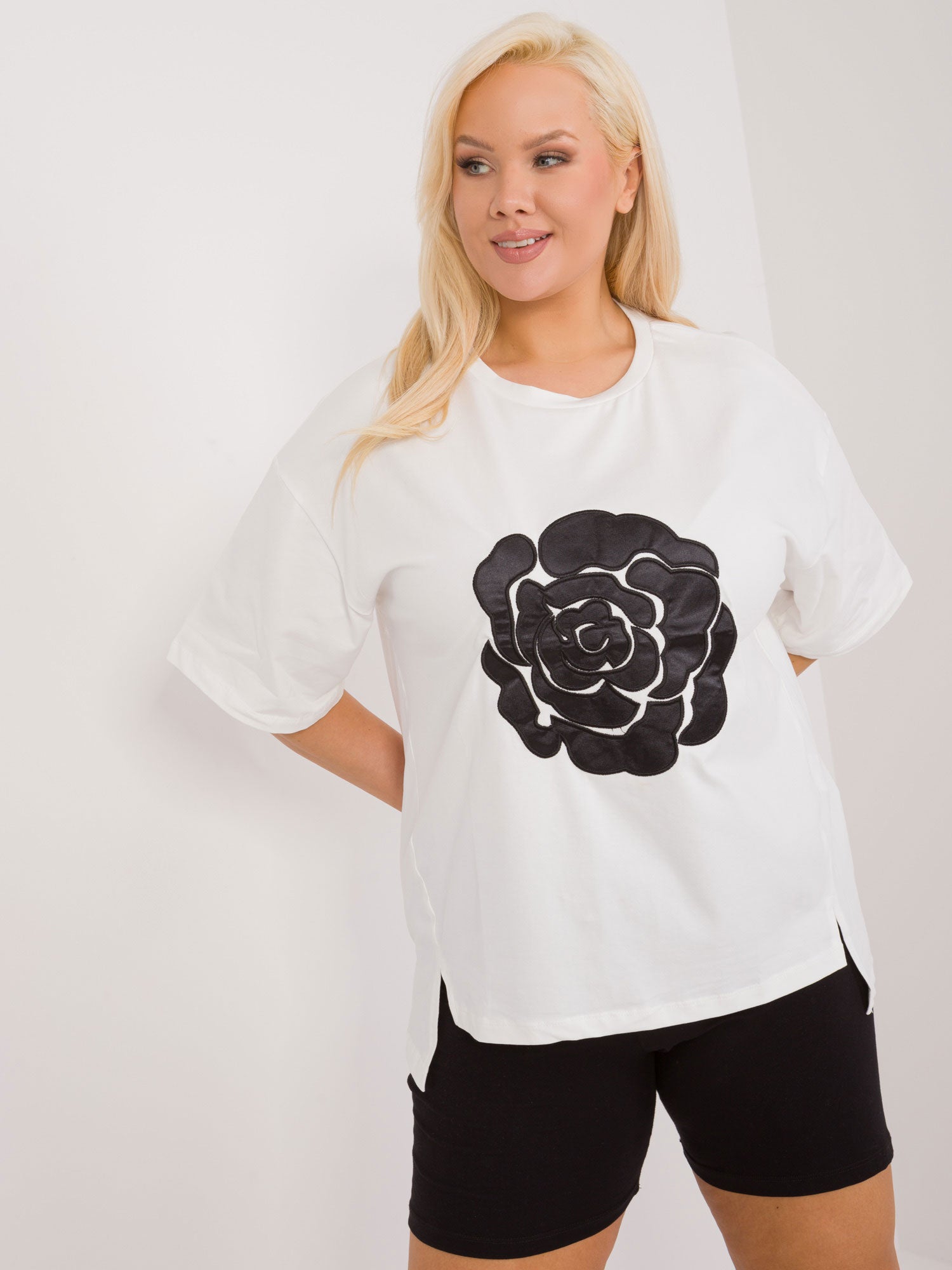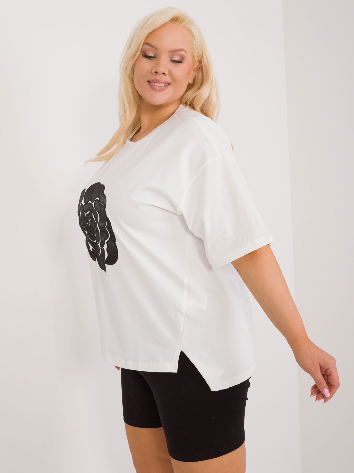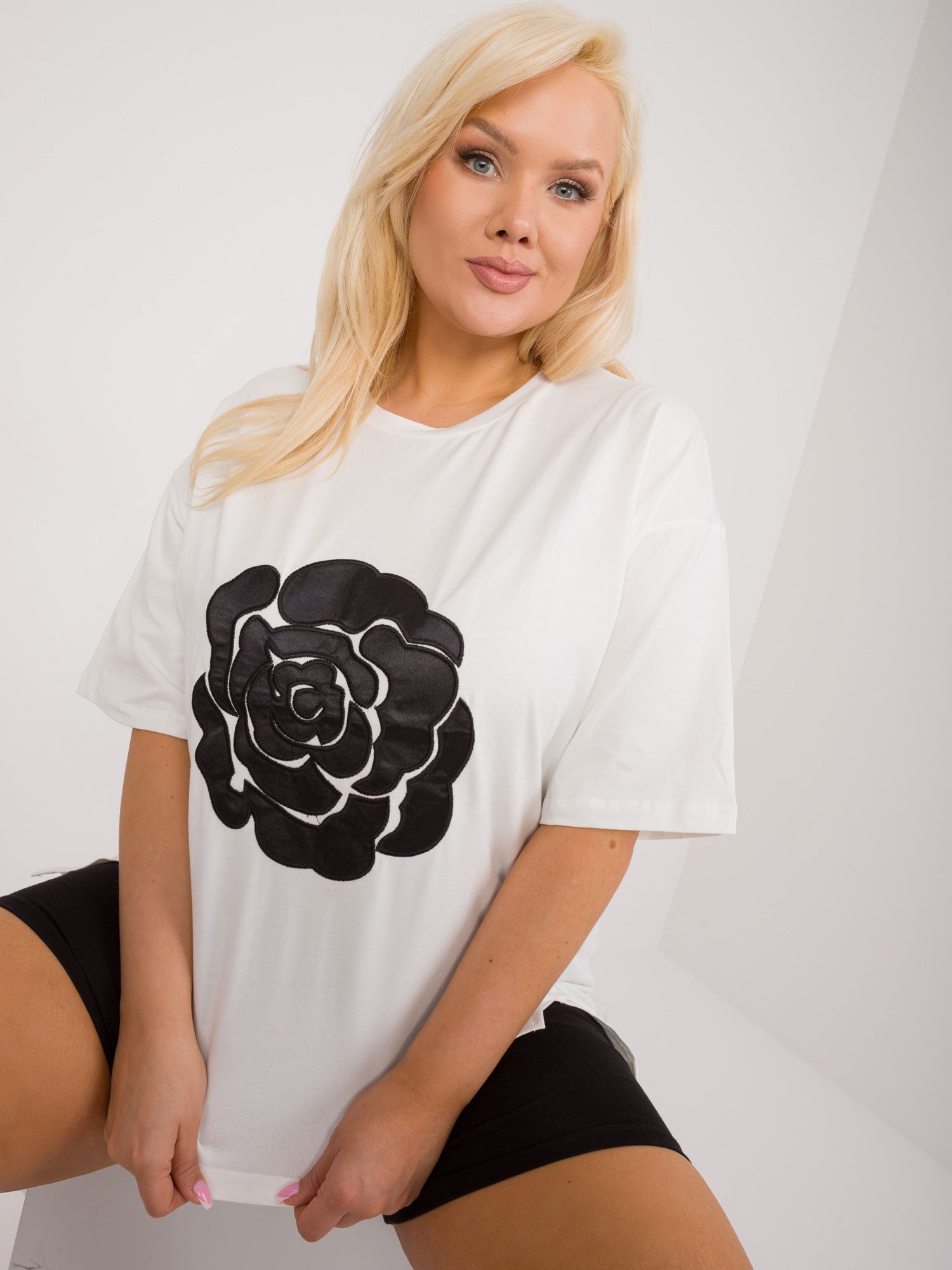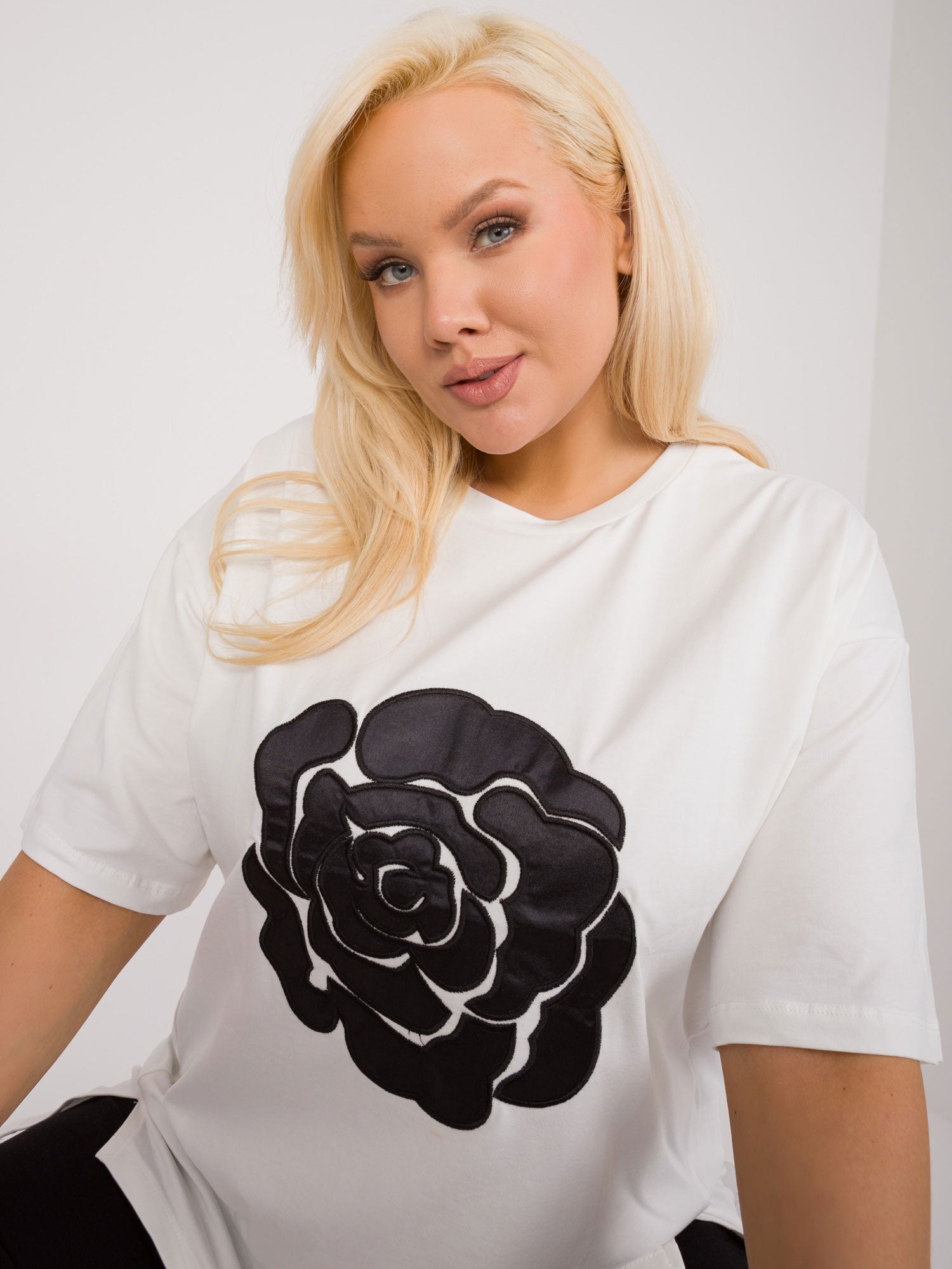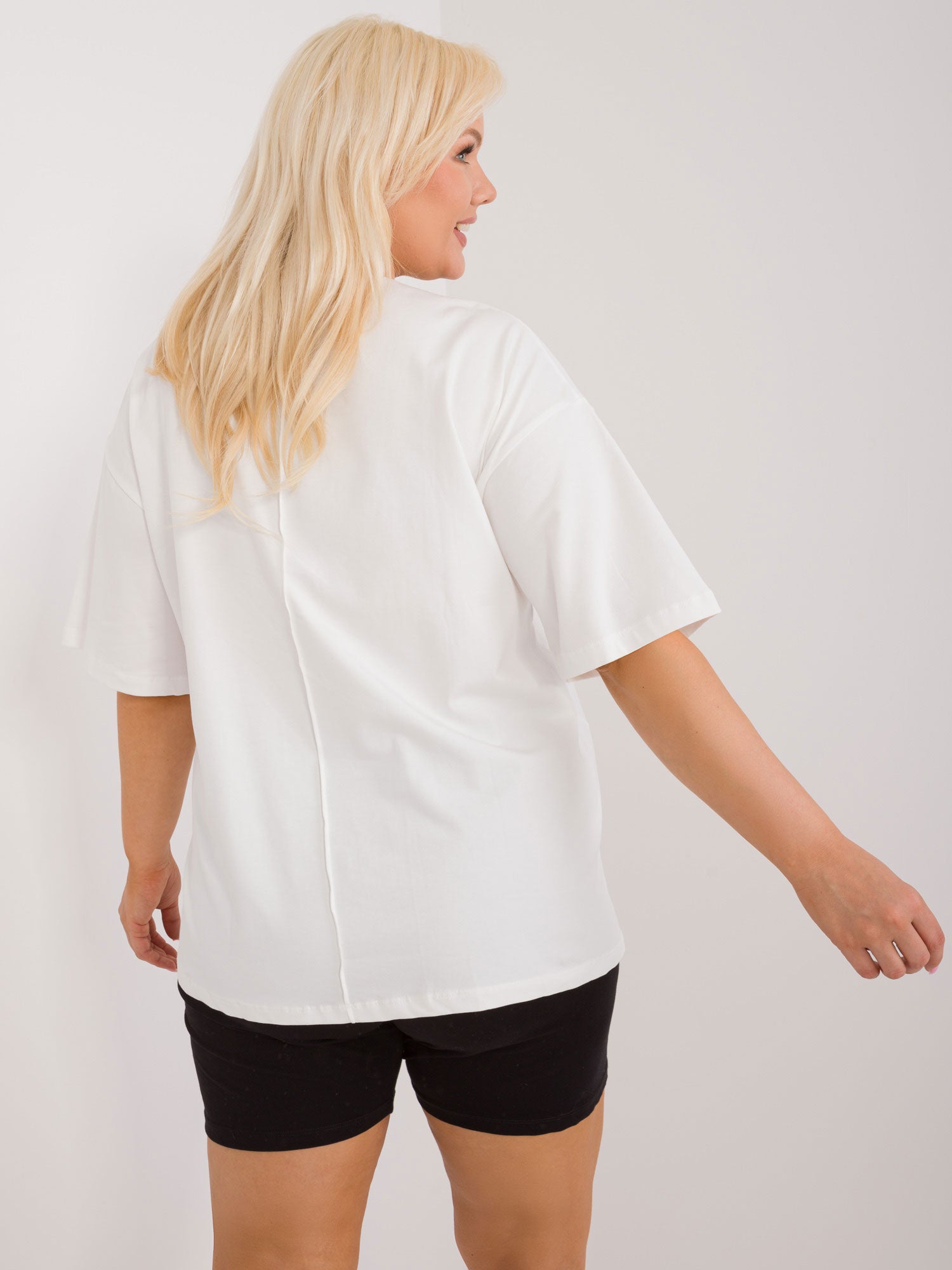 Wymiary bluzki w rozmiarze one size mierzone na płasko: szerokość pod pachami - 62 cm, długość całkowita (przód) - 67 cm, długość całkowita (tył) - 72 cm .