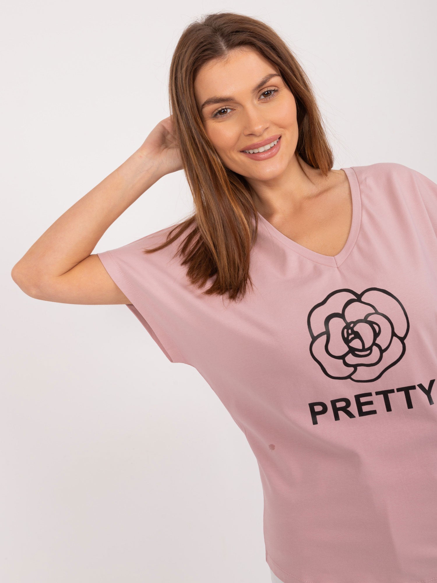 Wymiary bluzki w rozmiarze one size mierzone na płasko: szerokość pod pachami - 55 cm, długość całkowita - 62 cm.