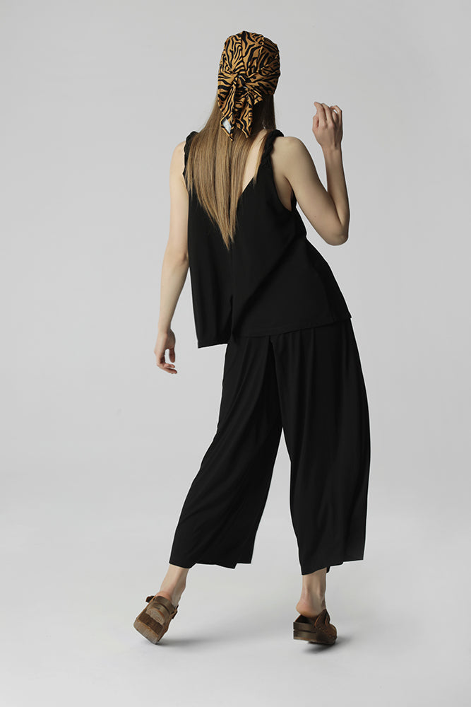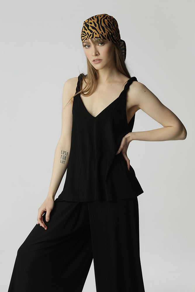 Luźna bluzka na ramiączkach o kroju w literę A z dekoltem w kształcie litery V. Ramiączka zostały zaplecione z taśm stworzonych z tego samego materiału.