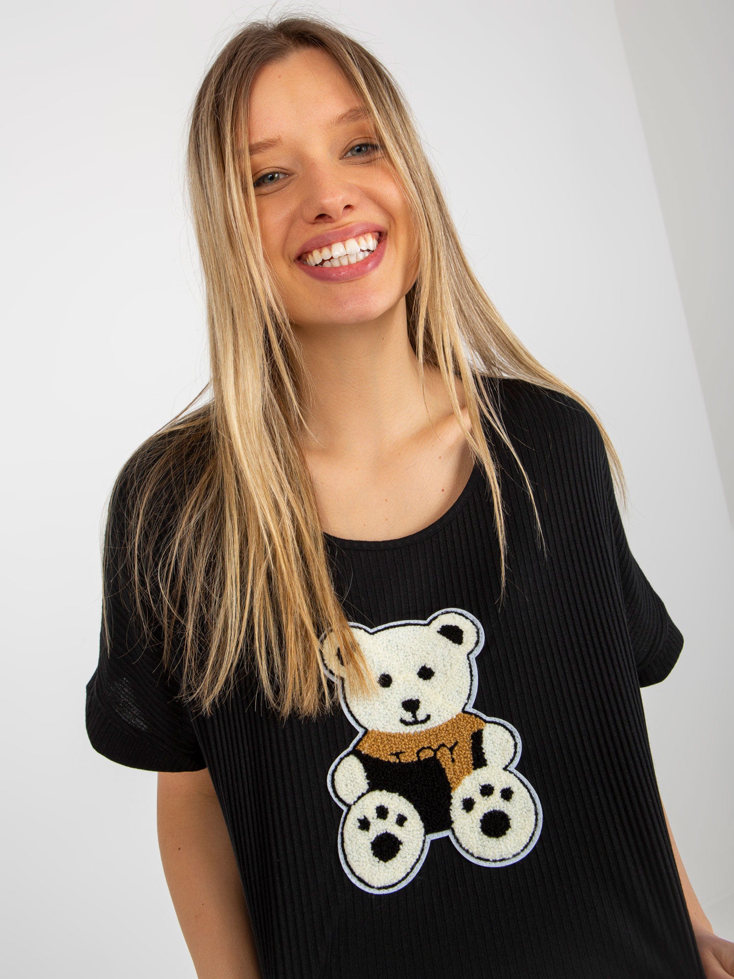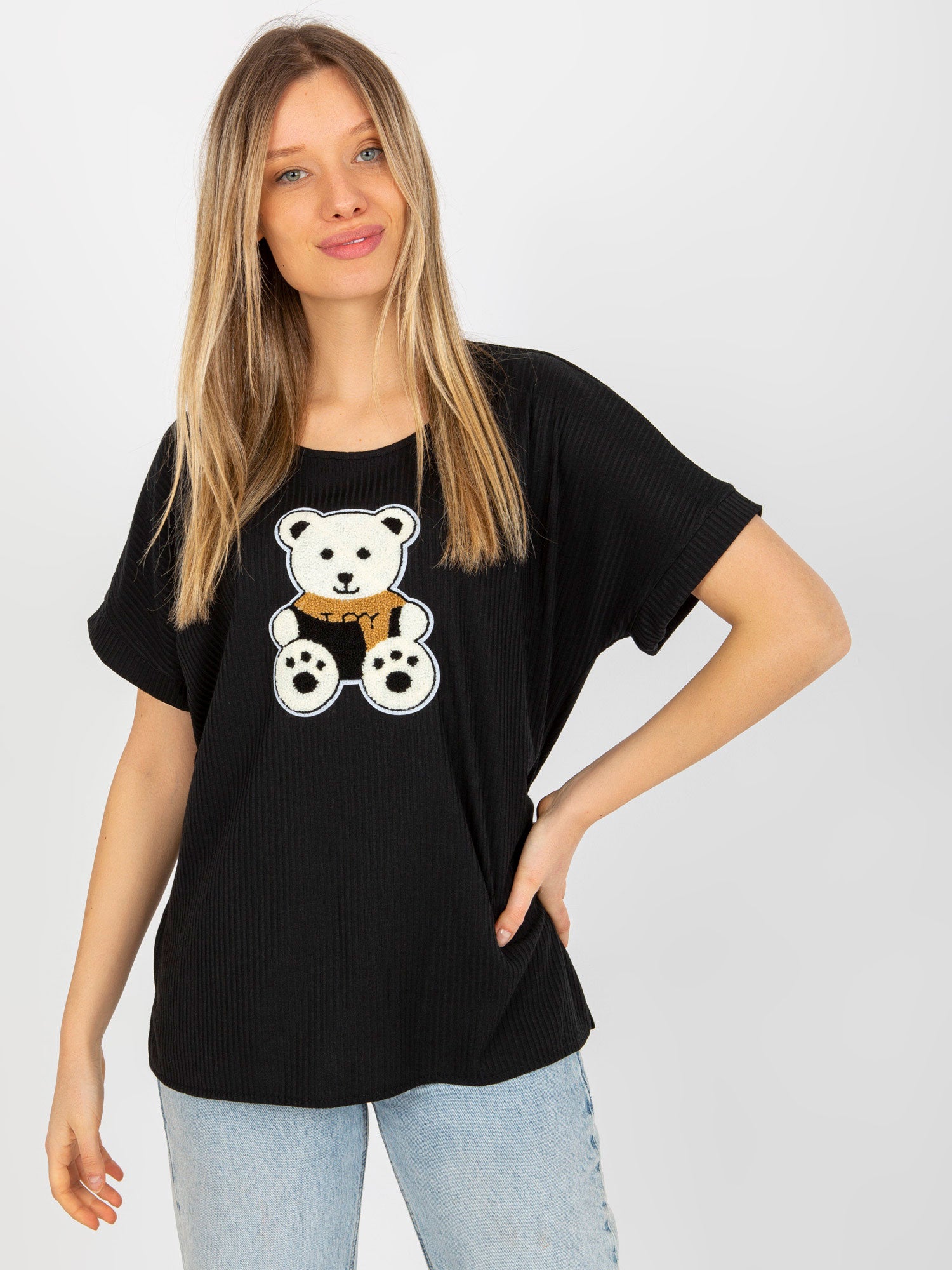 Czarna prążkowana bluzka oversize z misiem .