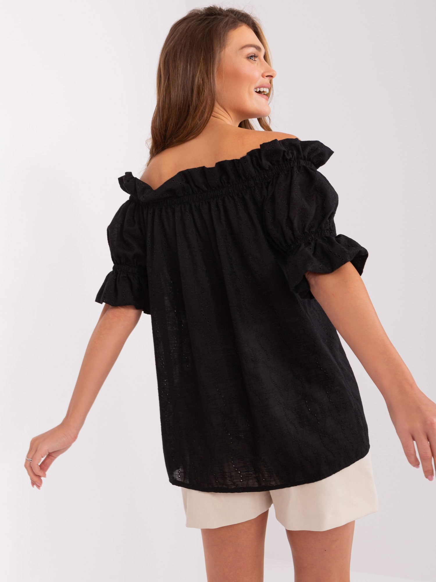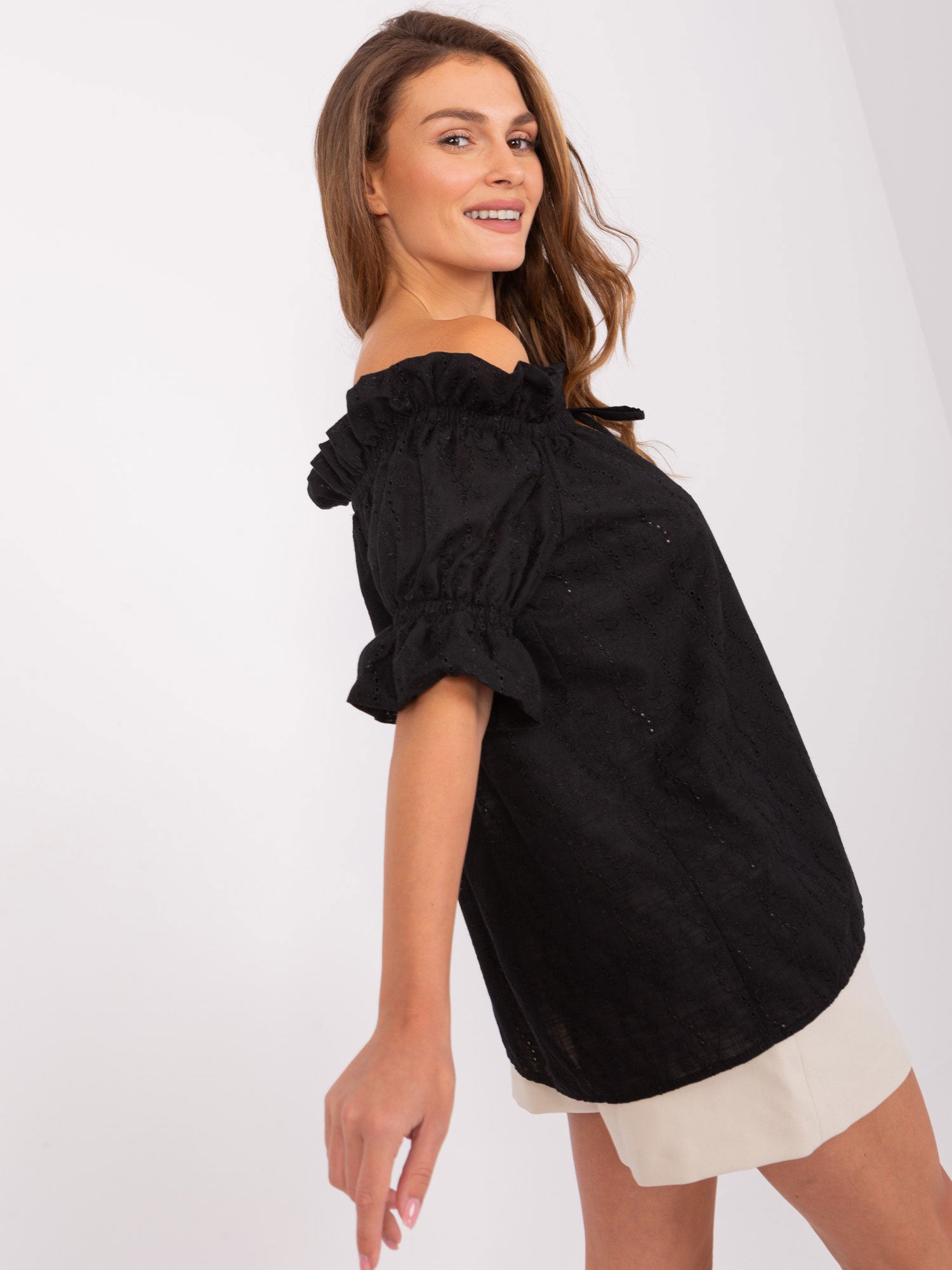 Czarna damska bluzka hiszpanka z wiązaniem .