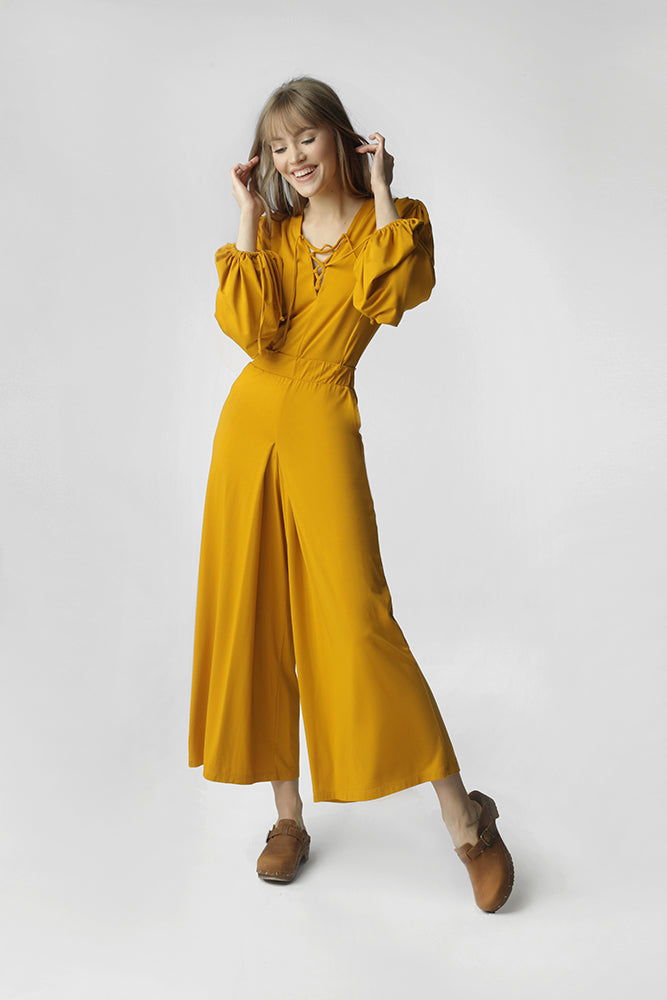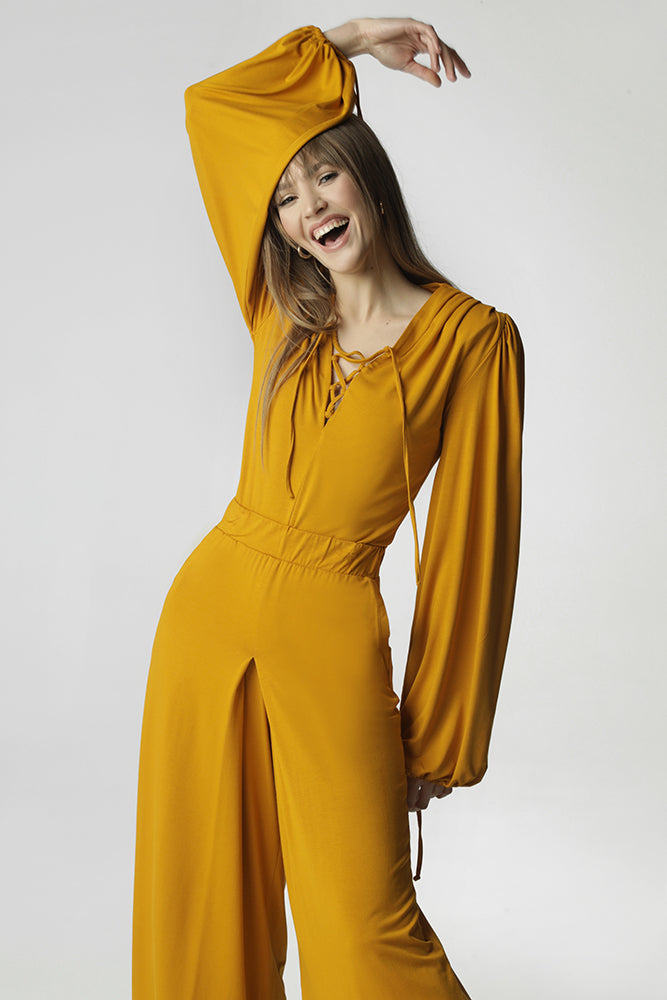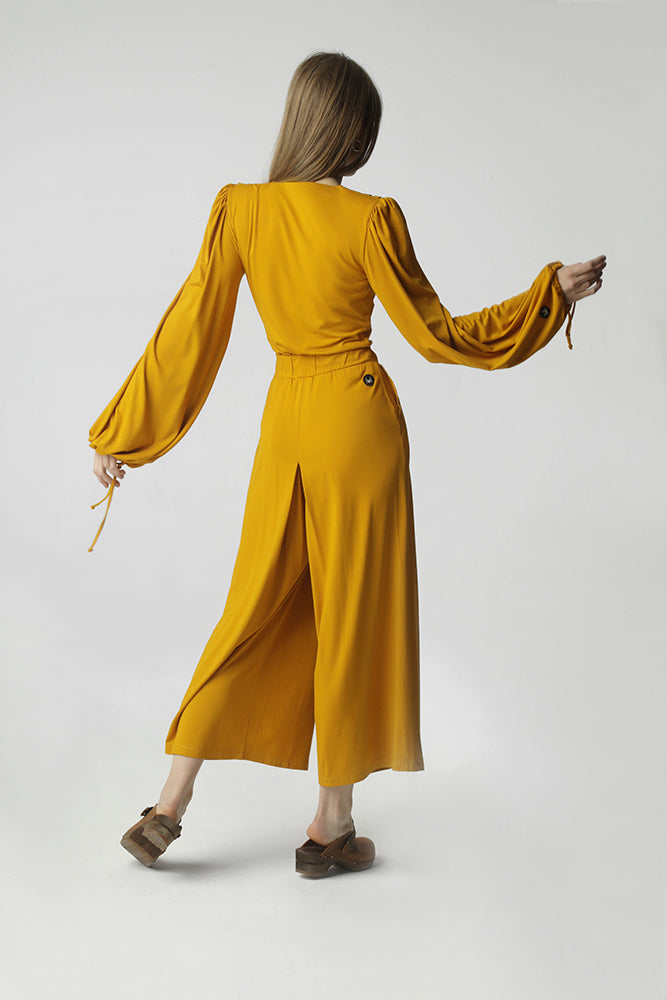 Dopasowana bluzka ze sznurowanym dekoltem i bufiastymi rękawami. W dekolt wszyłyśmy pętelki przez które przeplotłyśmy sznurek uszyty z tego samego materiału. Oprócz tego, że wiązania nadają bluzce charakter, to pełnią też funkcję czysto funkcjonalną: dzięki sznurkowi w dekolcie możesz regulować jego głębokość, a dzięki sznurkom na dole rękawów możesz regulować zarówno szerokość i styl rękawów (mogą byś bufiaste, albo dzwonowate) oraz ich długość (możesz zawiązać sznurki nad łokciami). Ramiona zostały dodatkowo podkreślone i wzmocnione wkładami barkowymi, czyli tak zwanymi „poduszkami”