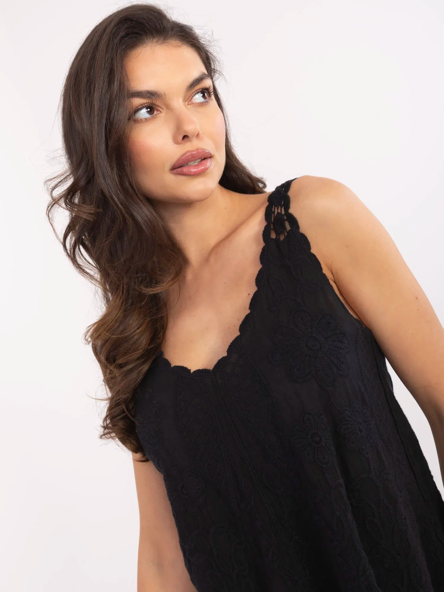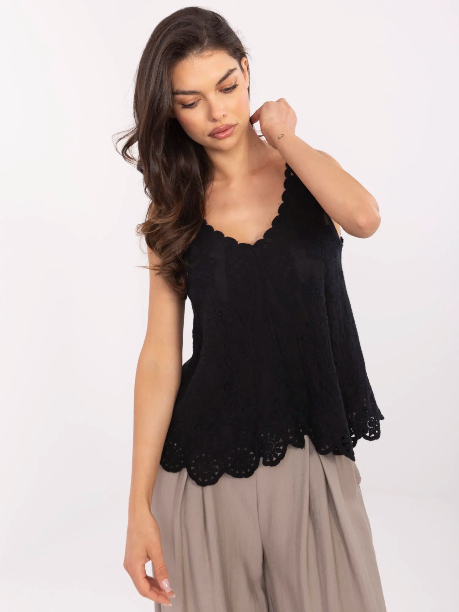 Wymiary bluzki w rozmiarze one size mierzone na płasko: szerokość pod pachami - 44 cm, długość całkowita - 64 cm, szerokość w biodrach - 58 cm.