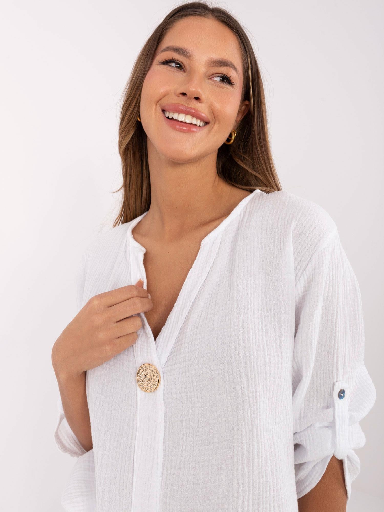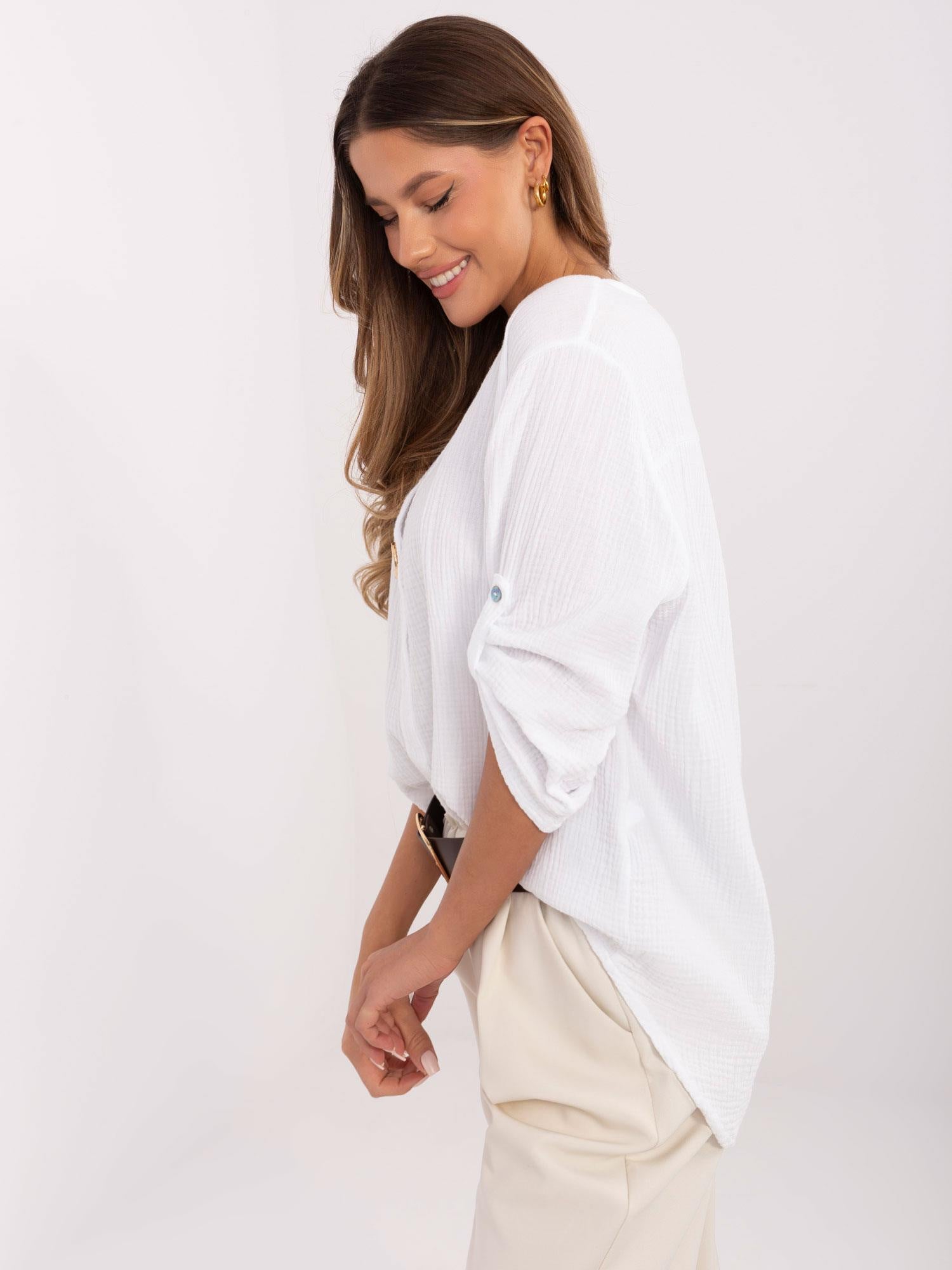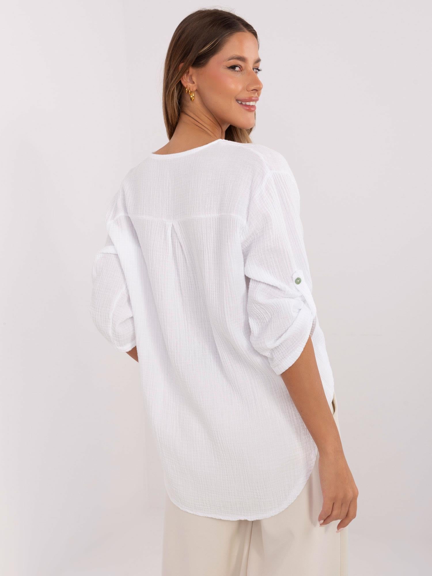 Wymiary bluzki w rozmiarze one size mierzone na płasko: szerokość pod pachami - 62 cm, długość rękawa - 45 cm (od szwu), szerokość w biodrach - 67 cm, długość całkowita - 69 cm (przód, długość całkowita - 80 cm (tył).