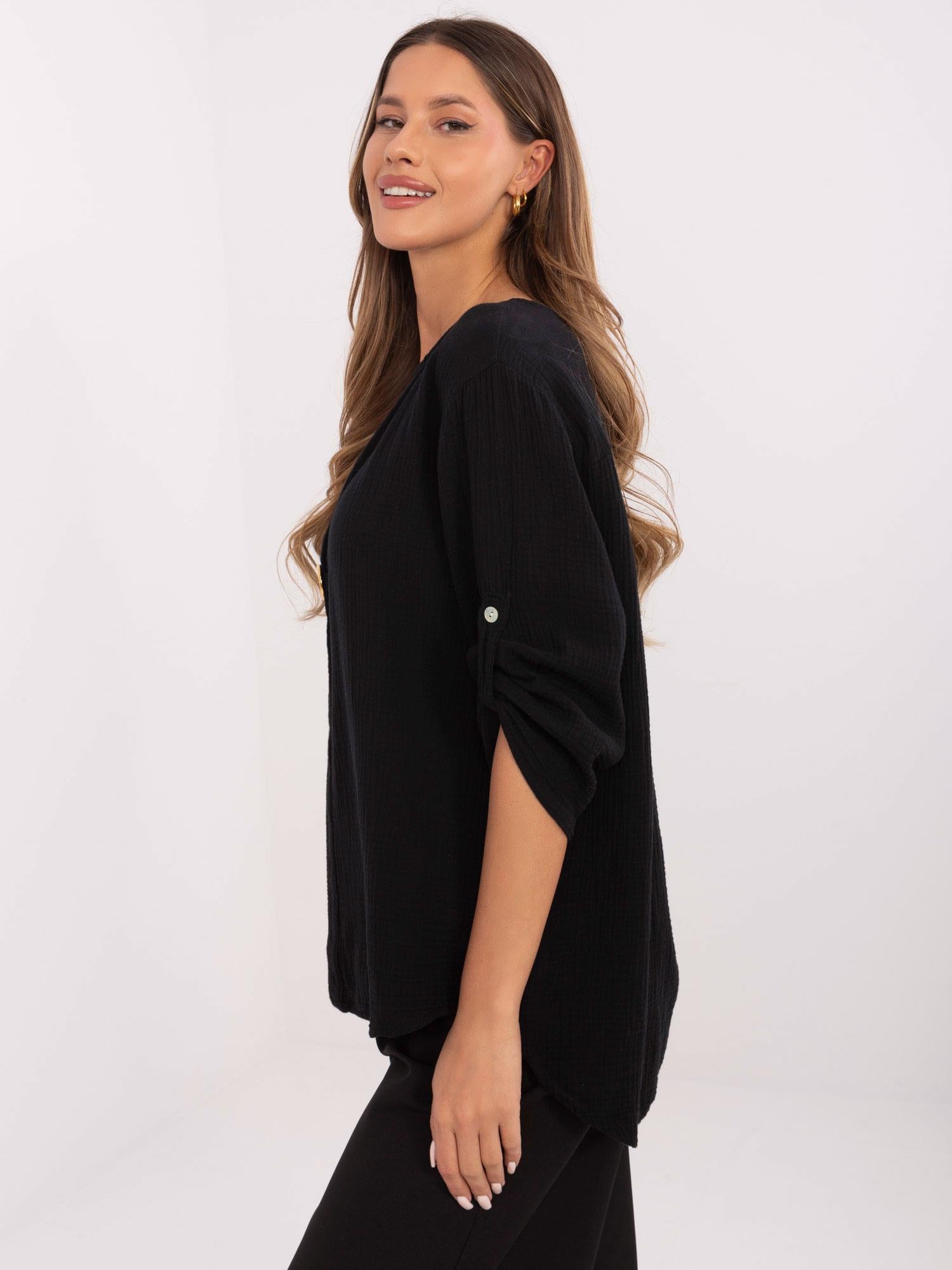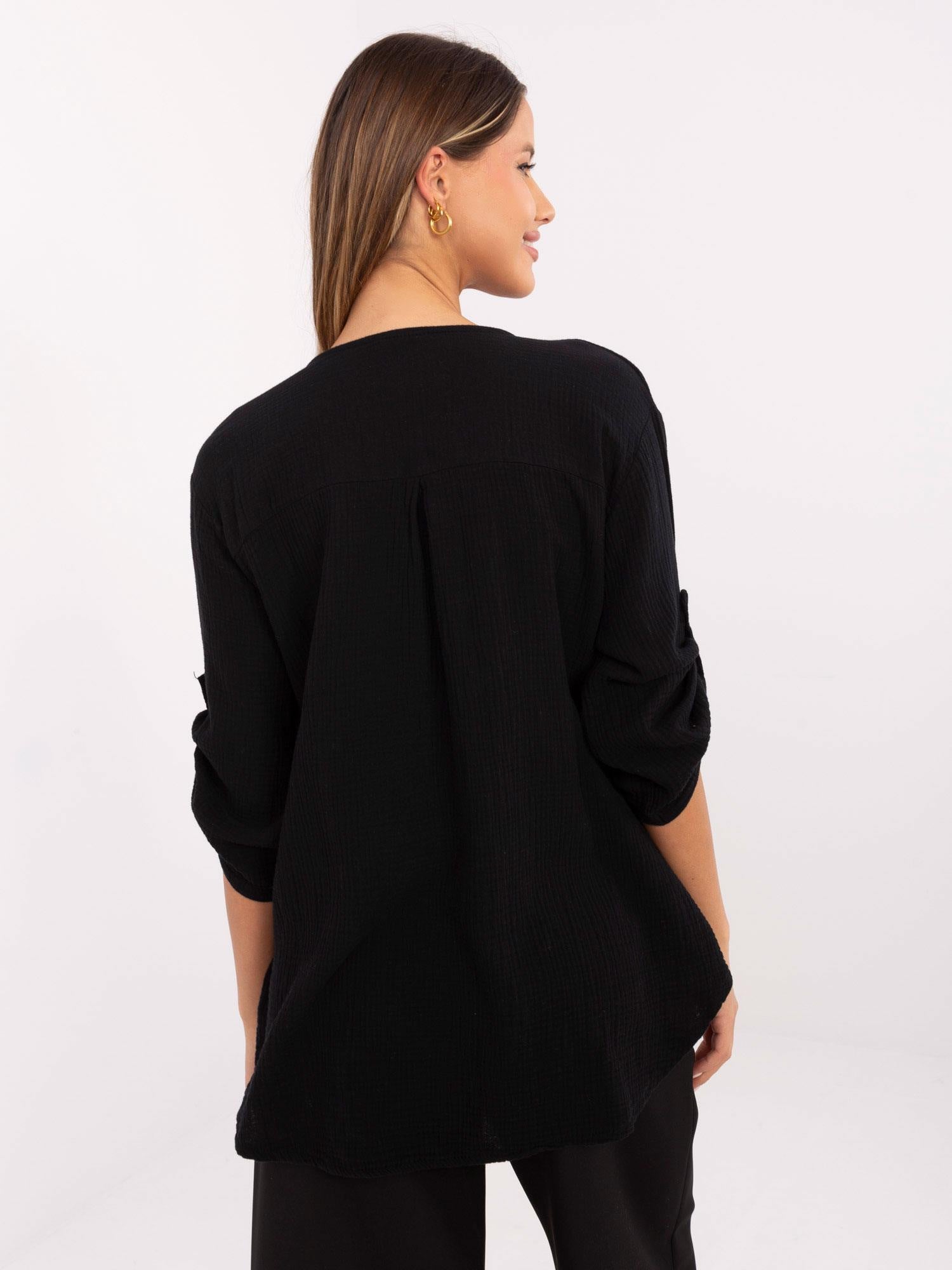 Wymiary bluzki w rozmiarze one size mierzone na płasko: szerokość pod pachami - 62 cm, długość rękawa - 45 cm (od szwu), szerokość w biodrach - 67 cm, długość całkowita - 69 cm (przód, długość całkowita - 80 cm (tył).