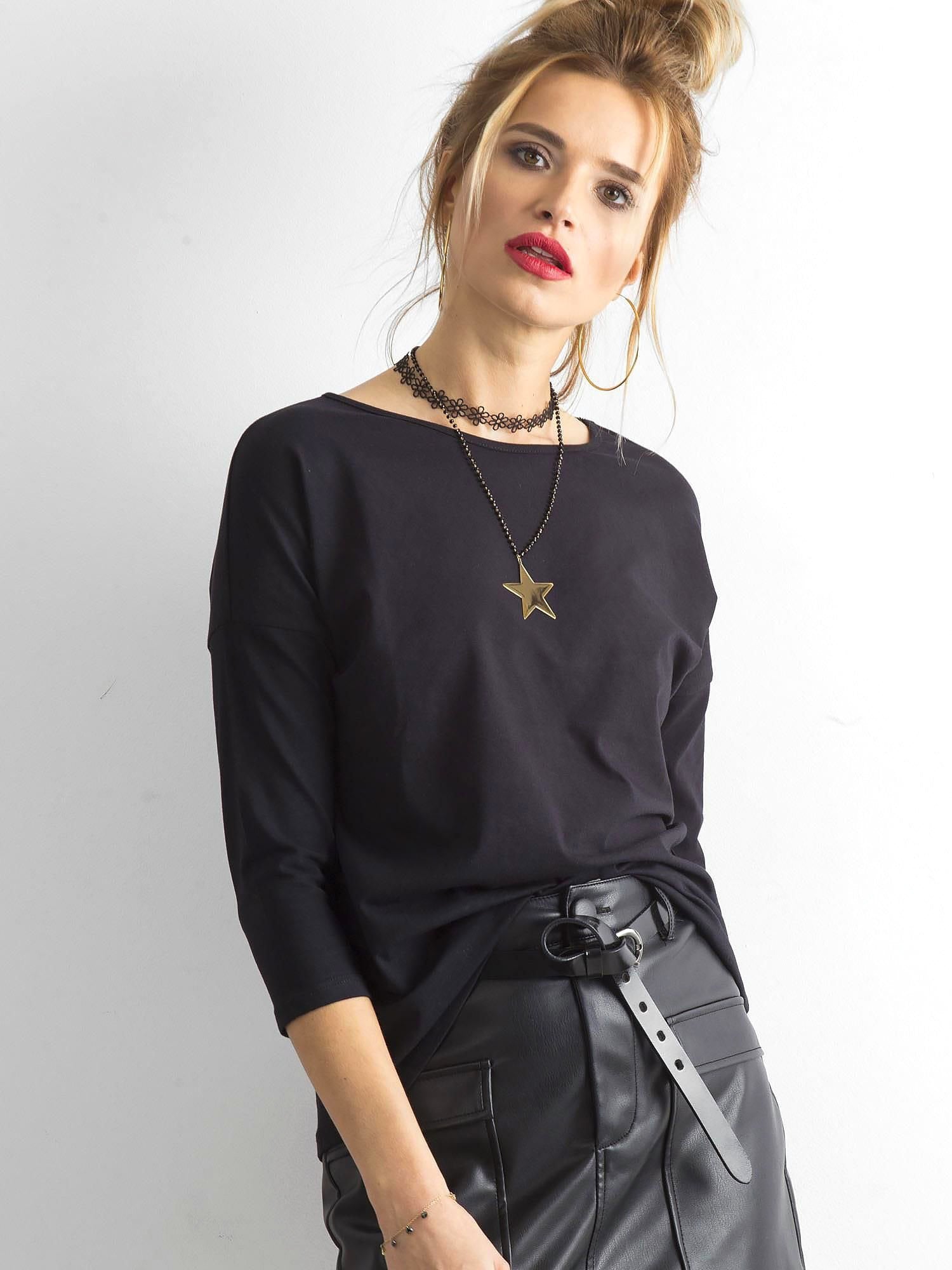 Czarna bluzka April. Gładkie ubrania bez wzorów są świetną bazą wyjściową do tworzenia wielu codziennych stylizacji. Najbardziej pożądane są oczywiście białe i czarne modele, które są w najwyższym stopniu uniwersalne i ponadczasowe, ponieważ odnoszą się do klasyki. Czarna bluzka z bawełny w stylu basic to właśnie przepis na idealny look niezależnie od okazji. Prezentowany model ma kobiecy dekolt, luźniejszy fason i supermodne rękawy 3/4, dzięki czemu wygląda na sylwetce bardzo szykownie i jest niezwykle wygodny w noszeniu. Pasuje do niej wiele innych ubrań, dlatego możesz stworzyć z nią zestawy typowo casualowe, a także nieco bardziej kobiece stroje. Nasza czarna bluzka damska zrobiona jest z trwałych i mocnych materiałów, które są przewiewne i jednocześnie przyjemne w dotyku. Noś ją do modnych spodni i szortów oraz kobiecych spódnic.