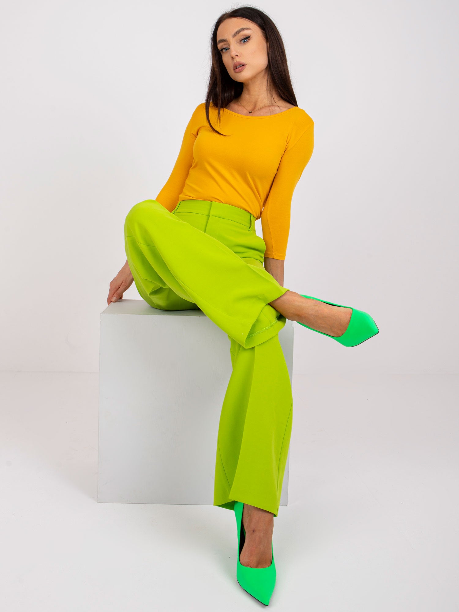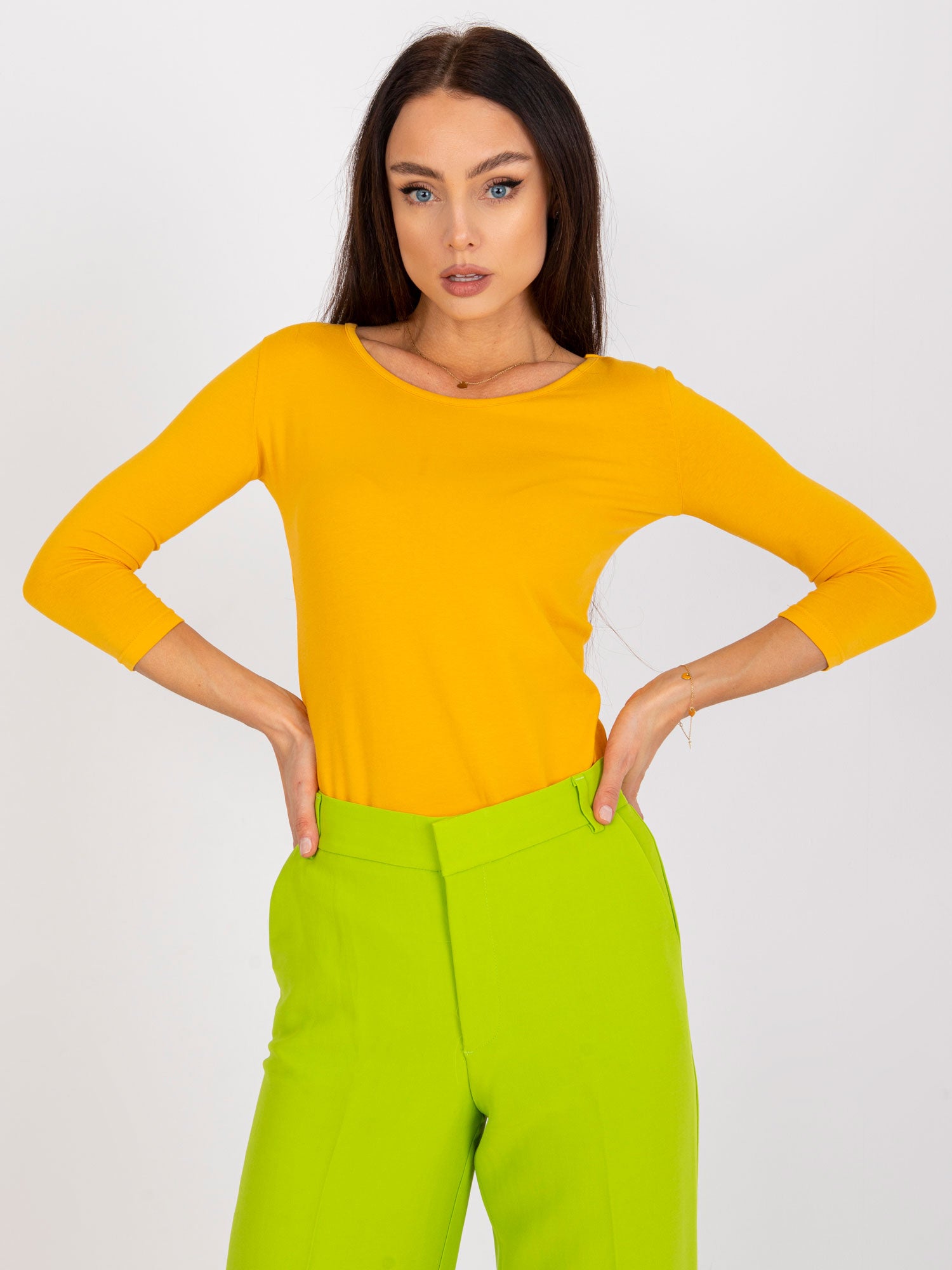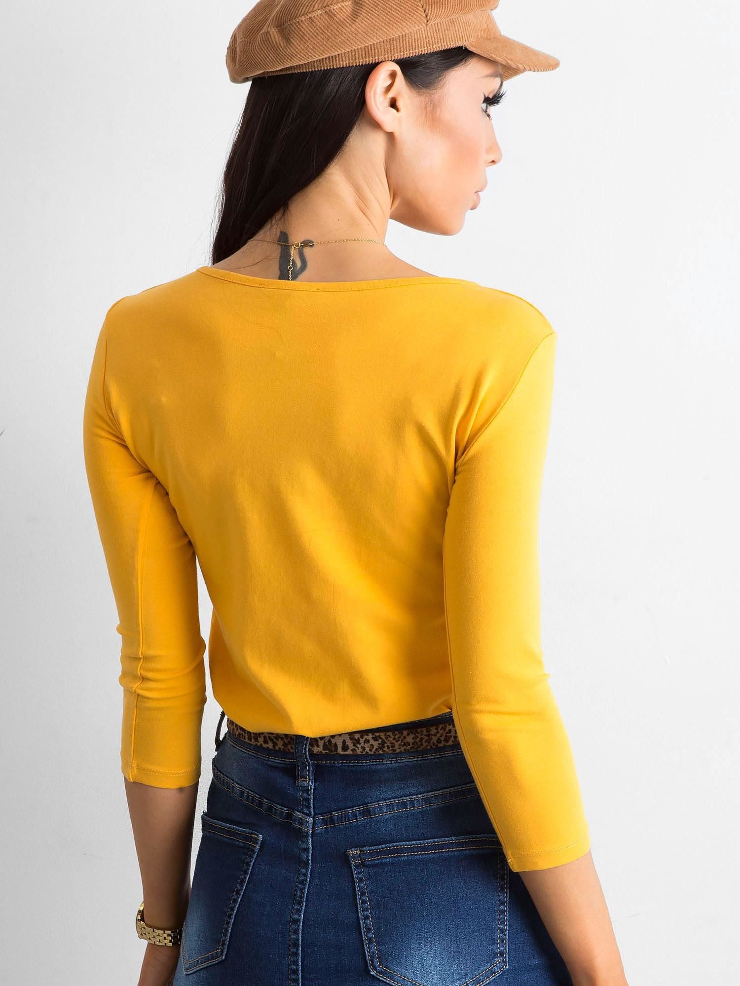 Ciemnożółta bluzka bawełniana Mona . Gładkie bluzki bawełniane to prawdziwy skarb w każdej kobiecej szafie. Są uniwersalne, modne i ponadczasowe, zapewniają zawsze doskonały look bez względu na okazje. Ta bluzka basic reprezentuje klasyczny styl minimalistyczny, tak bardzo modny w tym sezonie. Ma głębiej wycięty okrągły dekolt oraz rękaw długości 3/4, co idealnie wpisuje ją w czołówkę wygodnej odzieży. Gładka bawełniana przędza jest przewiewna, więc pozwala skórze swobodnie oddychać, a dopasowany do ciała fason pięknie podkreśla sylwetkę. Taka bluzka damska jest doskonała do noszenia na co dzień do spodni jeansowych, materiałowych oraz modnych spódnic z naszej kolekcji online.