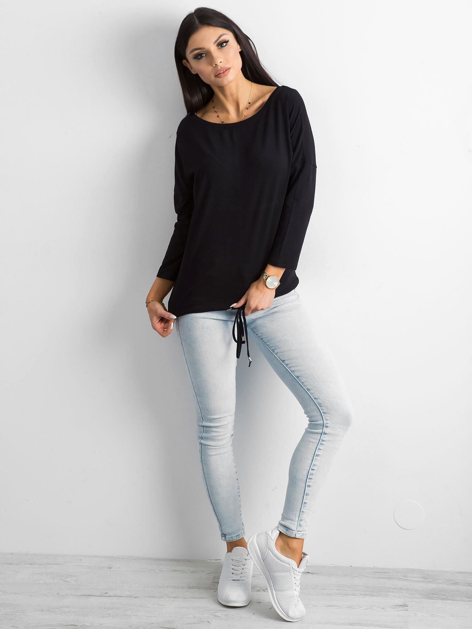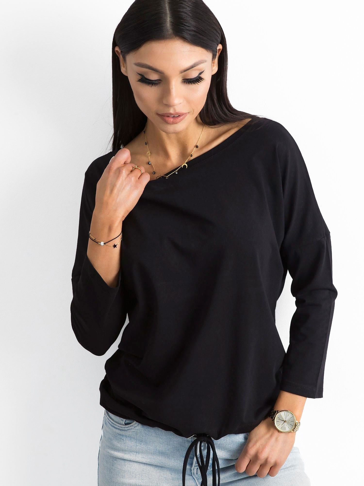 Czarna bluzka bawełniana to bez dyskusji podstawowy element garderoby każdej kobiety ceniącej najnowsze trendy oraz minimalistyczny sposób ubierania się. Jest więc absolutnym must have'em, który powinna mieć w szafie każda z Was. Prezentowany model z serii Fiona oprócz kobiecego dekoltu posiada również modne rękawy 3/4 oraz subtelny ściągacz na dole zakończony dwoma troczkami. Takie pozornie nieistotne detale pięknie podkręcają wygląd bluzki basic, nie odbierając jej jednocześnie minimalistycznego charakteru. Ponadto ta czarna bluzka basic ma również trochę luźniejszy fason, który wygodnie układa się na sylwetce, tuszuje mniejsze mankamenty figury oraz jest bardzo komfortowy w noszeniu. Taki design czyni z niej najlepszy wybór na co dzień, ponieważ gwarantuje uniwersalność i idealne dopasowanie do wszystkich pozostałych elementów garderoby. Jeśli potrzebujesz innych kolorów bluzki basic z tego modelu, to przejrzyj całą gamę dostępnych odcieni i wybierz już teraz swojego faworyta!