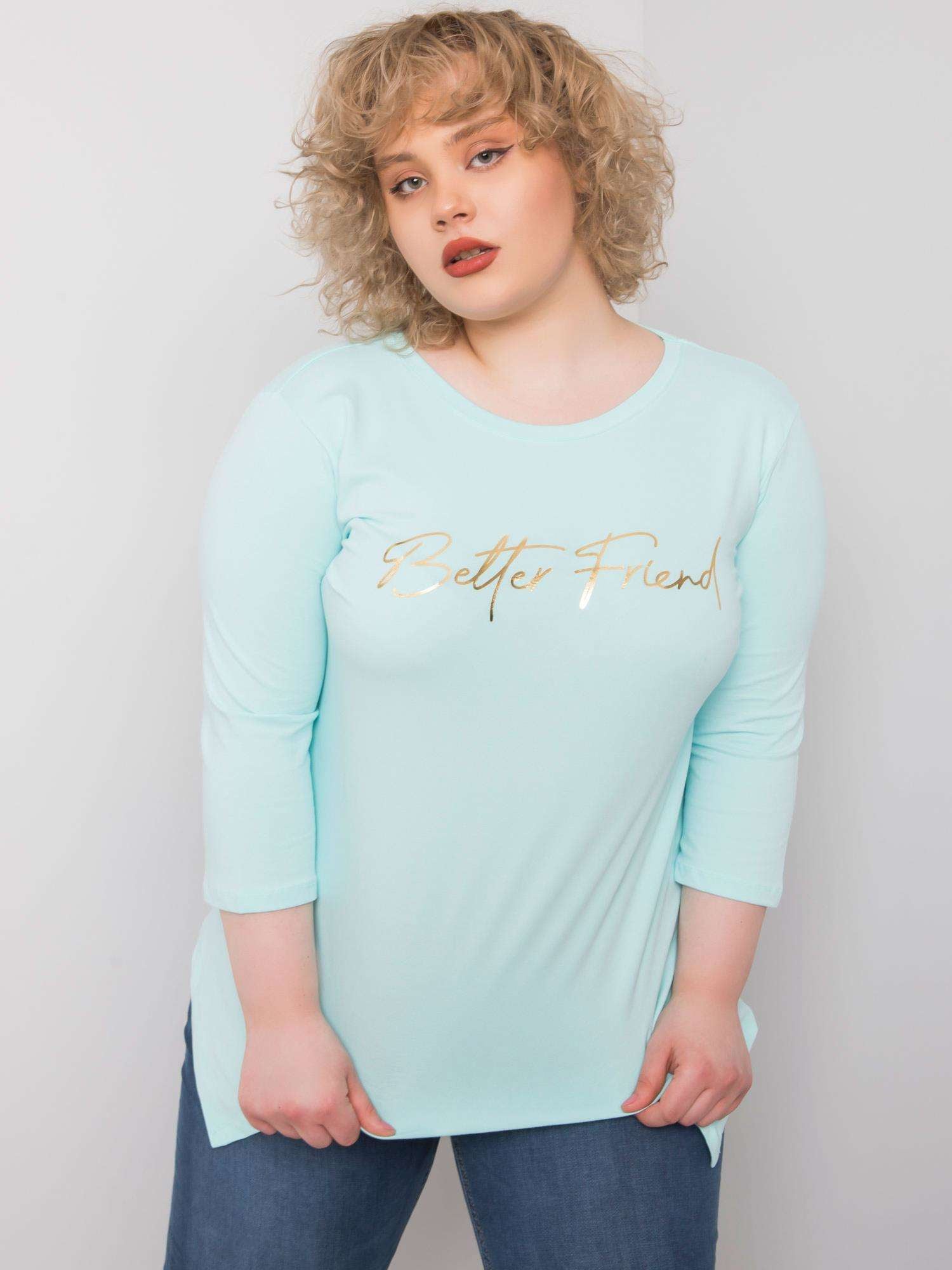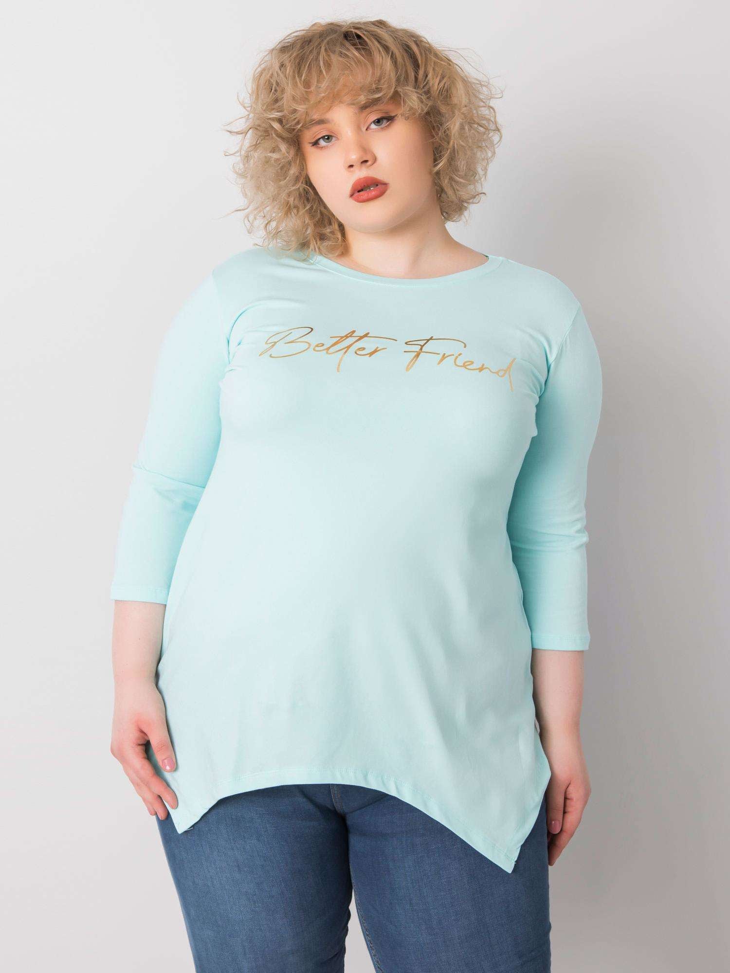Jasnoniebieska bluzka z napisem.