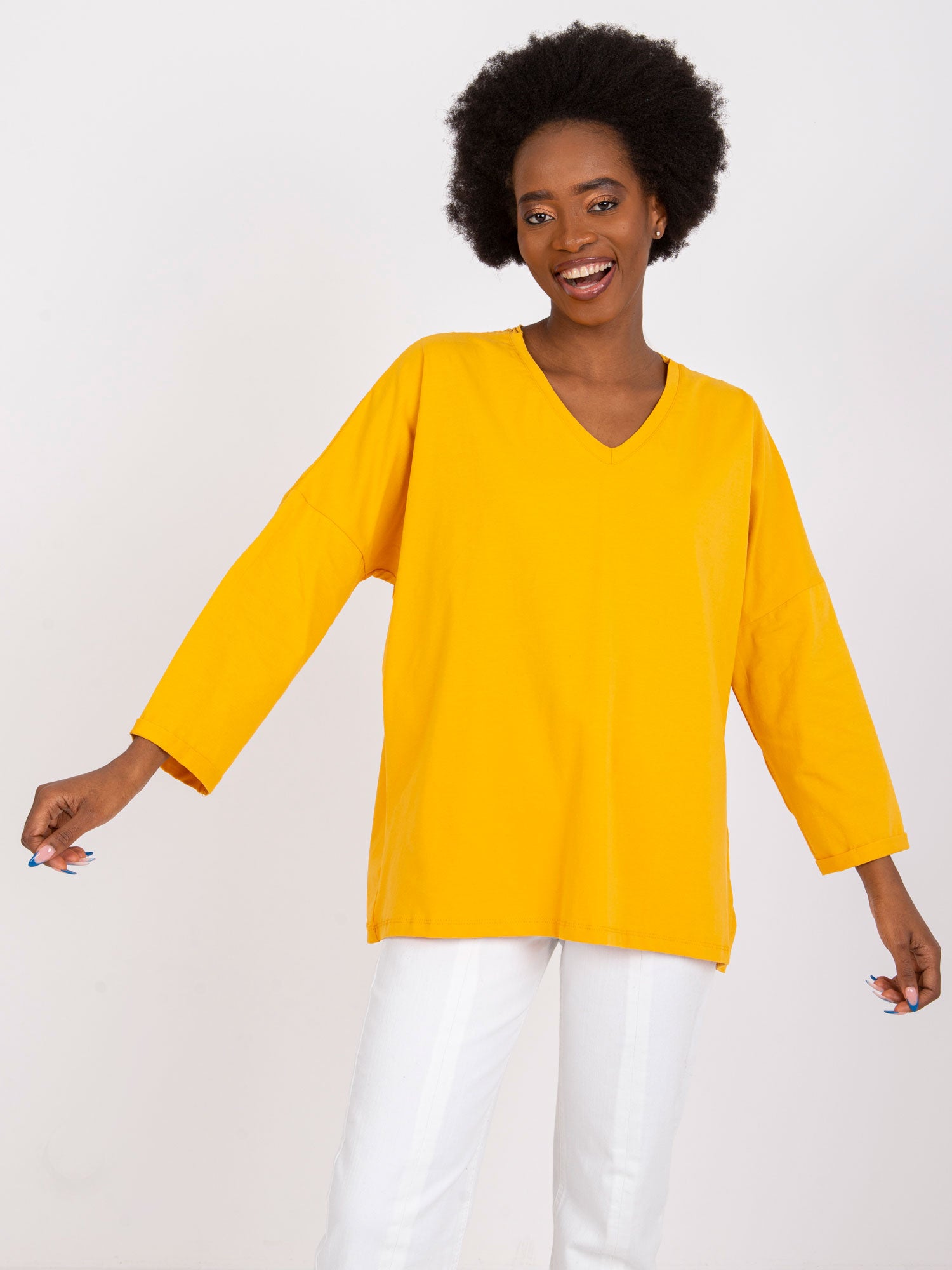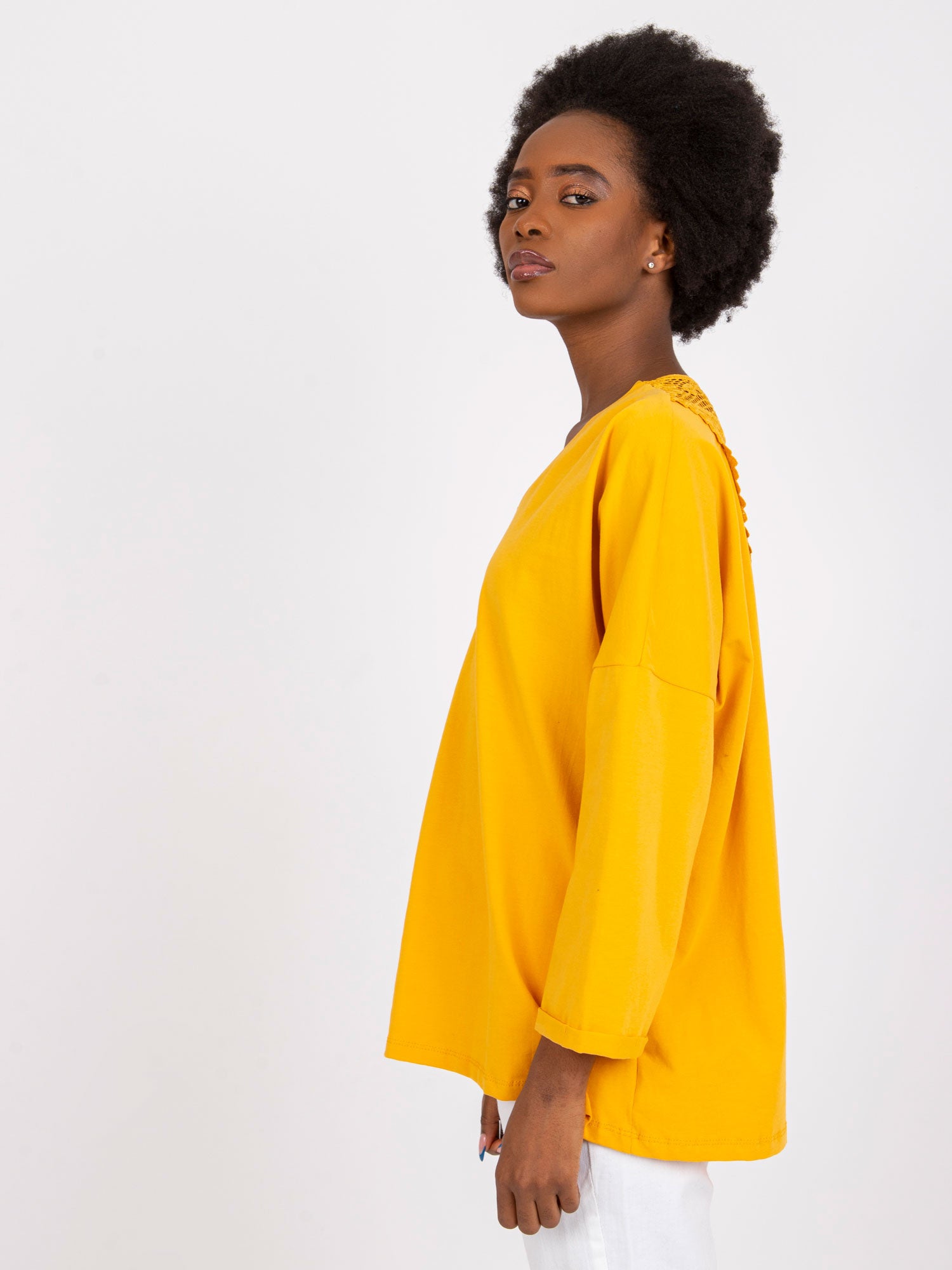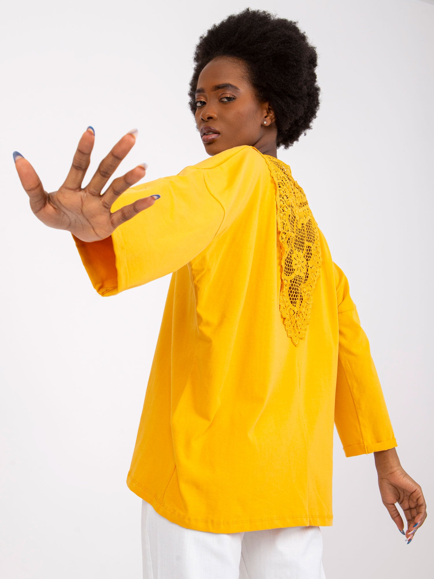 Wymiary bluzki w rozmiarze S/M mierzone na płasko: szerokość pod pachami - 60 cm, długość całkowita - 63 cm, długość rękawa - 46 cm.