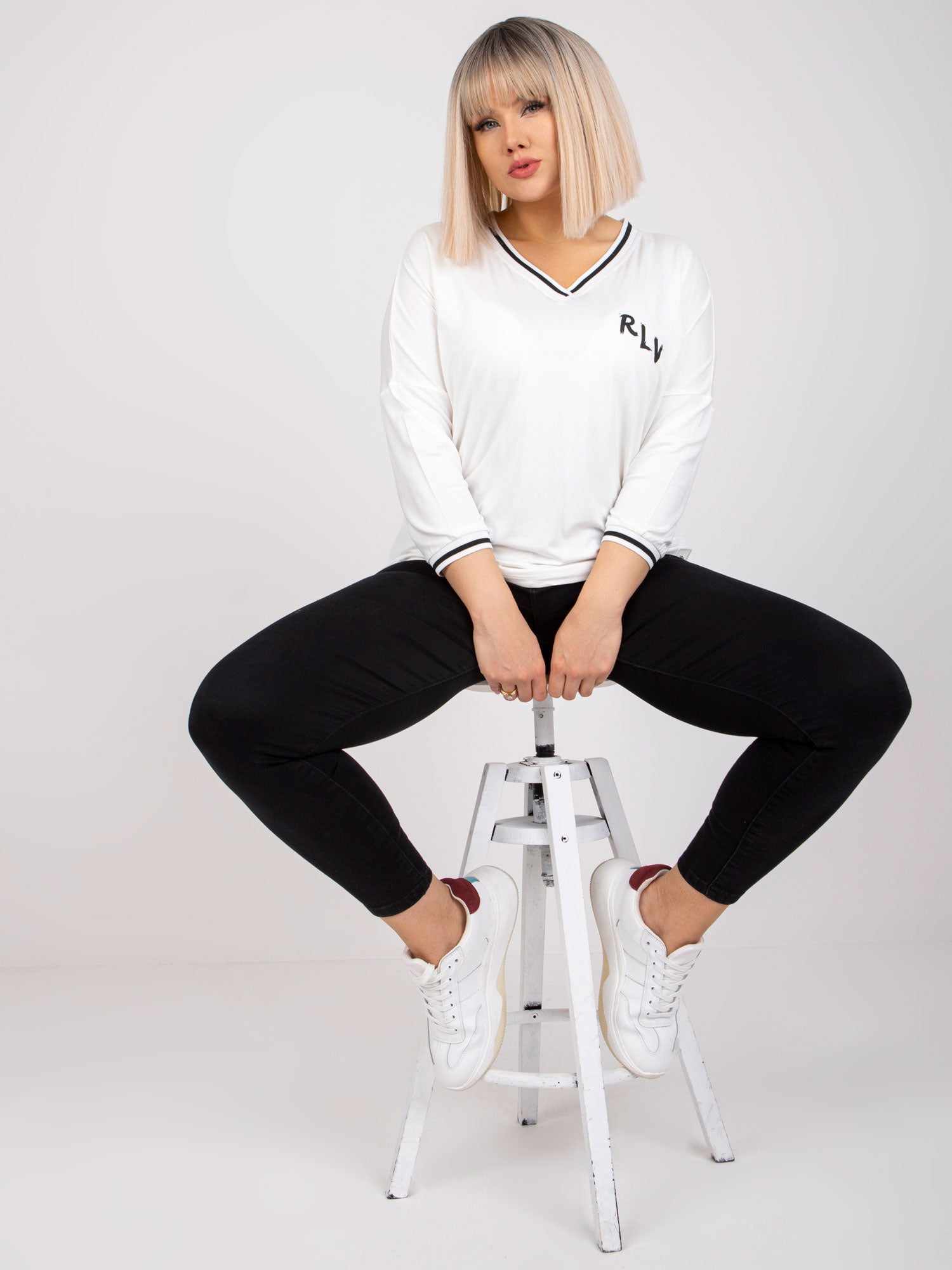 Wymiary bluzki w rozmiarze one size mierzone na płasko: szerokość pod pachami - 63 cm, długość całkowita (przód) - 63 cm, długość całkowita (tył) - 69 cm, długość rękawa - 46 cm.