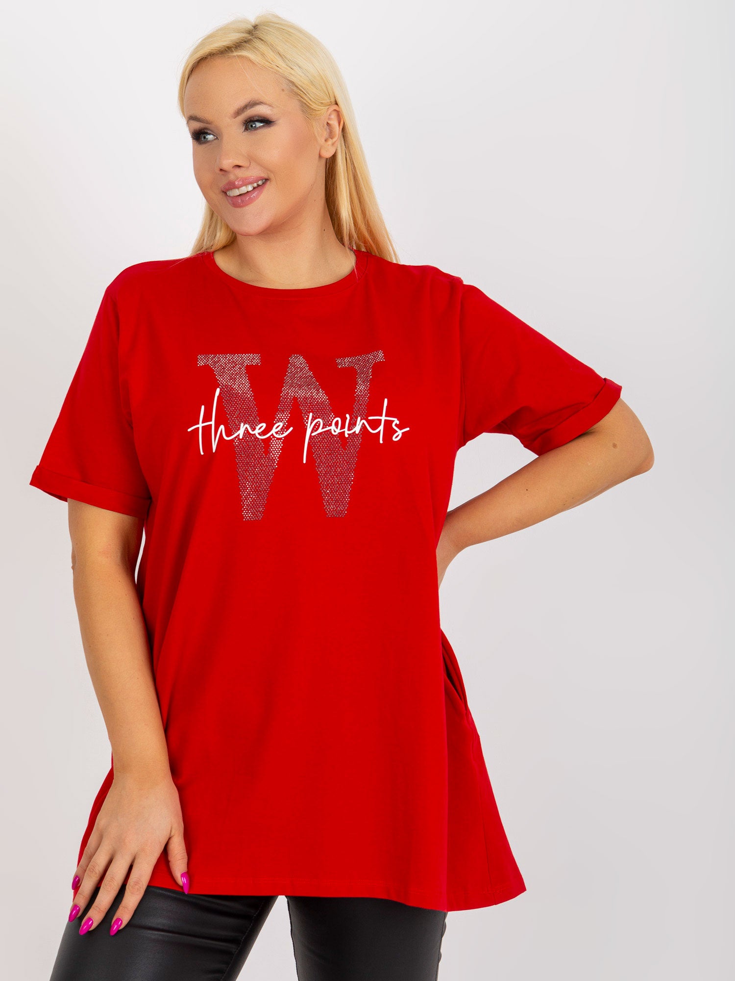Modelka ma na sobie rozmiar one size Wymiary modelki: wzrost 172 cm, biust 103 cm, talia 73 cm, biodra 103 cm.