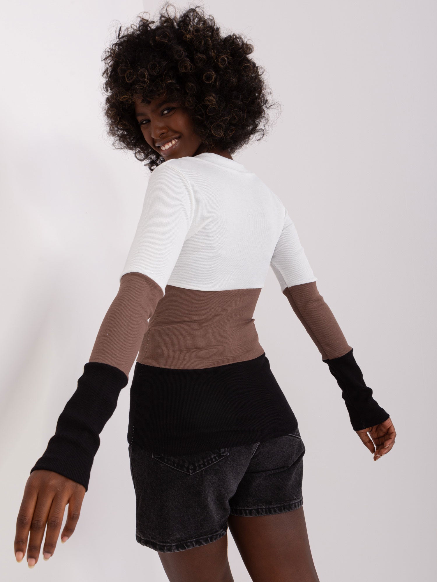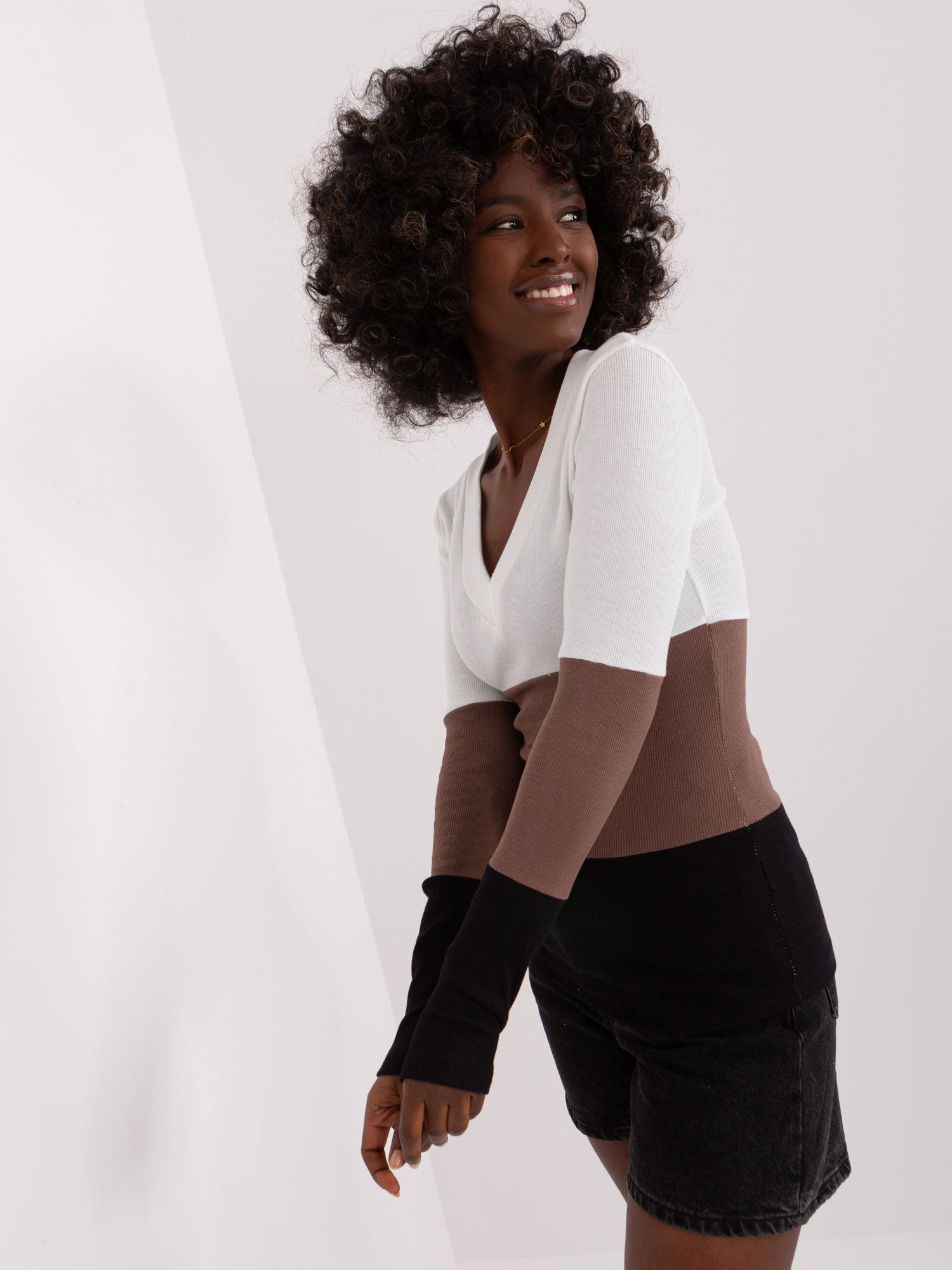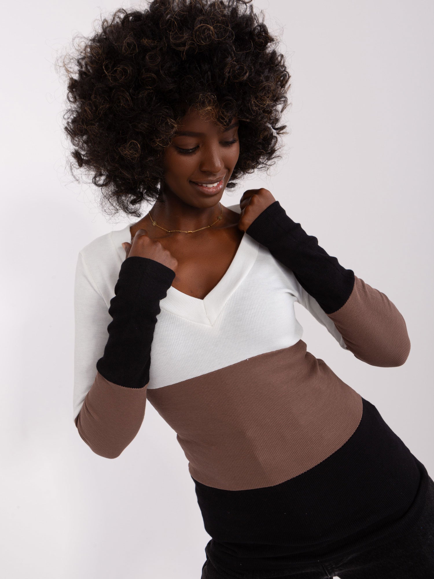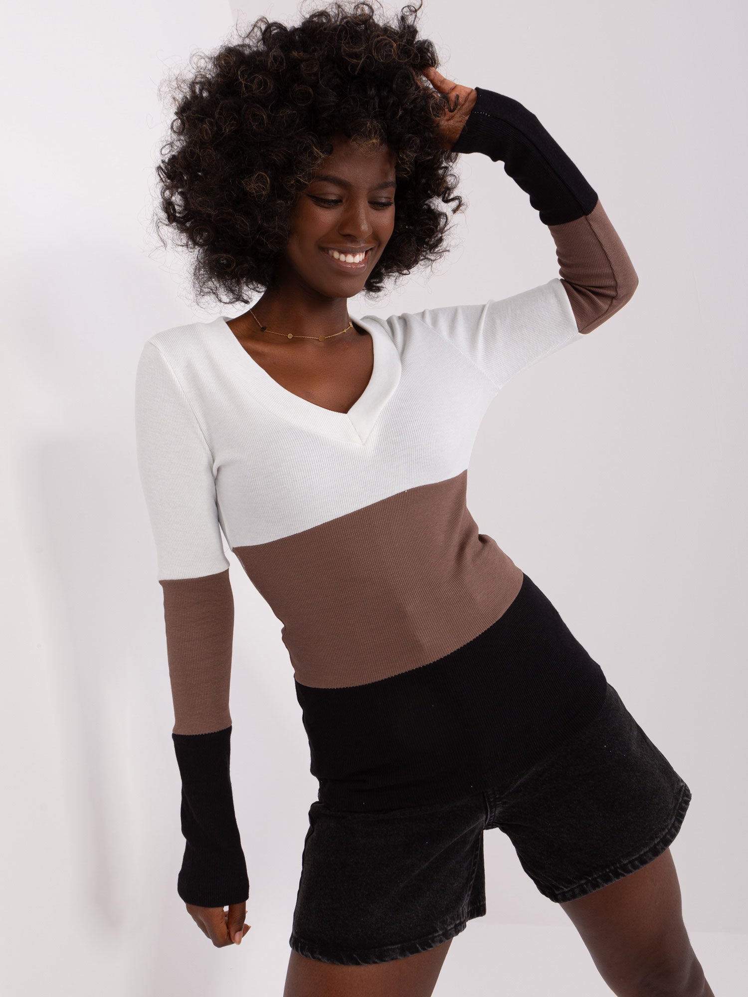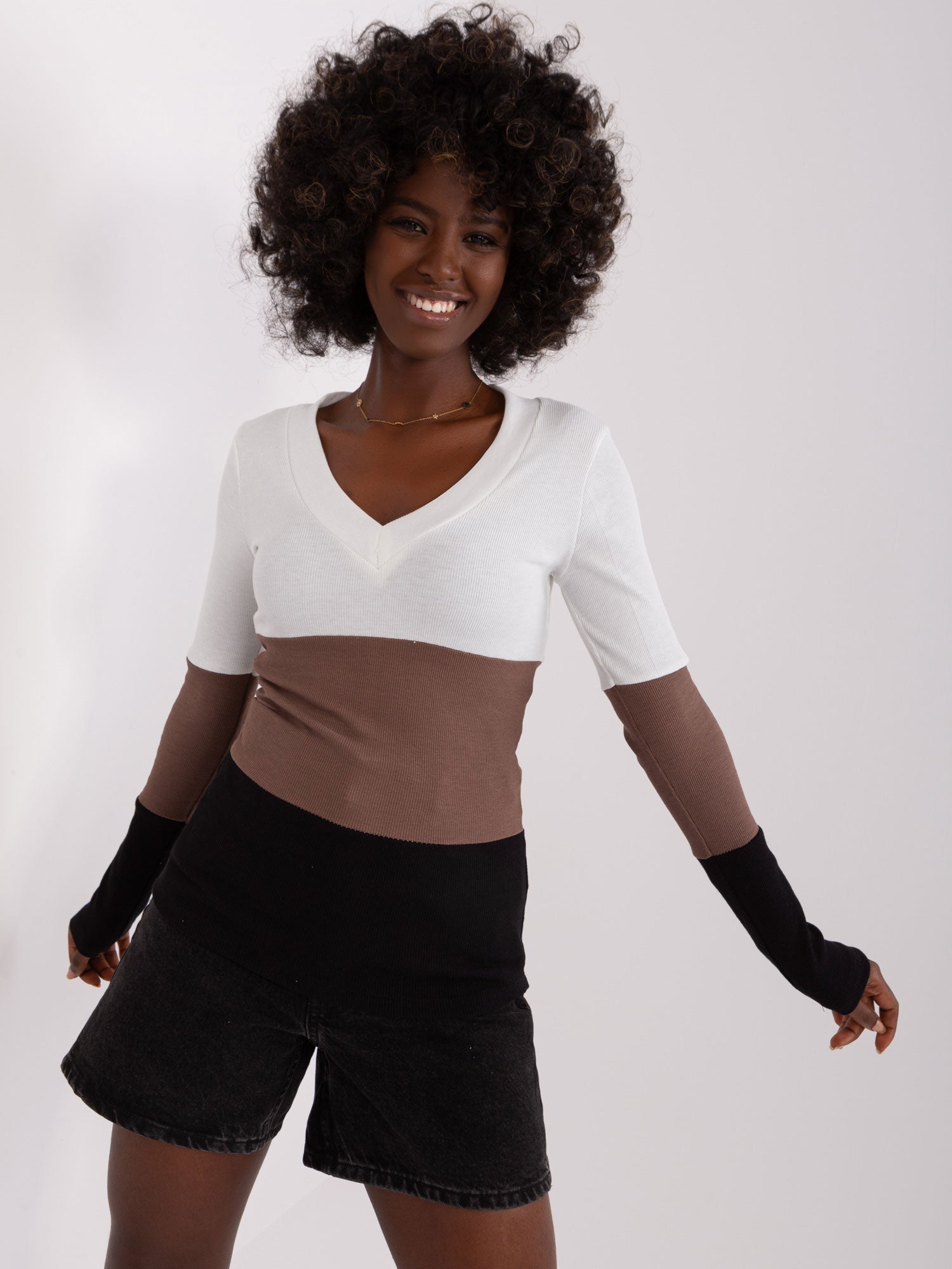 Ecru-czarna damska bluzka basic z dekoltem V .