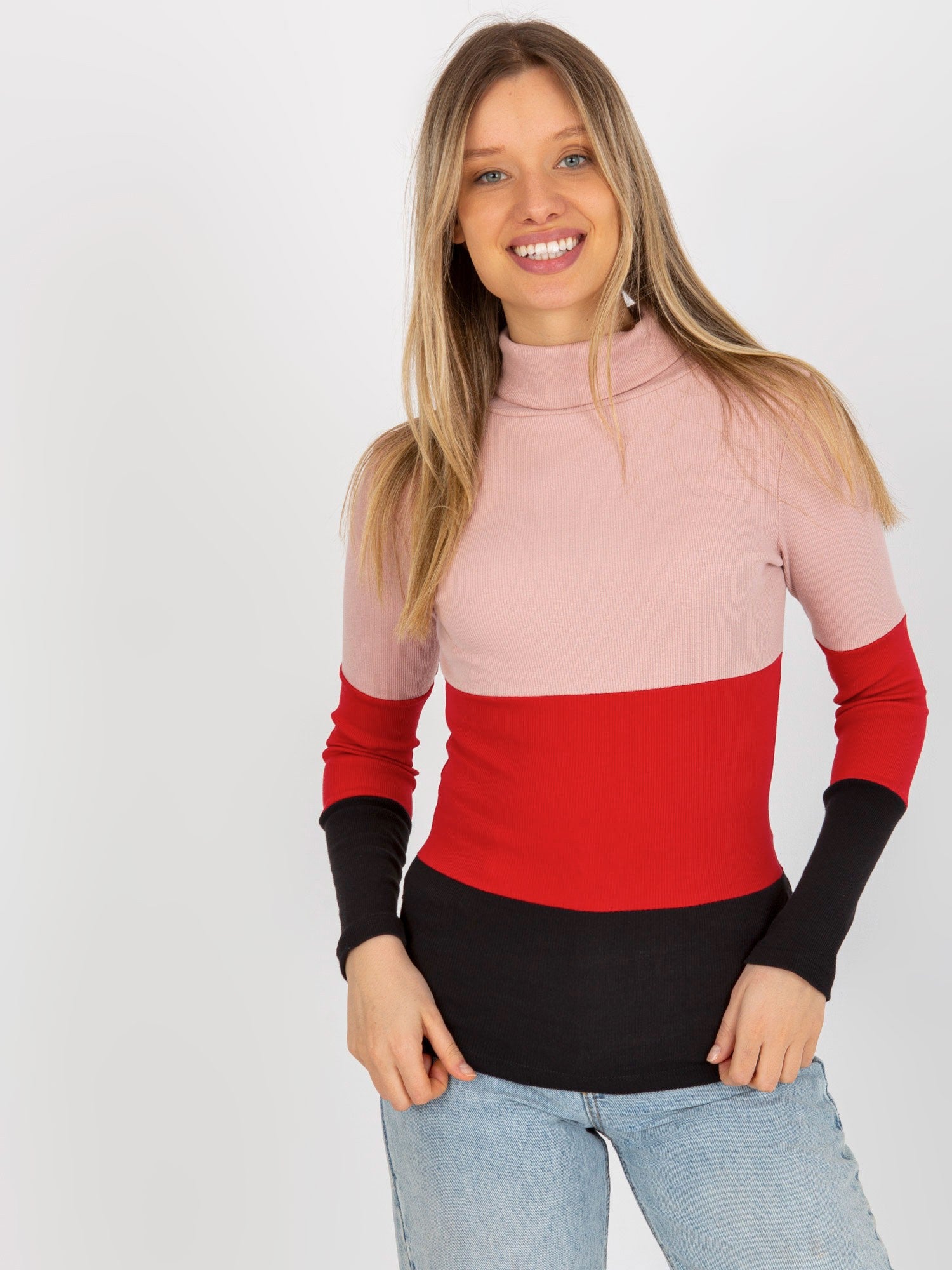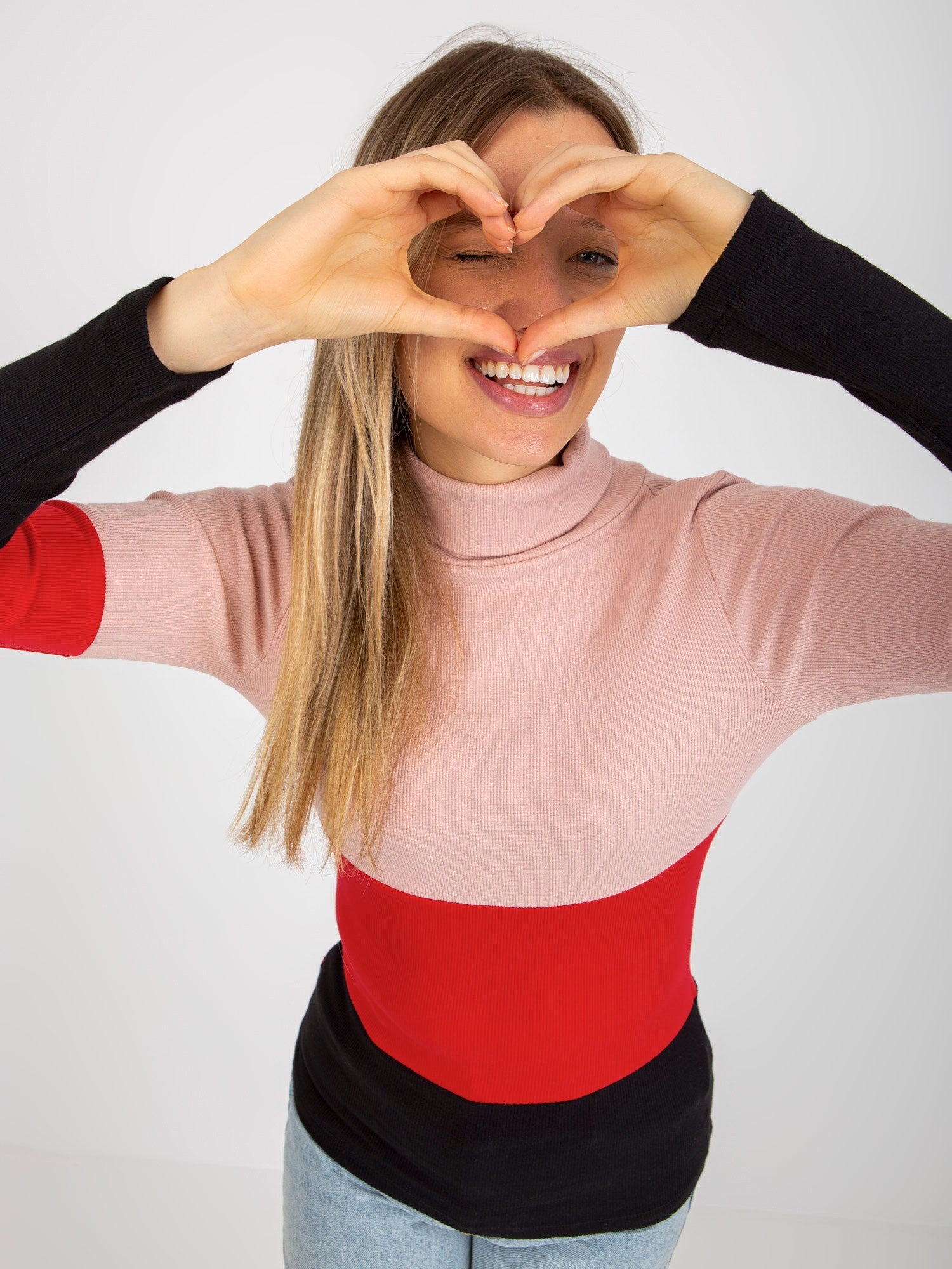 Jasnoróżowo-czarna bluzka basic z golfem w prążek .