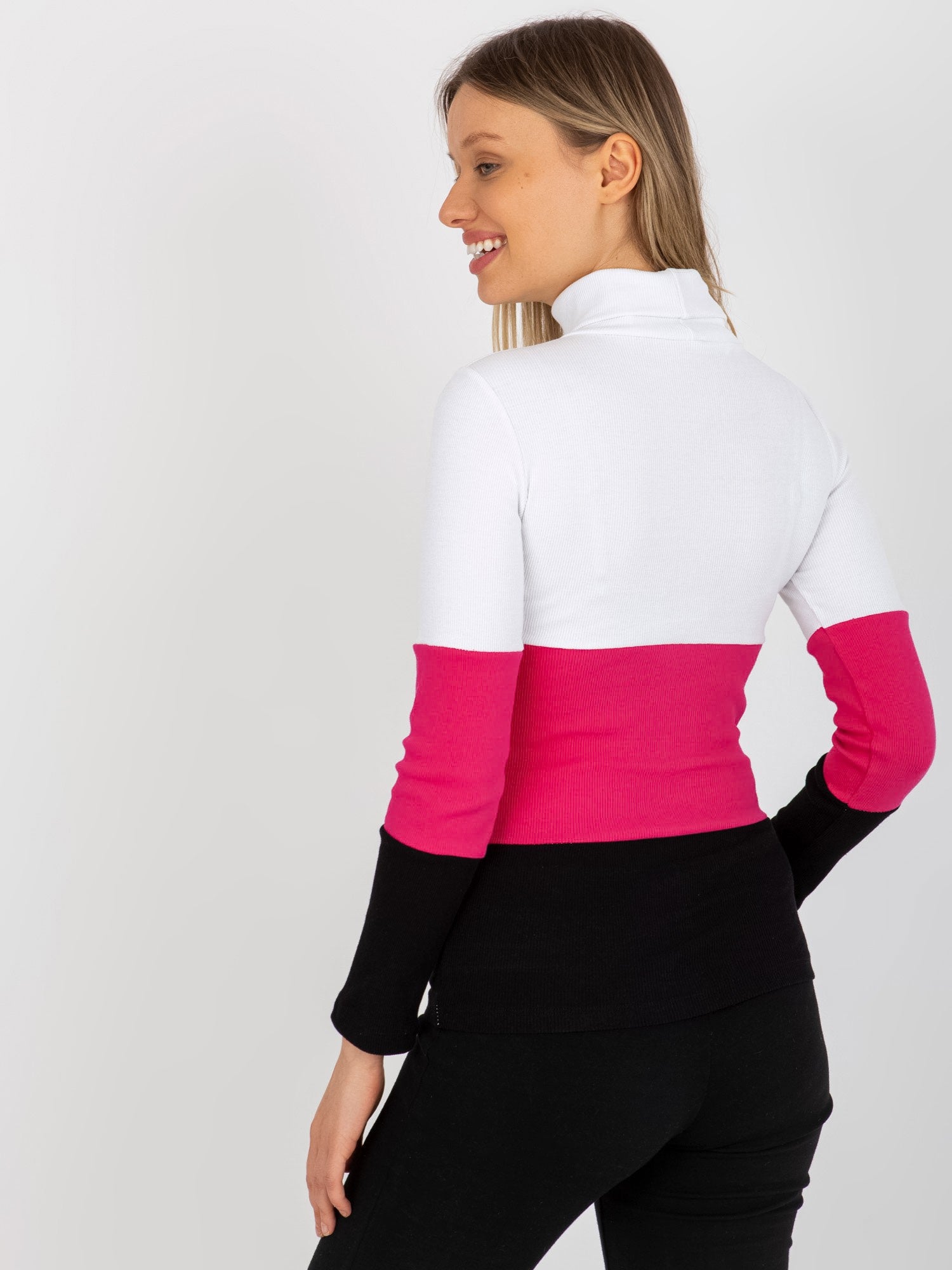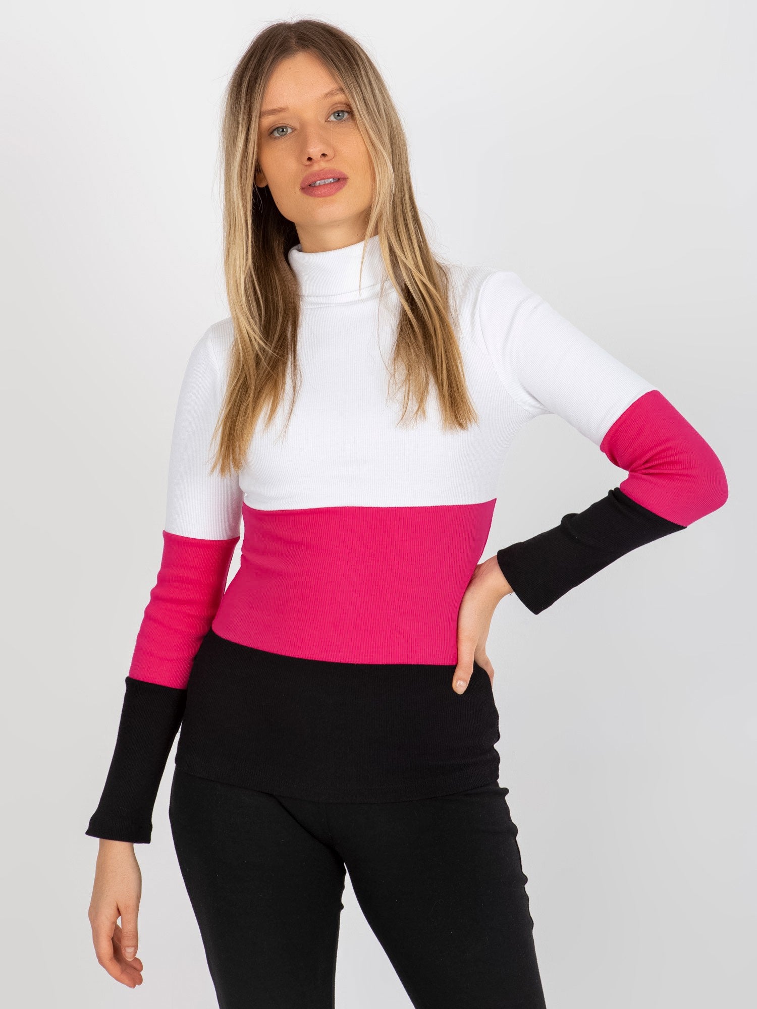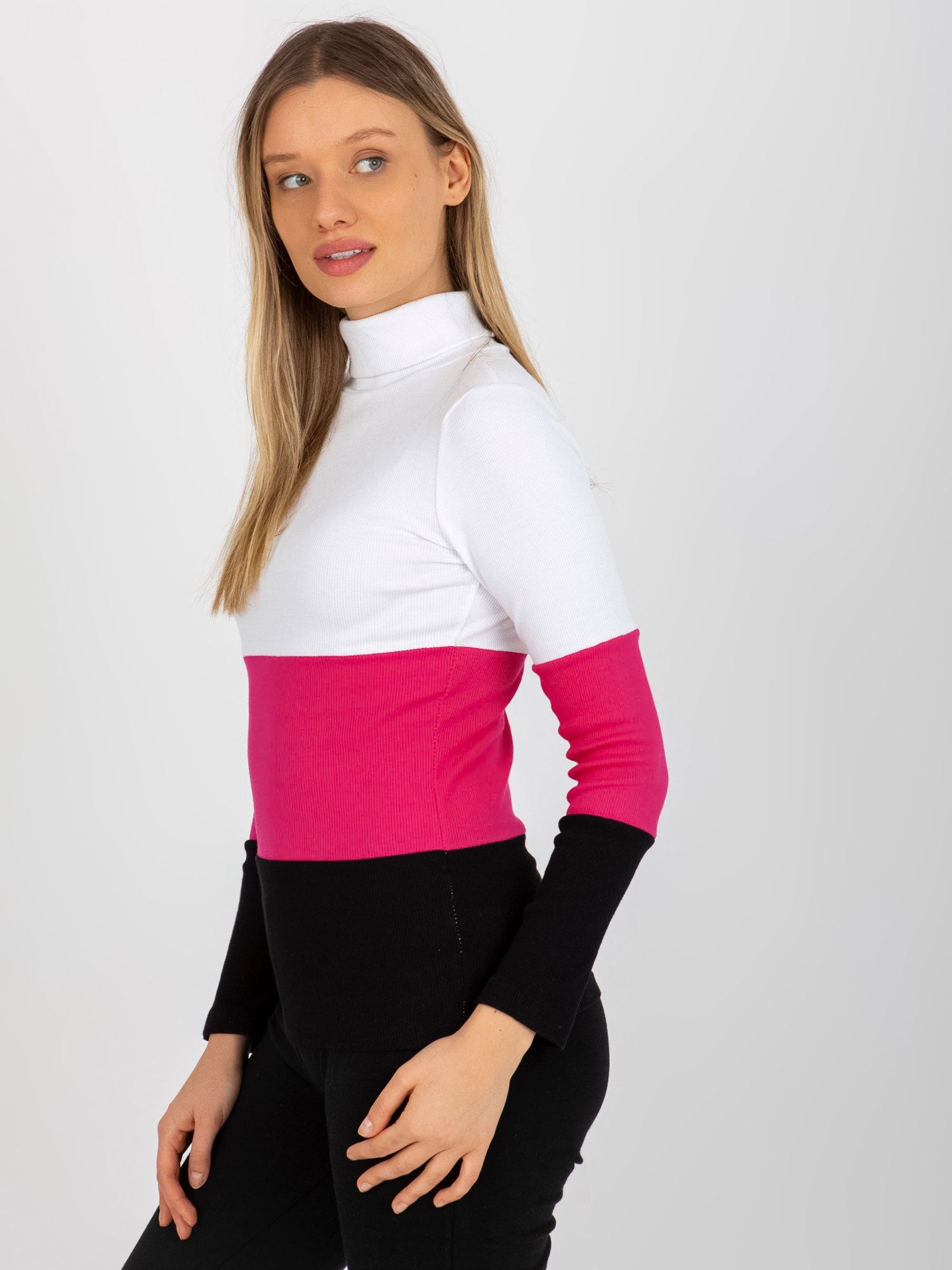 Ecru-fuksjowa bawełniana bluzka basic z golfem w prążek .