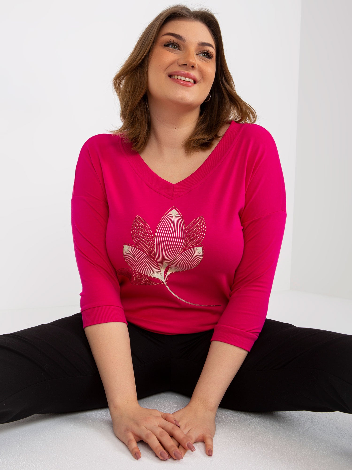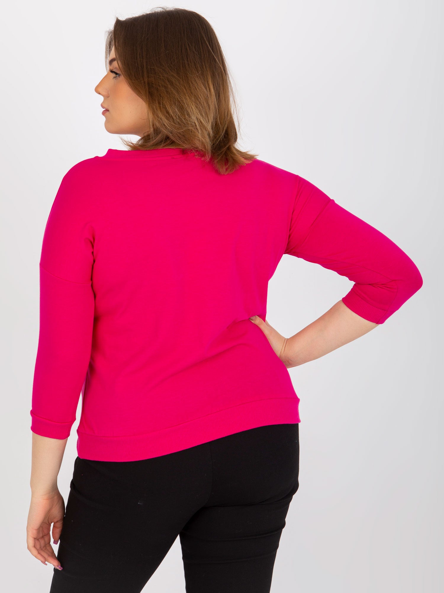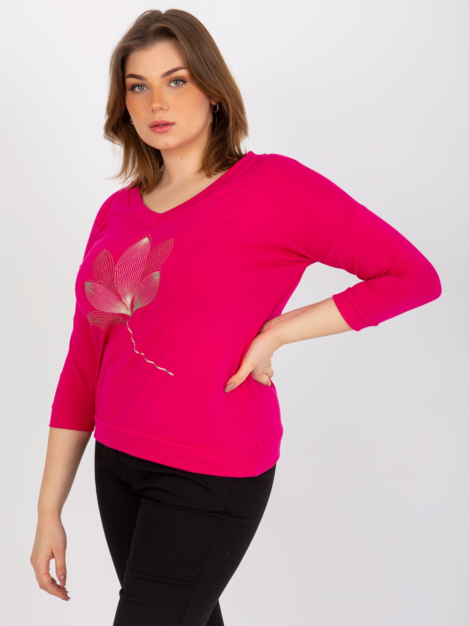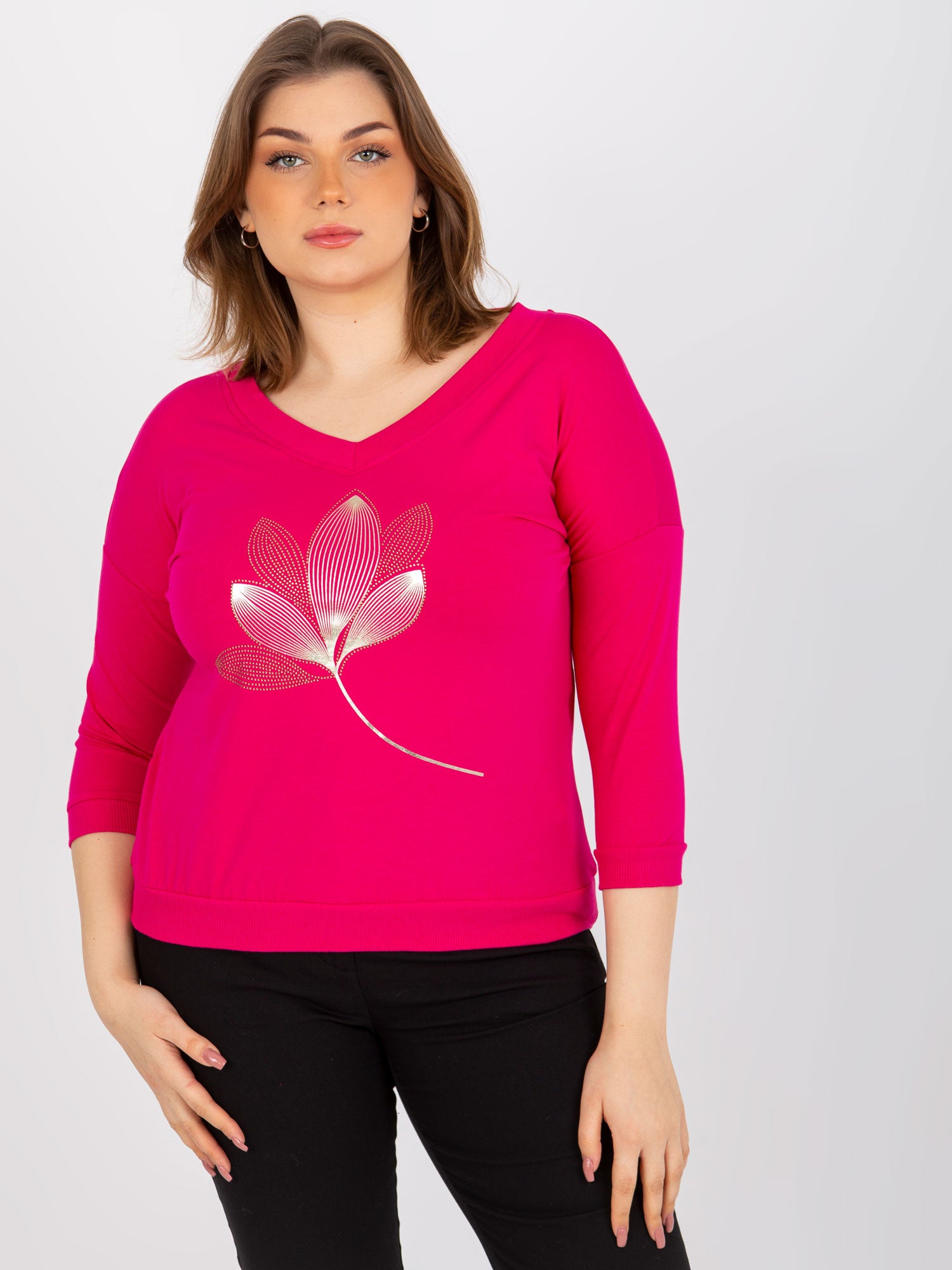 Fuksjowa bluzka plus size z dekoltem V .
