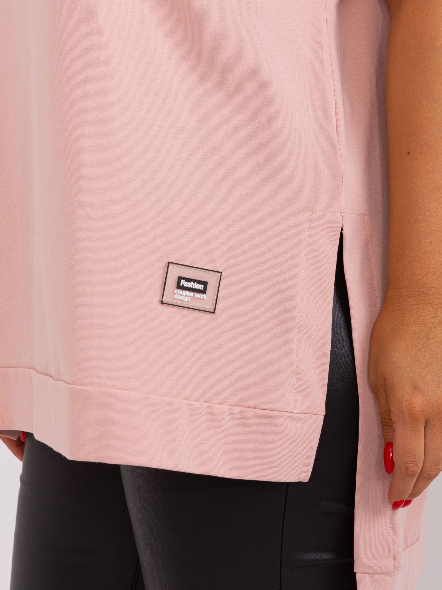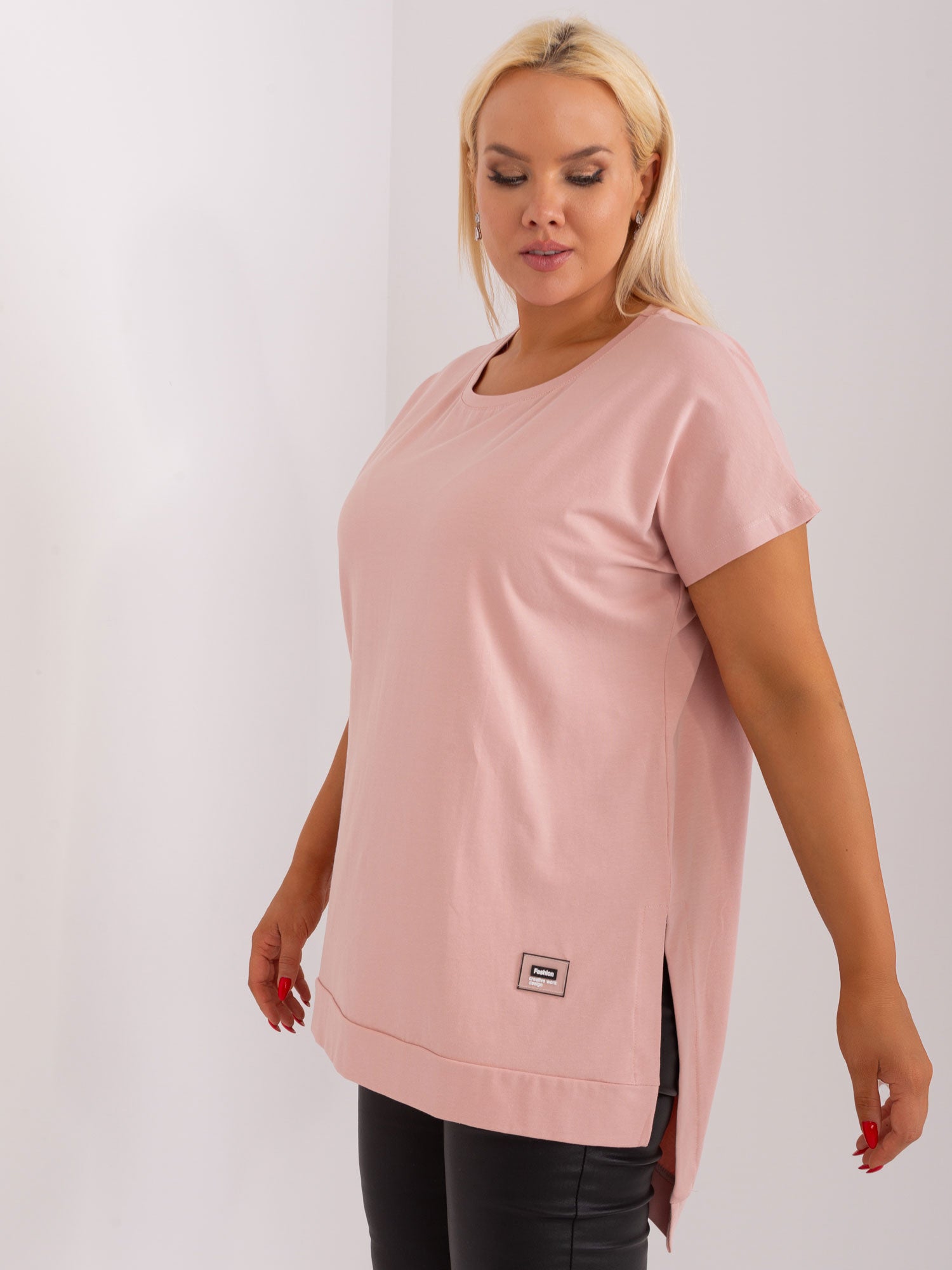 Brudnoróżowa bluzka plus size z bocznymi rozcięciami.