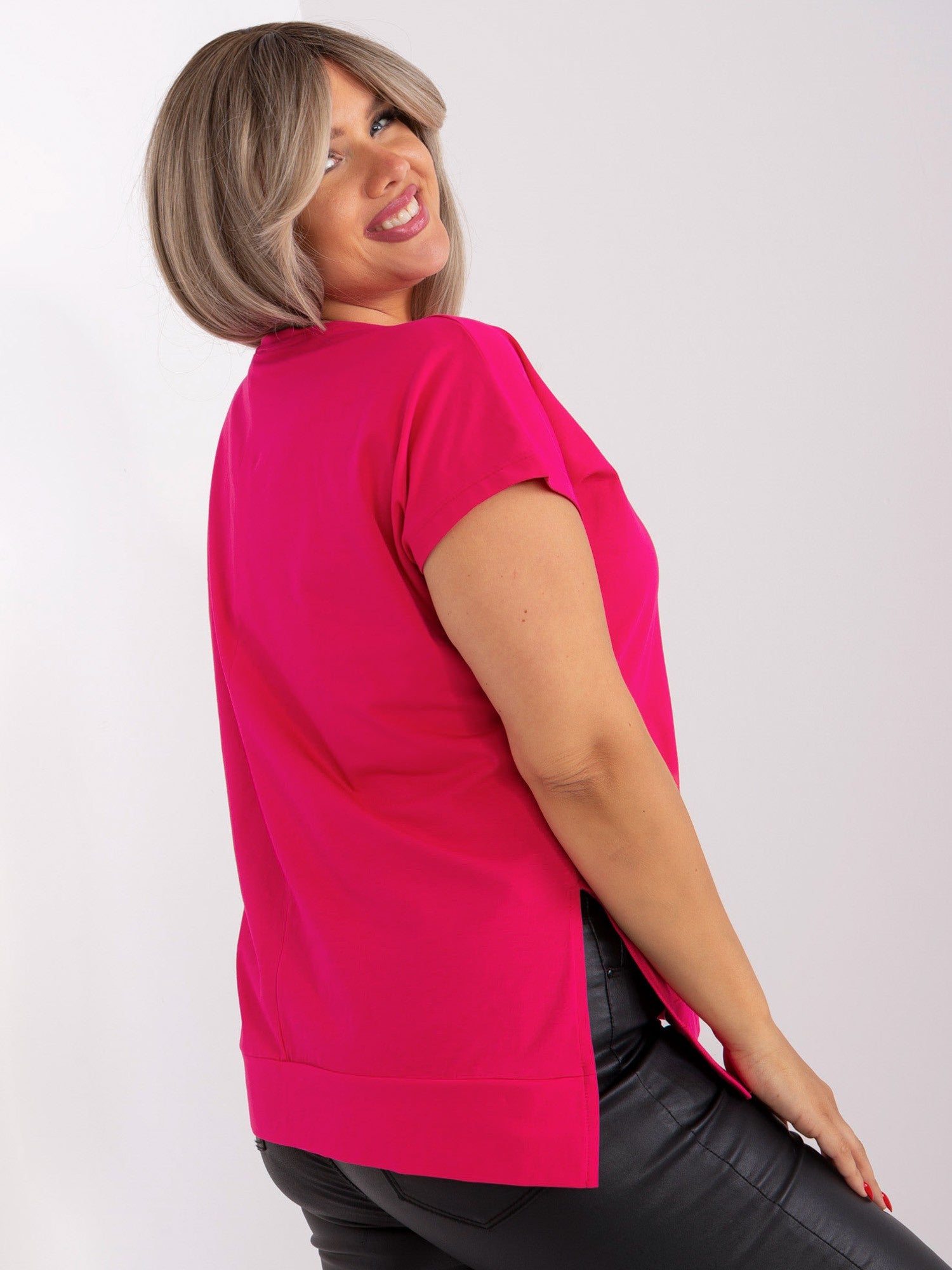 Fuksjowa bluzka plus size z krótkim rękawem .