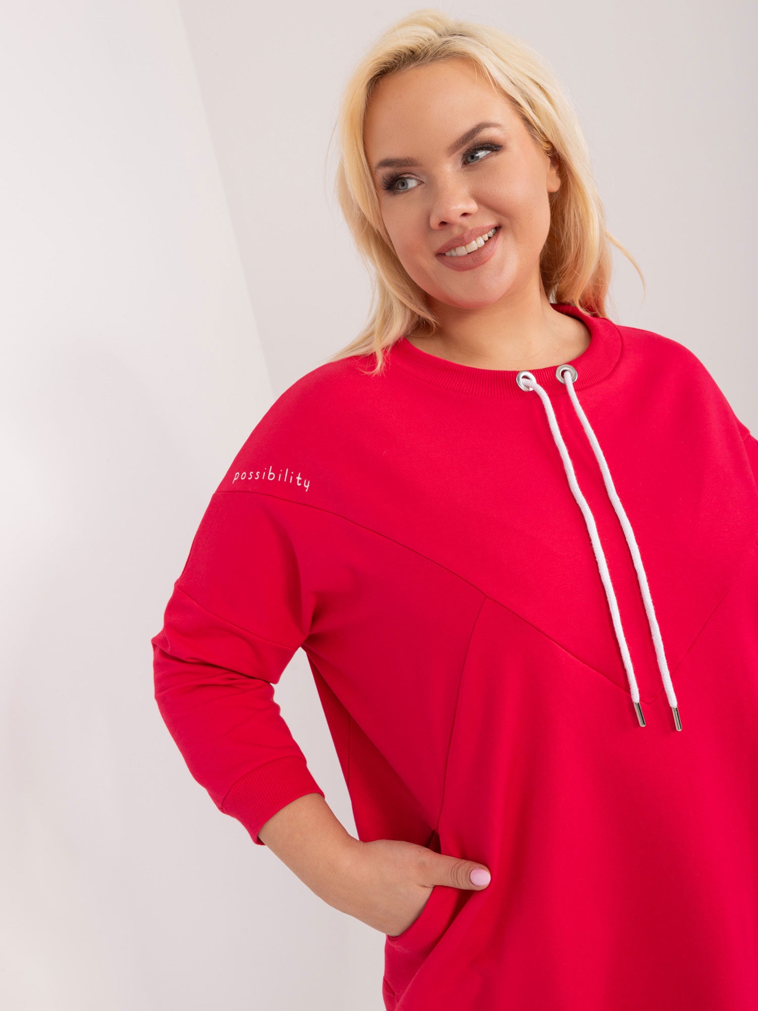 Modelka ma na sobie rozmiar one size. Wymiary modelki: wzrost 172 cm, biust 103 cm, talia 73 cm, biodra 103 cm.