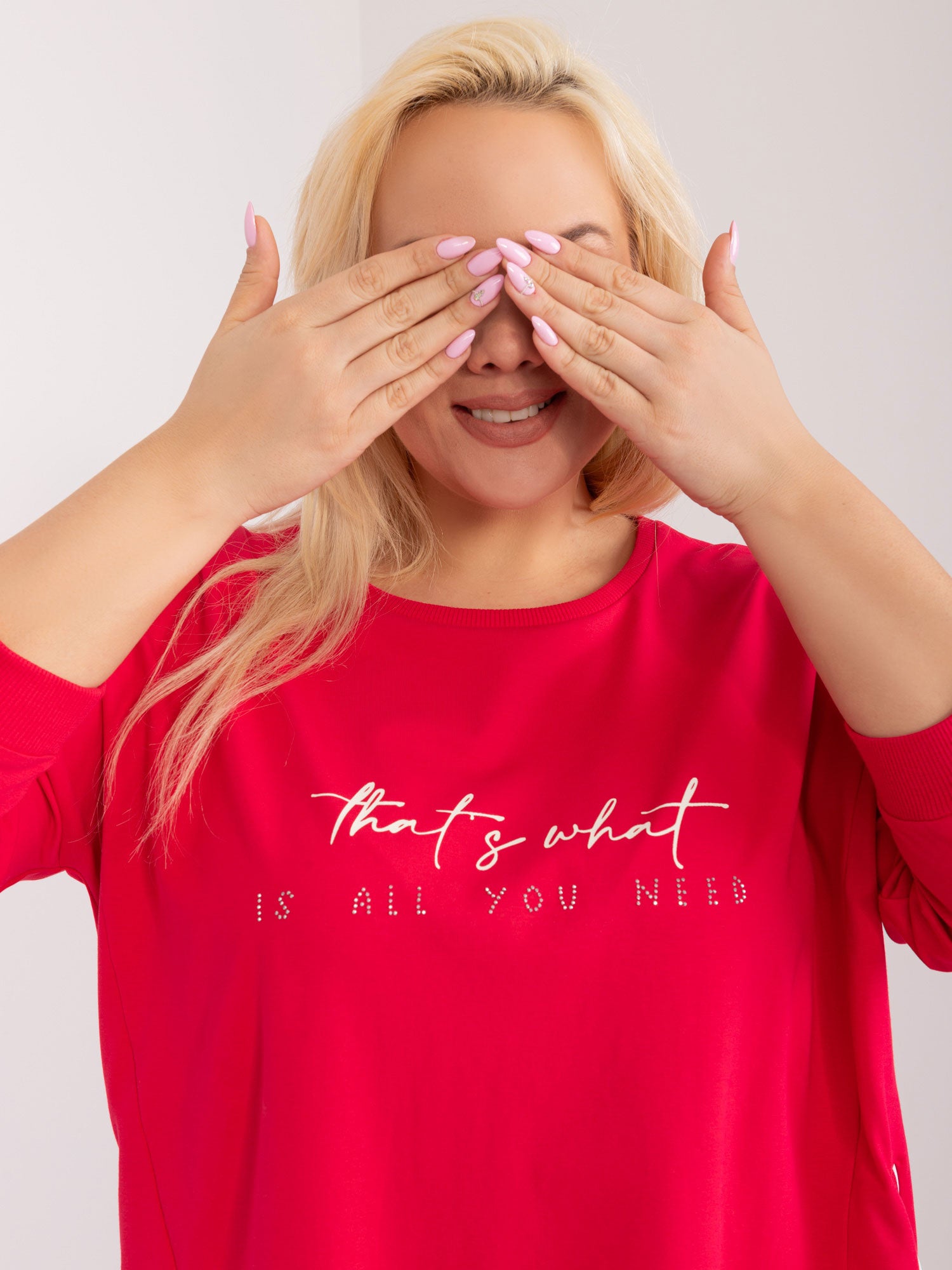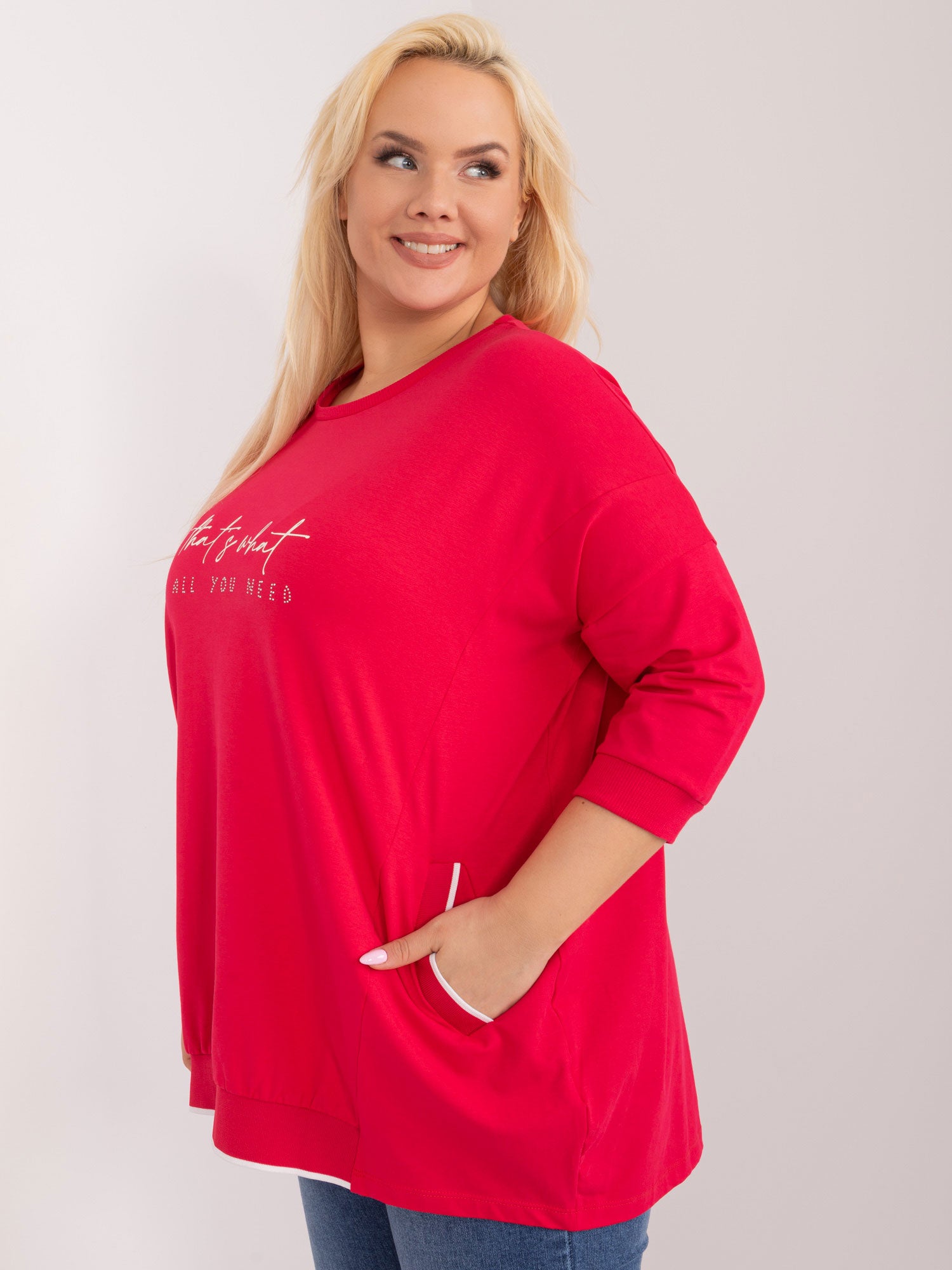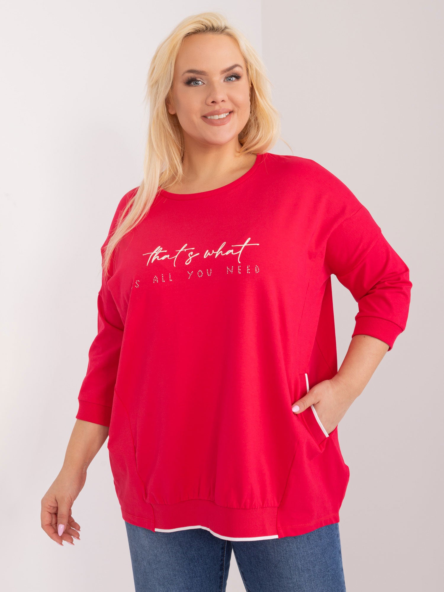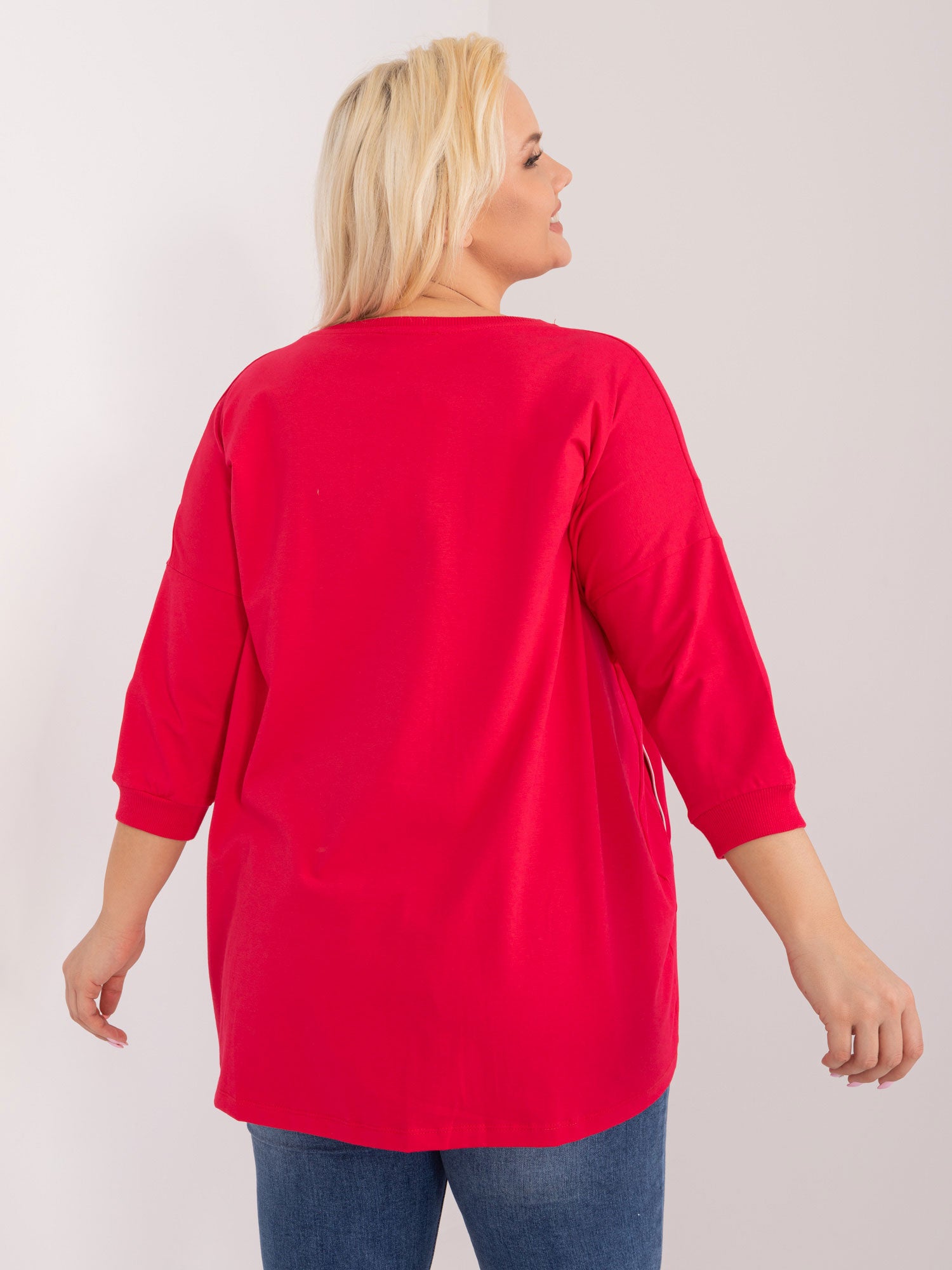 Wymiary bluzki w rozmiarze one size mierzone na płasko: szerokość pod pachami - 65 cm, długość rękawa - 38 cm, długość całkowita (przód) - 70 cm, długość całkowita (tył) - 75 cm .